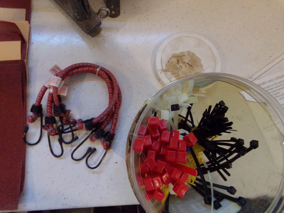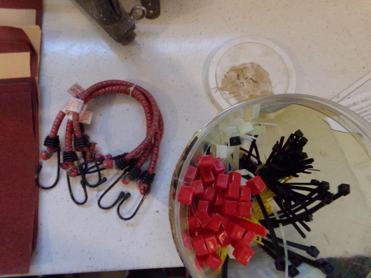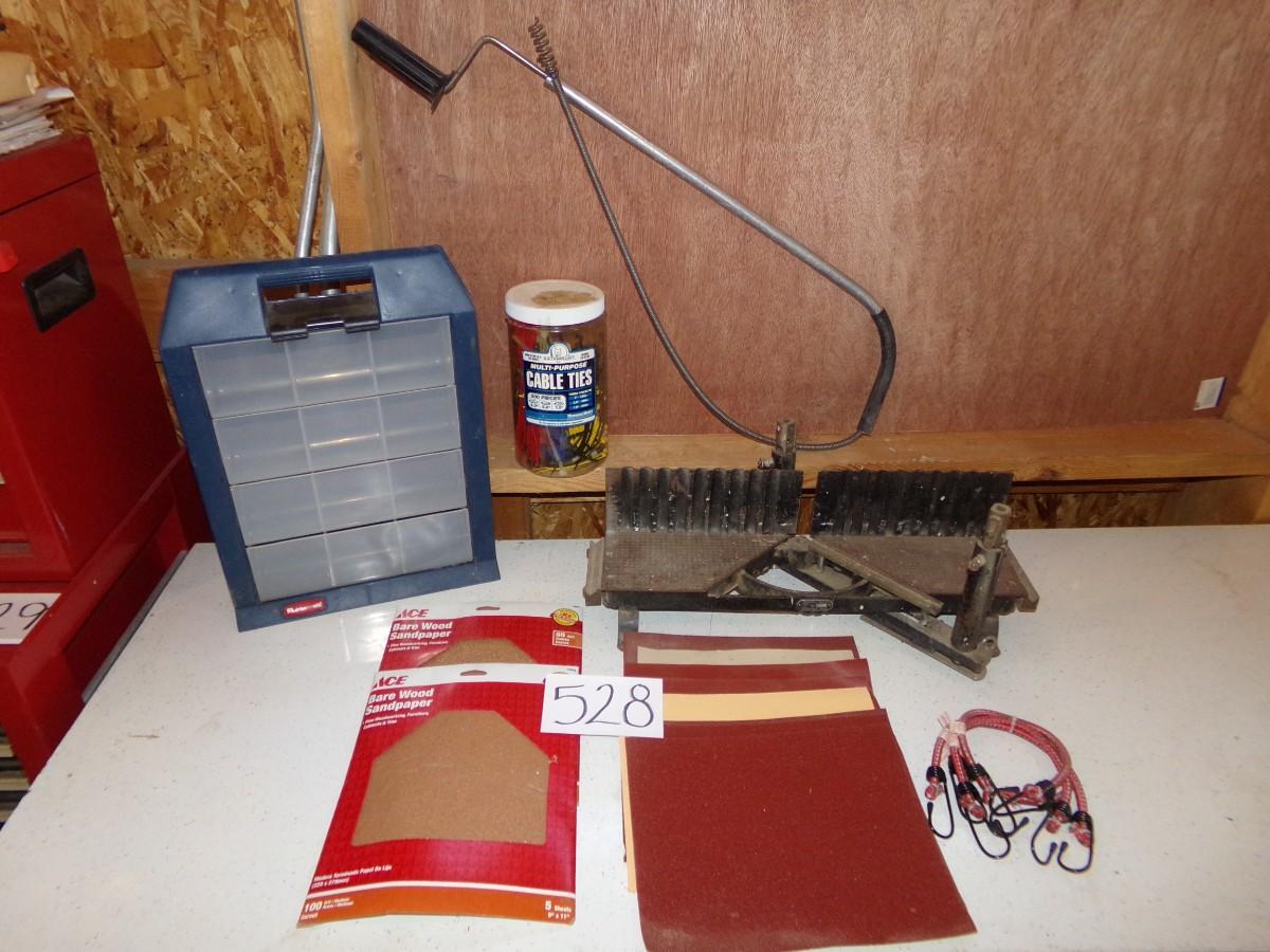 SAND PAPER, SMALL HARDWARE CASE, ZIP TIES, SMALL TIE DOWN CABLES, HAND HELD PLUMBING SNAKE AND SAW HOLDER.