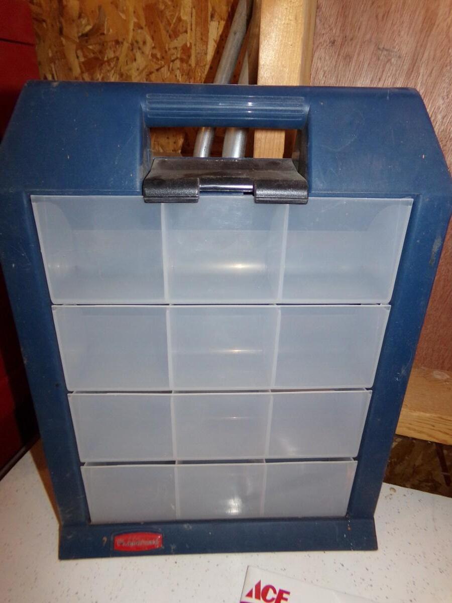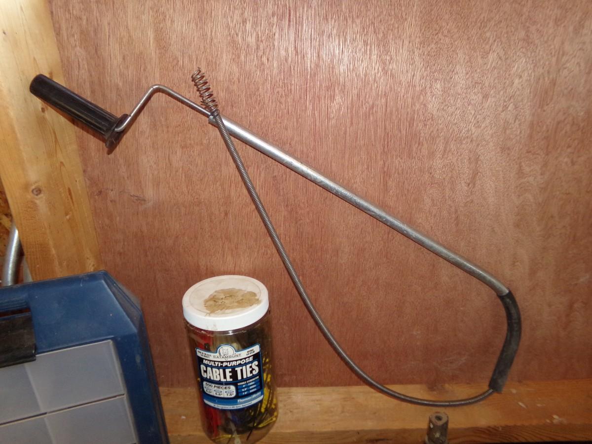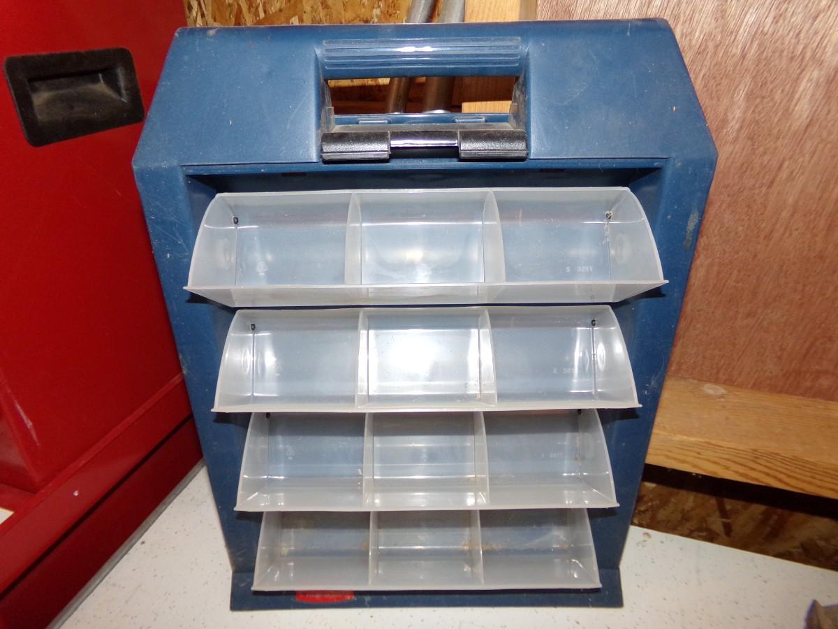 SAND PAPER, SMALL HARDWARE CASE, ZIP TIES, SMALL TIE DOWN CABLES, HAND HELD PLUMBING SNAKE AND SAW HOLDER.