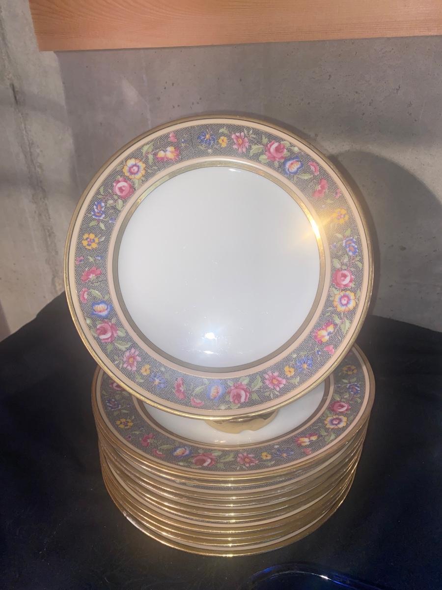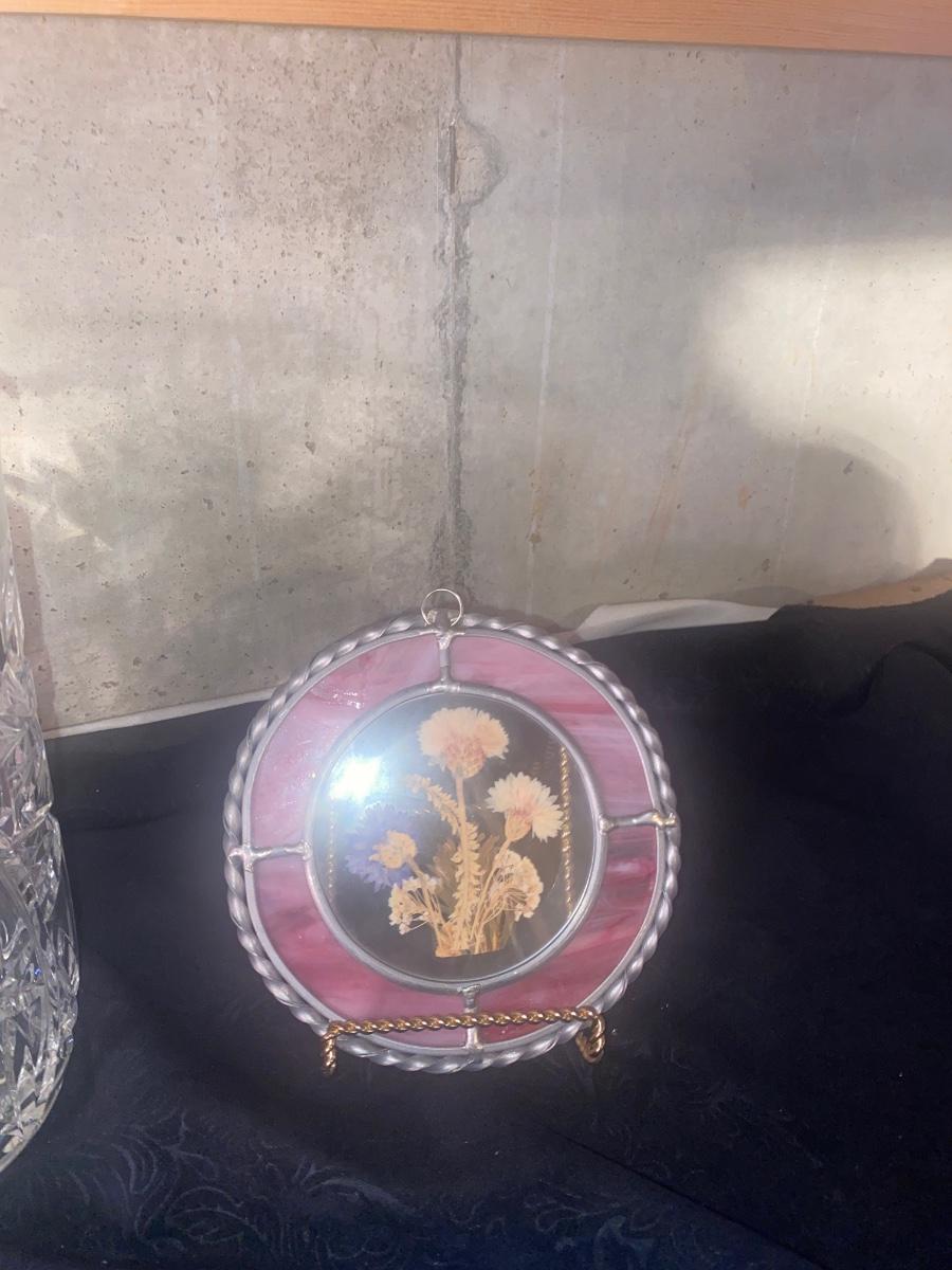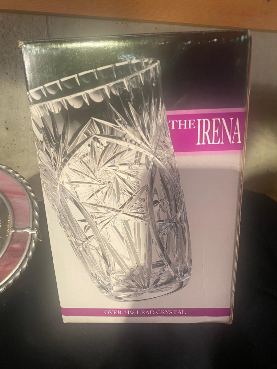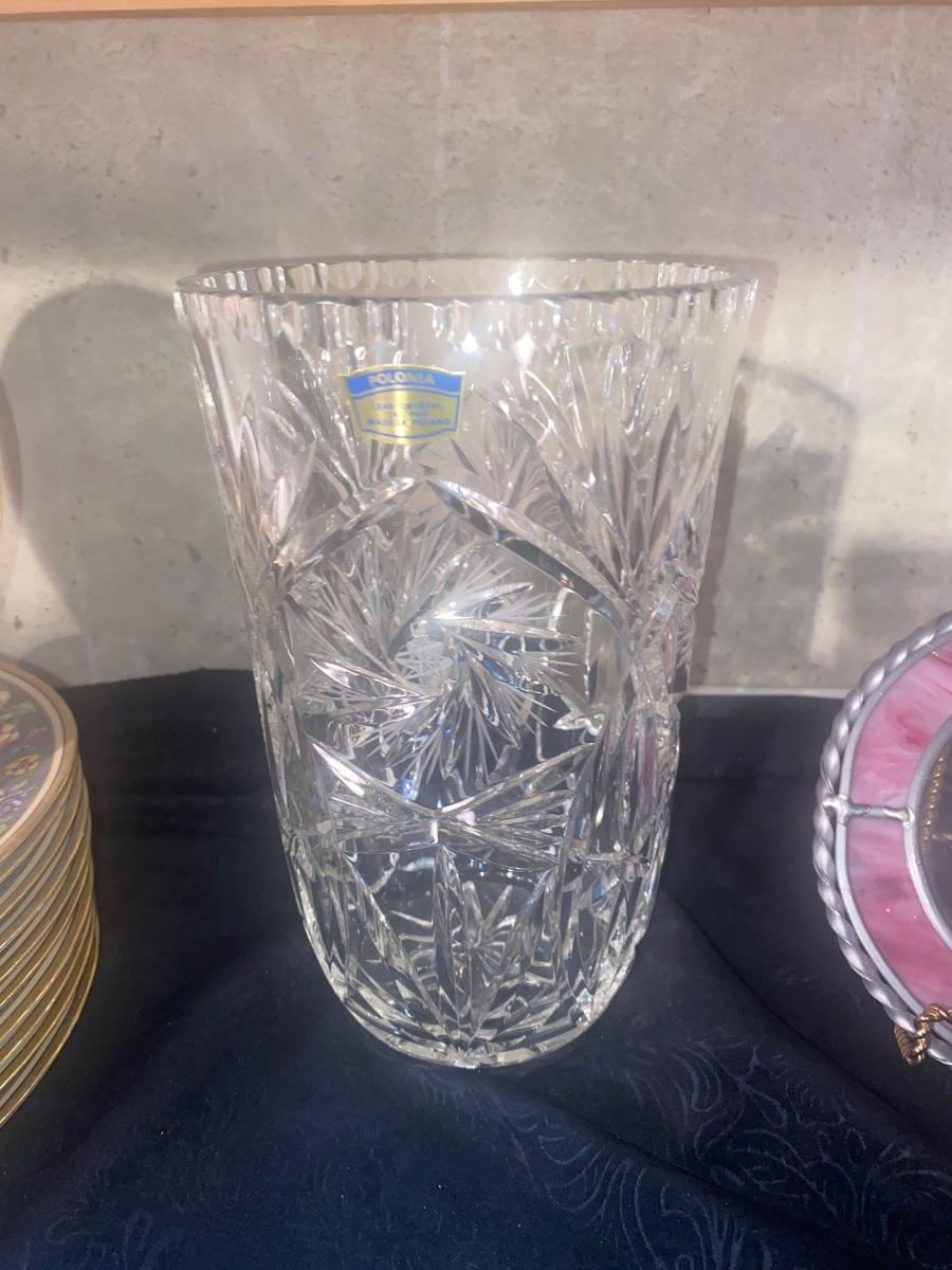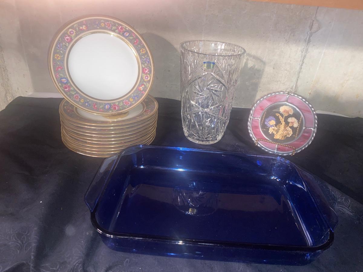 LEAD CRYSTAL VASE, BLUE GLASS BAKING DISH, GOLD RIMMED LUNCHEON PLATES AND STAINED GLASS