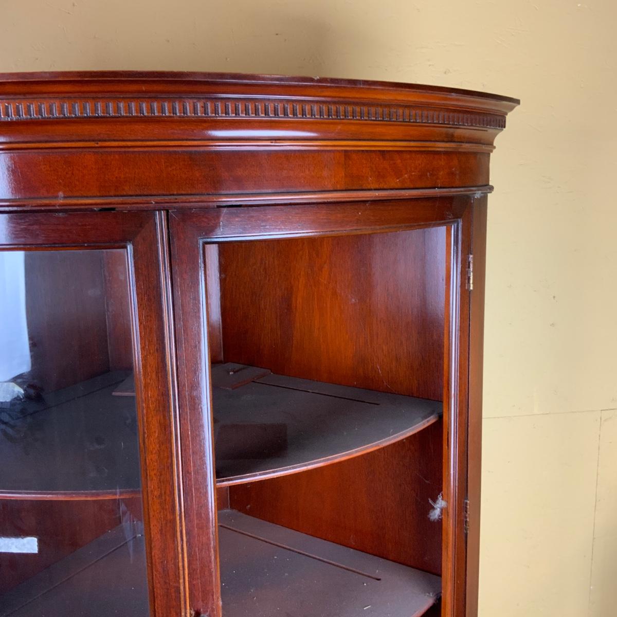 Mahogany Corner Cabinet. One of the doors needs the glass replaced. //::\\ Please see photos for details and condition. No attempt has been made to hide any imperfections. All items listed in this auction are warehouse items, and need to be cleaned. A majority of the items need restoration as well. All items are sold AS IS and WITHOUT GUARANTEE. If you are uncertain about an item, DO NOT BID. Due to the nature of this online auction in-person inspection is HIGHLY recommended. All Sales are FINAL. Pick Up Times are FIRM. Please confirm with your own schedule that you can pick up in the scheduled times listed in the Terms and Conditions. Any questions please message the auctioneer. DO NOT Contact The Harp Gallery.