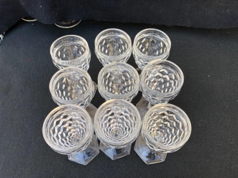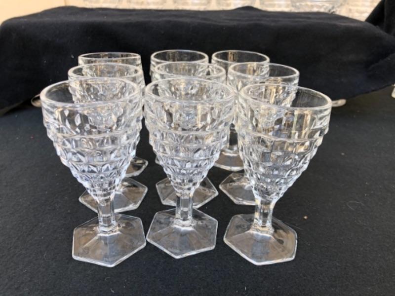 Lot 52L. Fostoria American Stemware, 12 Sherry/Cordial Glasses with hexagonal bases “” $30