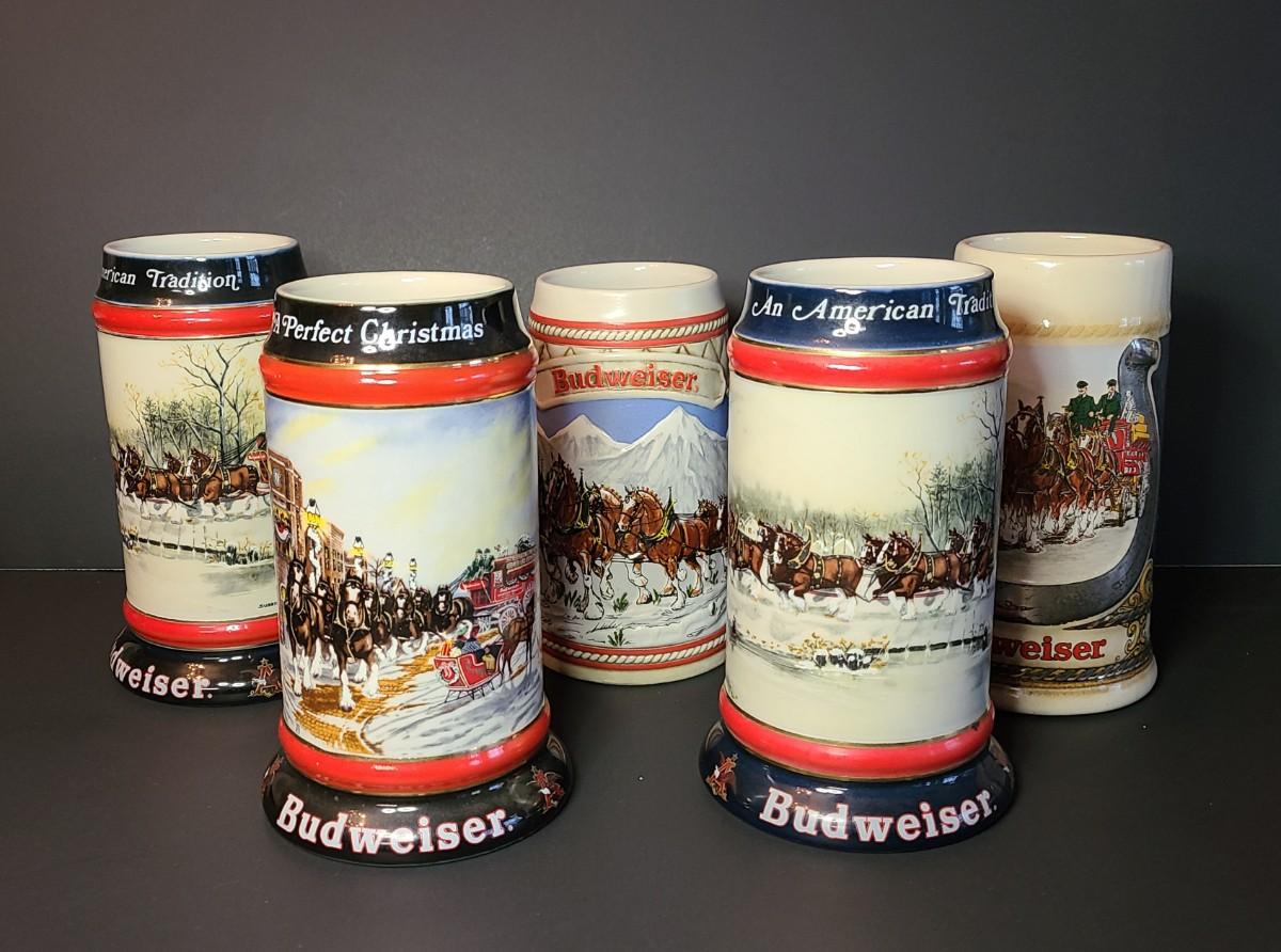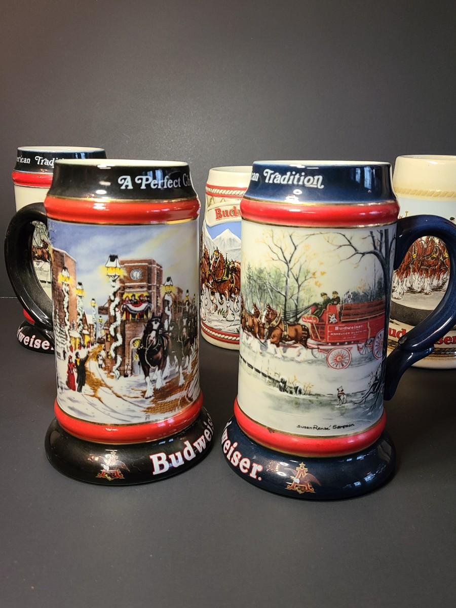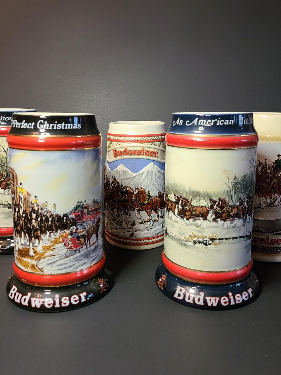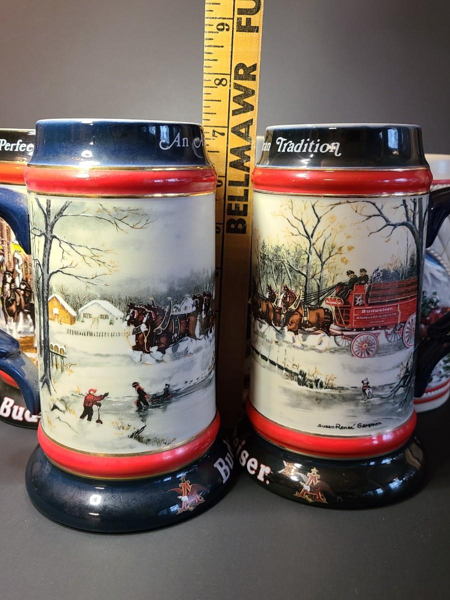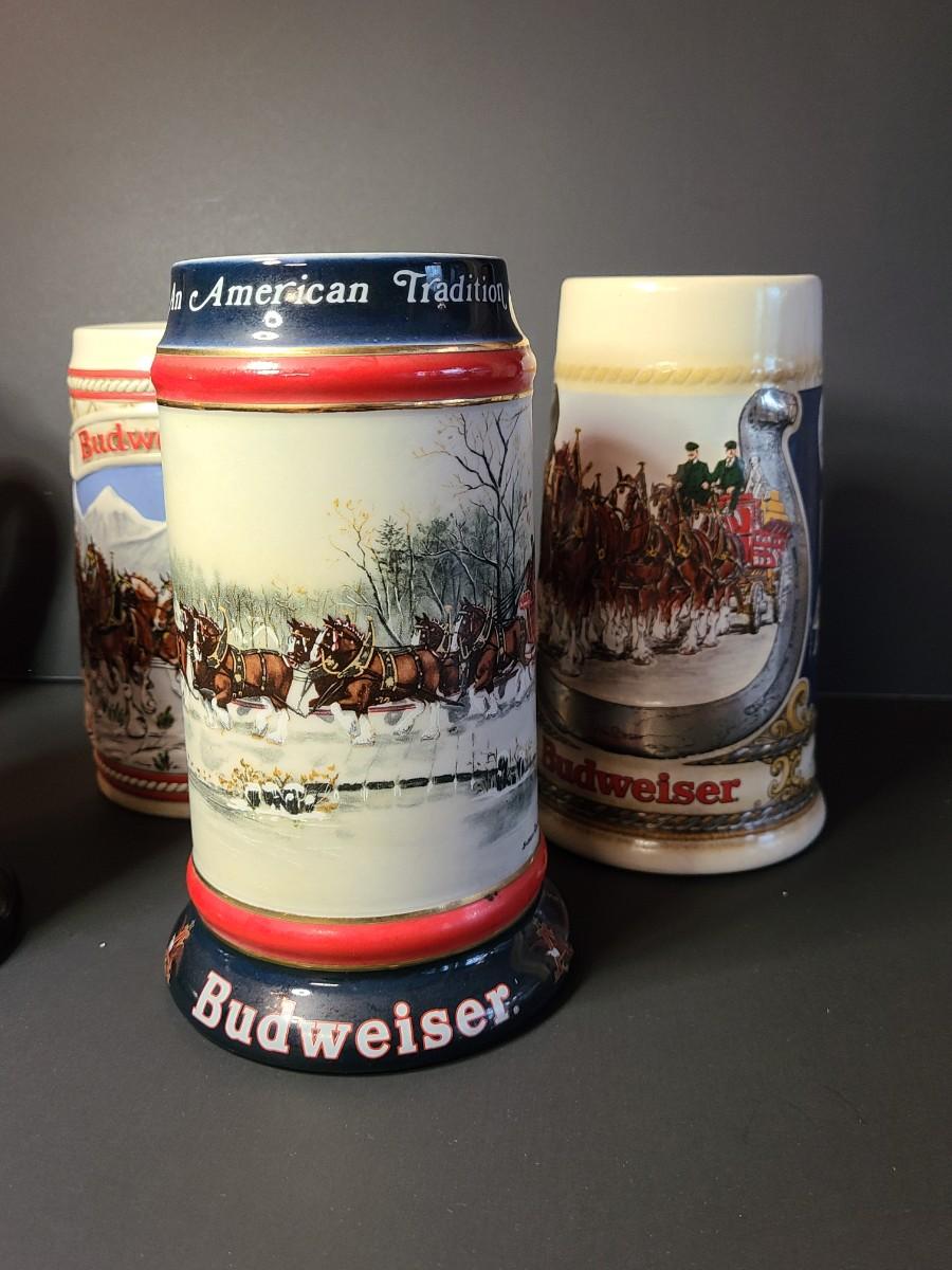 Budweiser collectible steins. Pre-owned. Used as decor on shelf. Functional too!