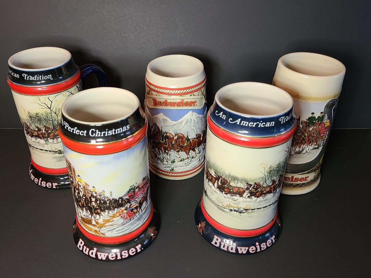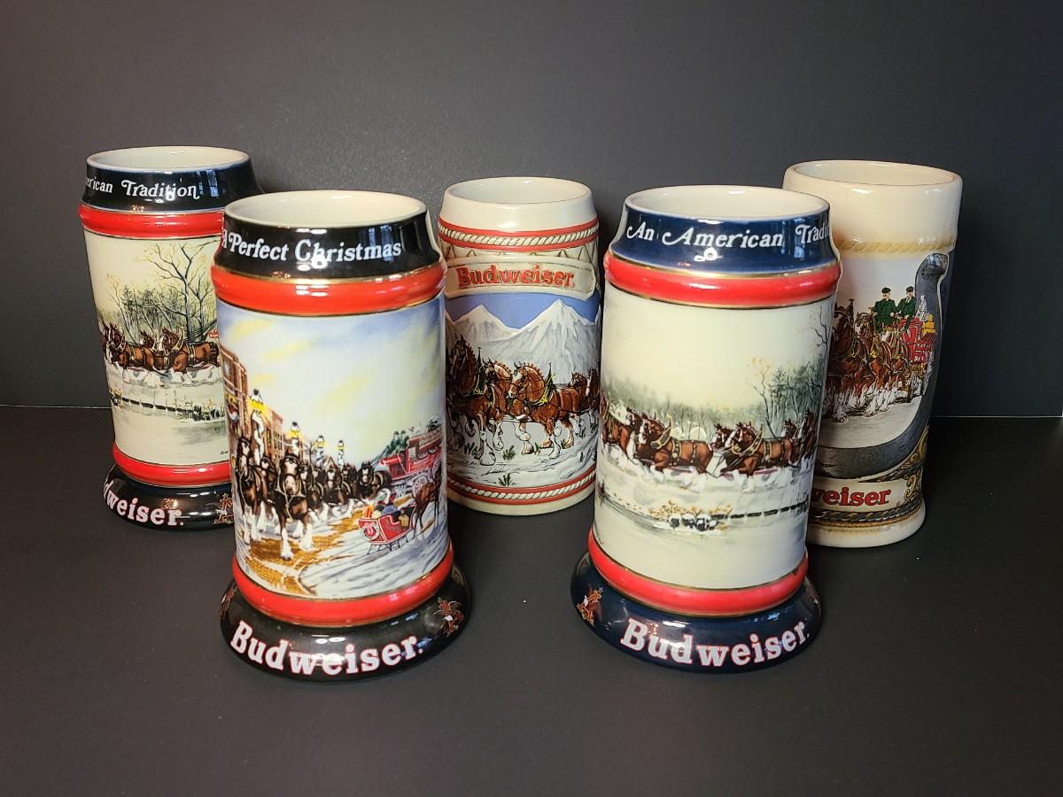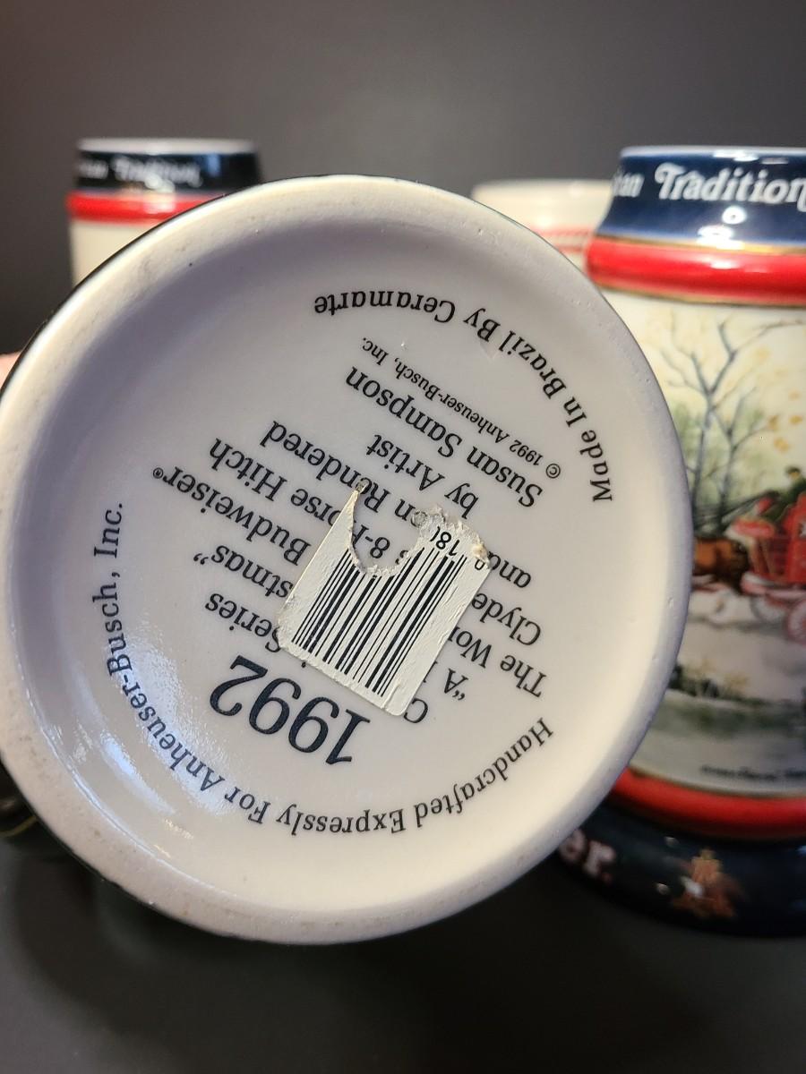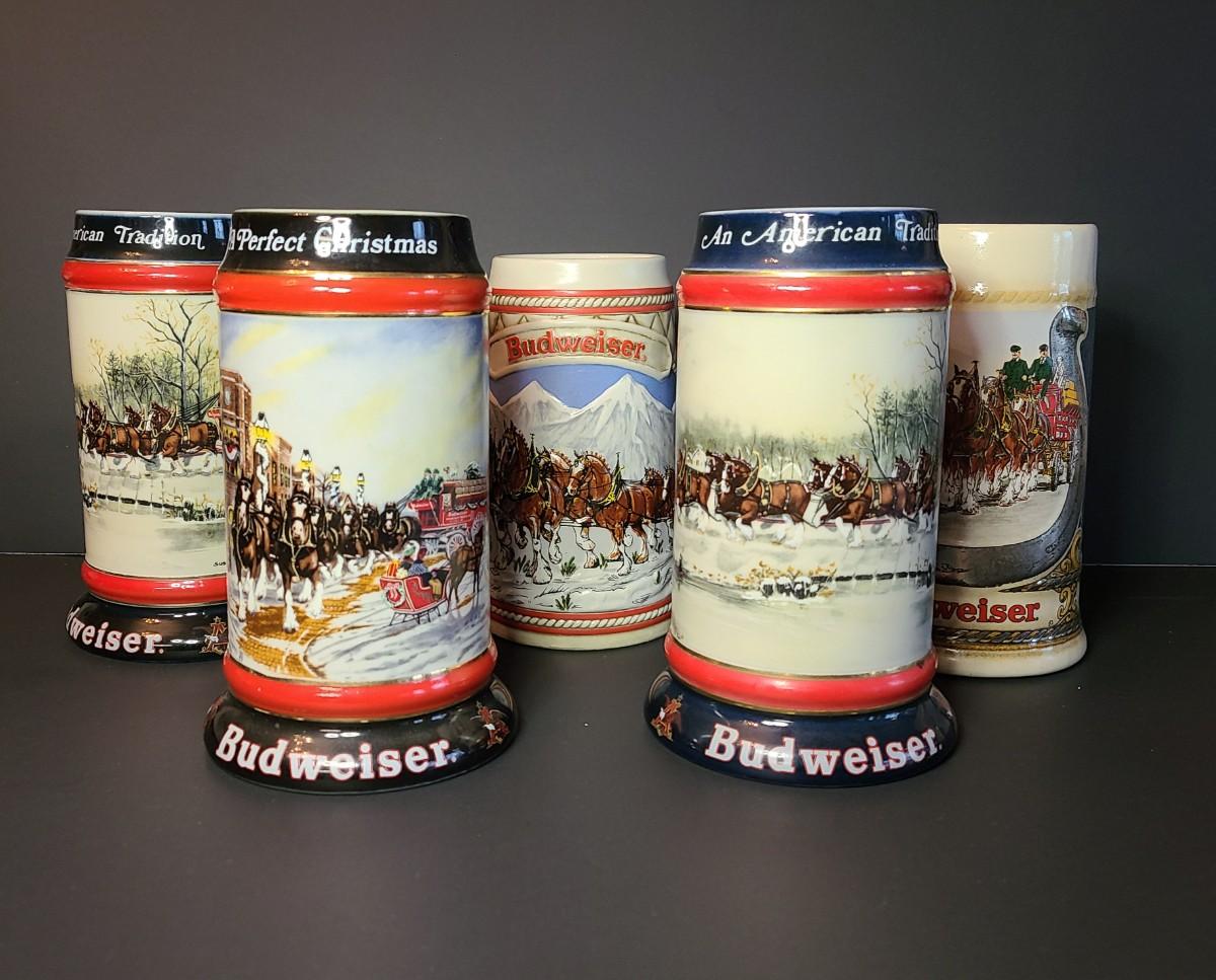 Budweiser collectible steins. Pre-owned. Used as decor on shelf. Functional too!