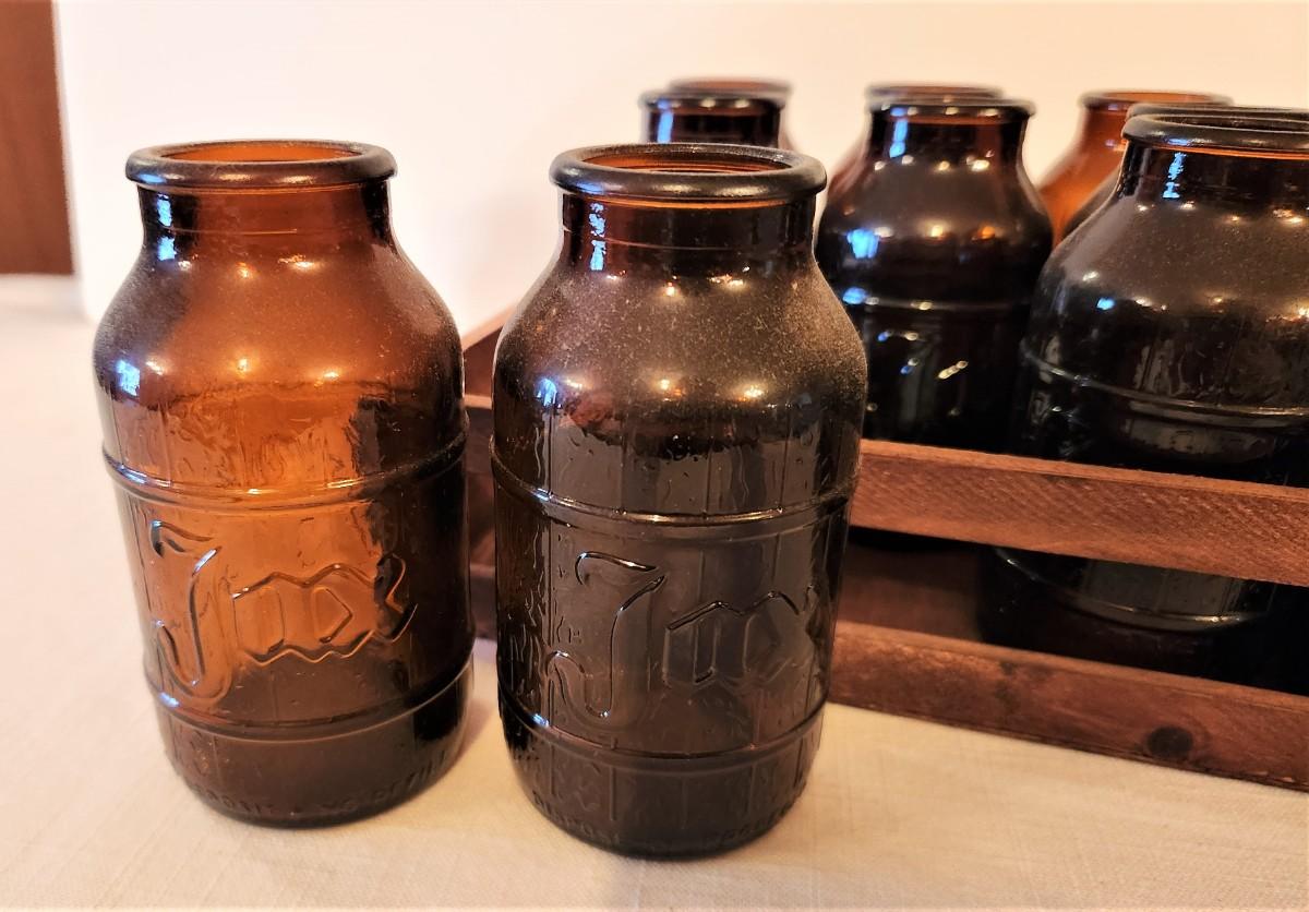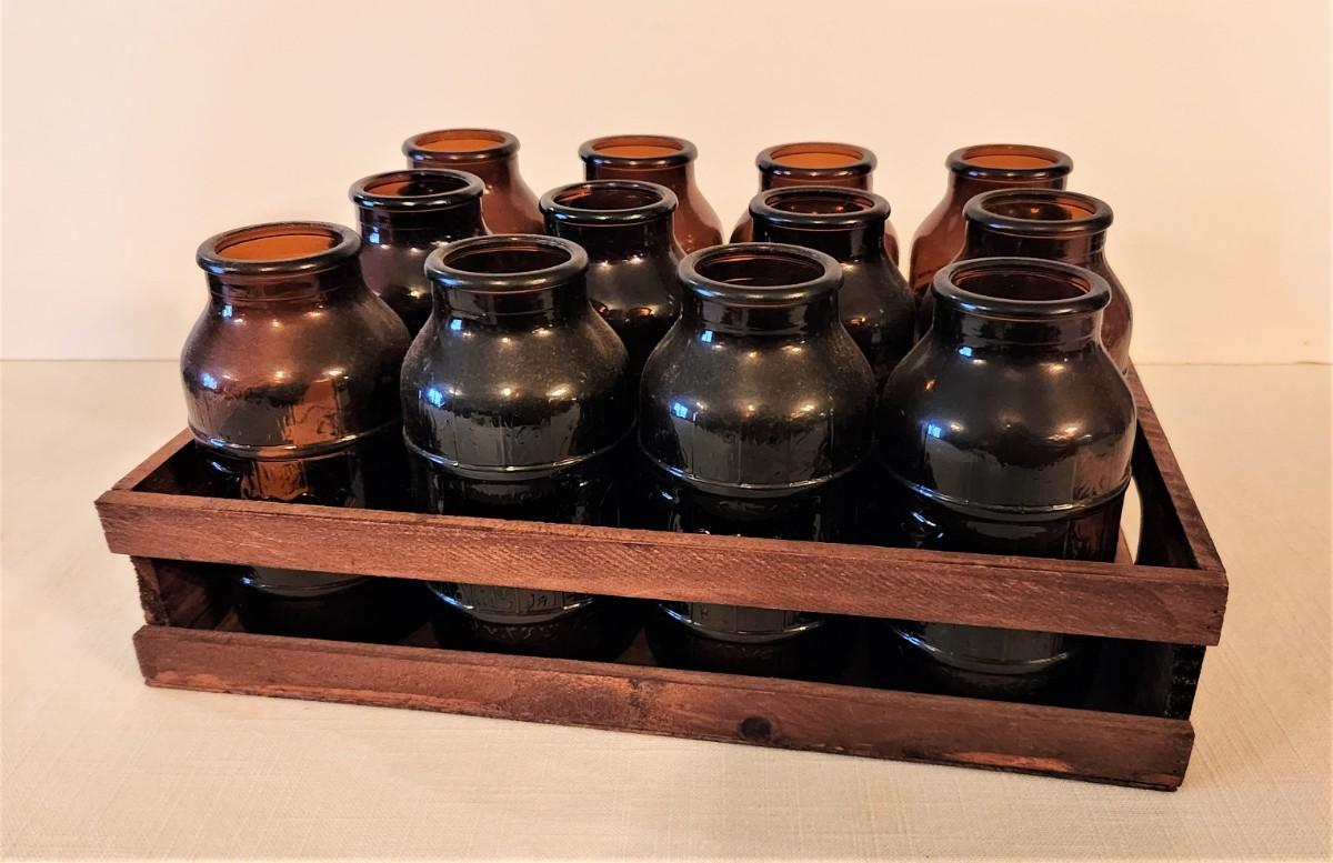 Lot of 1 dozen vintage JAX glass Beer bottles in wooden crate, each stands 4.5" tall, good vintage condition.