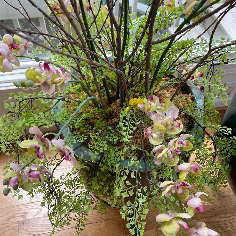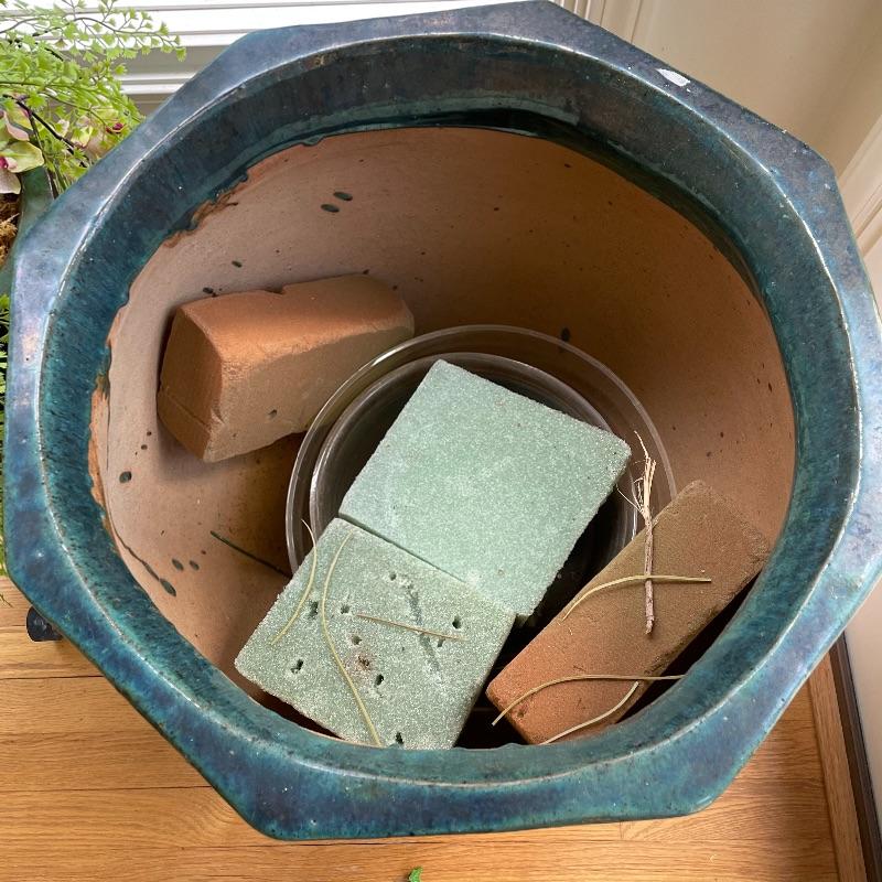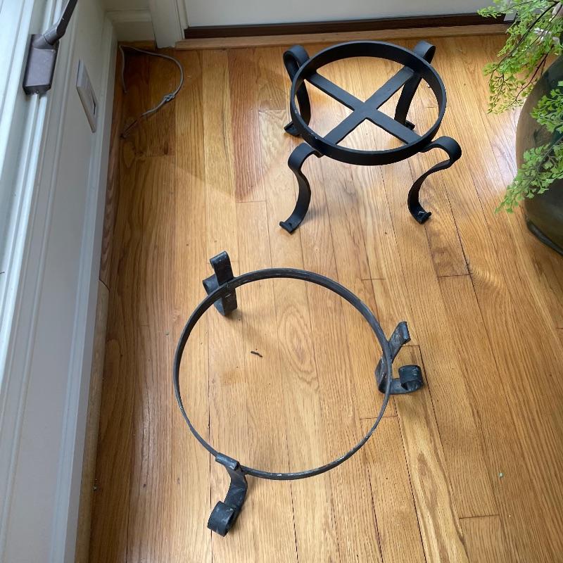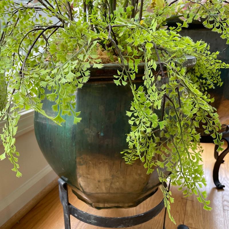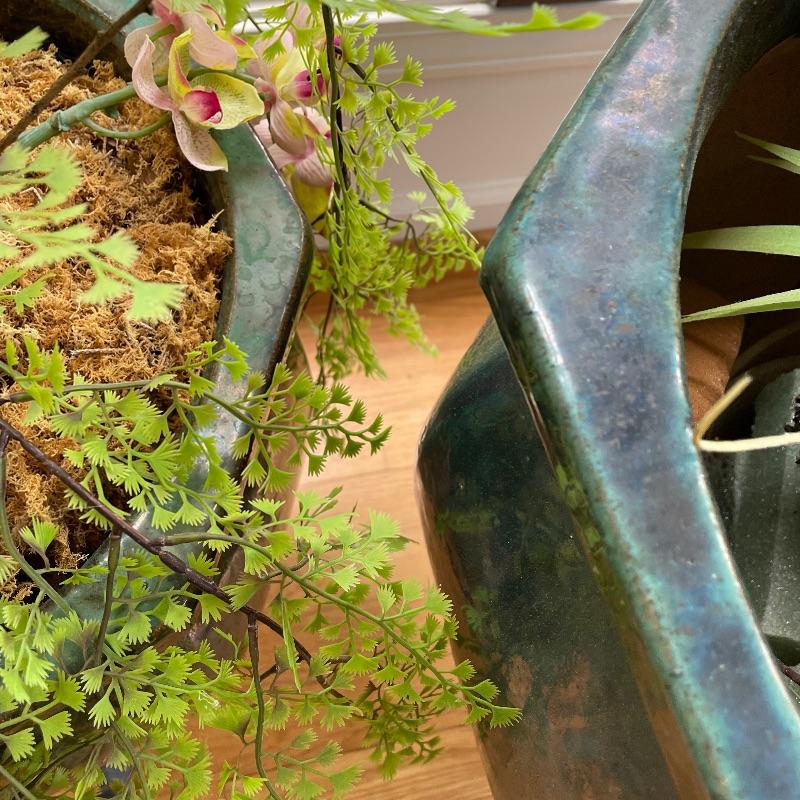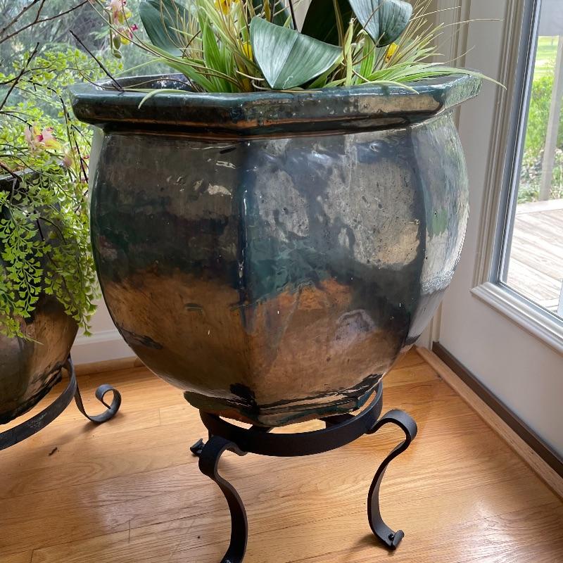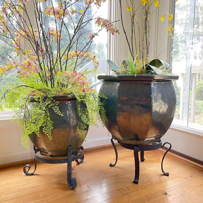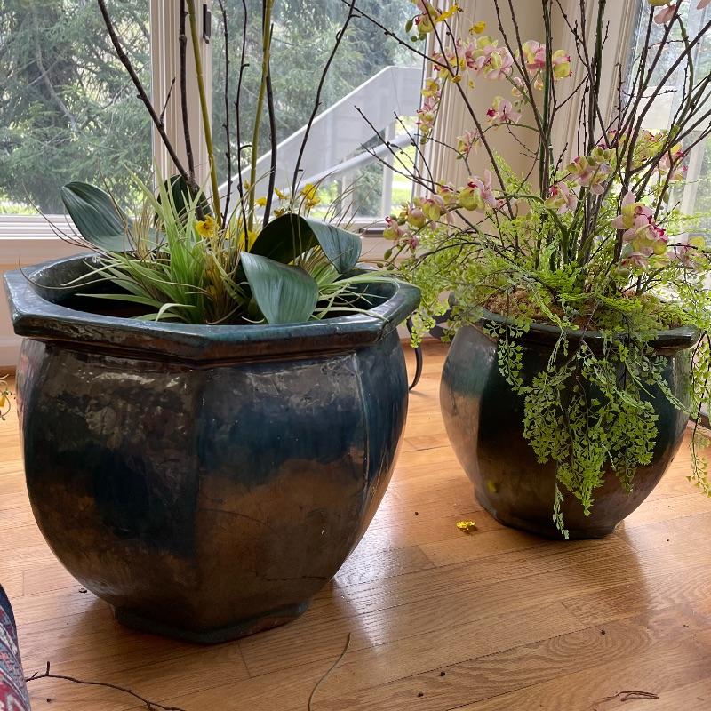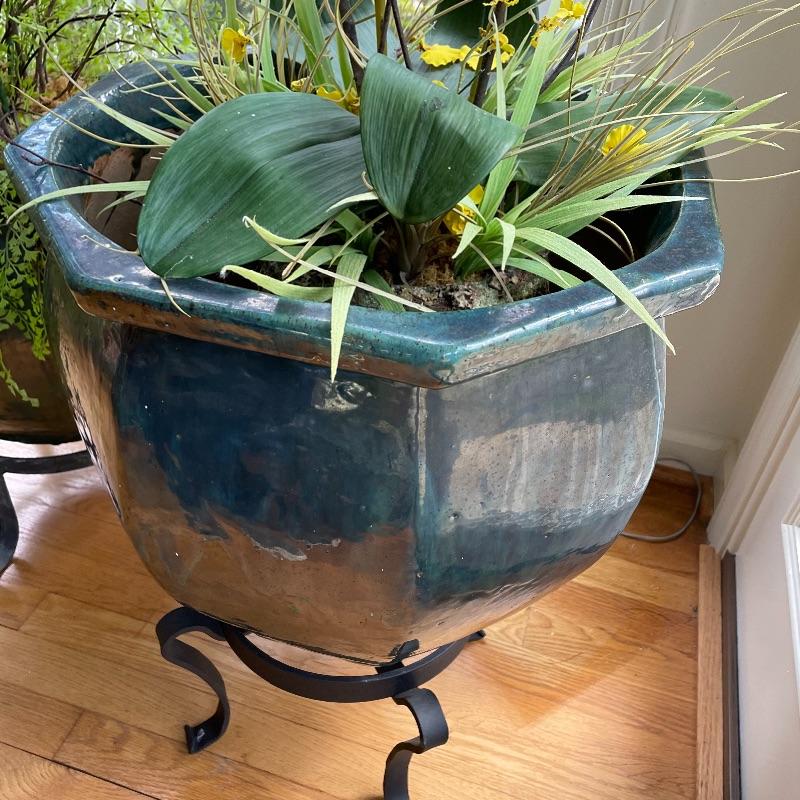 Two attractive ceramic with metal stands and pretty faux floral. These beauties are made for all weather and can be repurposed for living plants or keep as is for permanent blooms. The larger planter is about 18”d x 16” without its 8.5” stand. See photos. Local pick up only.
