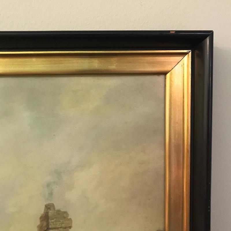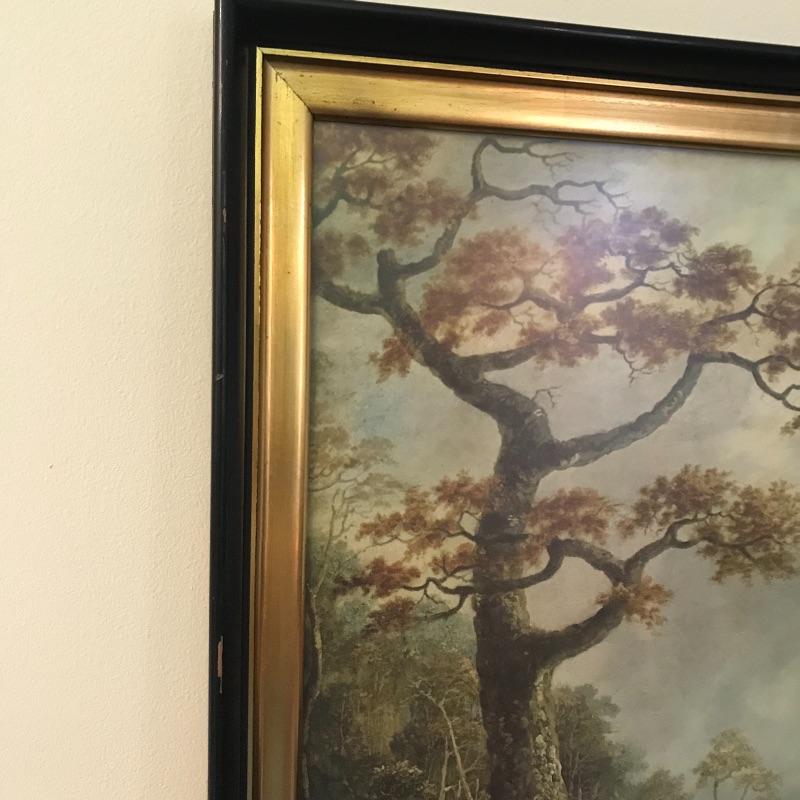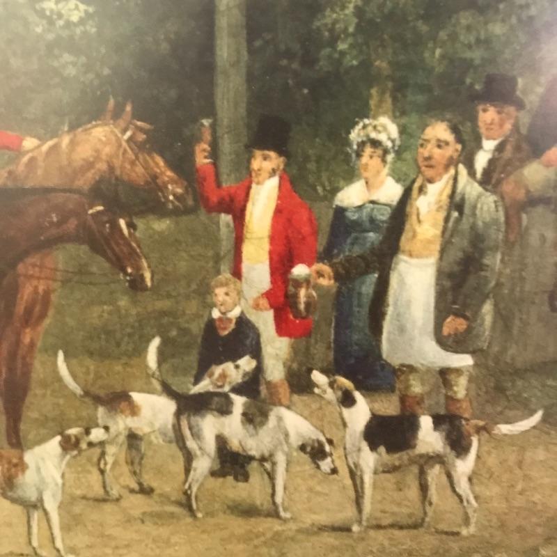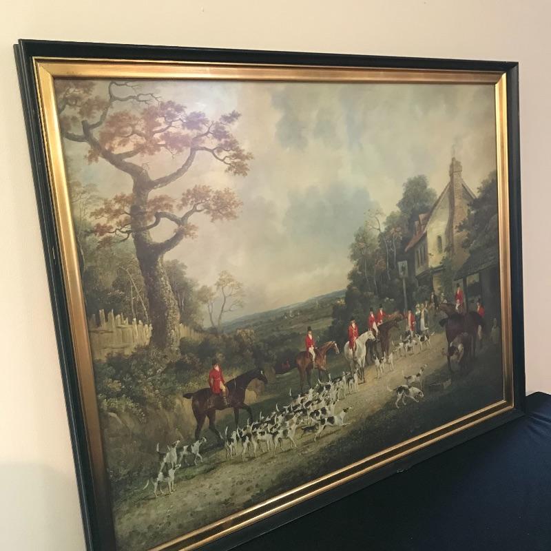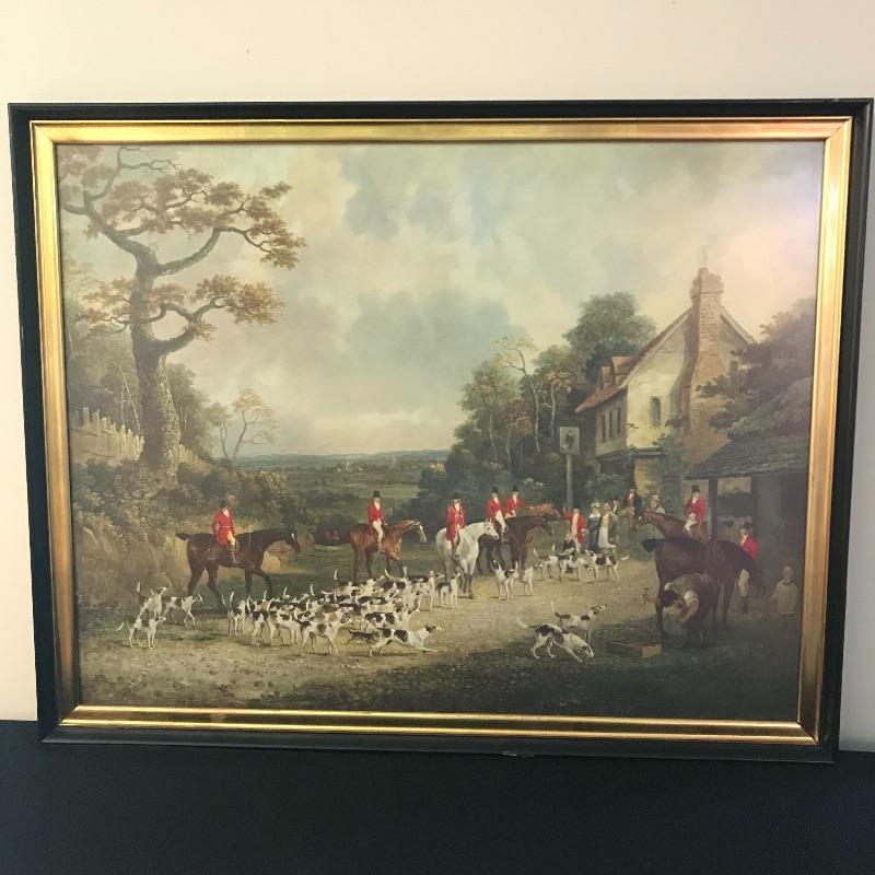 This stunning large print is titled Essex Hunt Near Epping by English artist Dean Wolstenholme. It is set behind a low glare plexiglass The large gold and black wooden frame measures 34.5” x 27.5” and has some blemishes that could easily be touched up, see images.