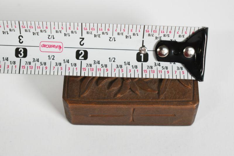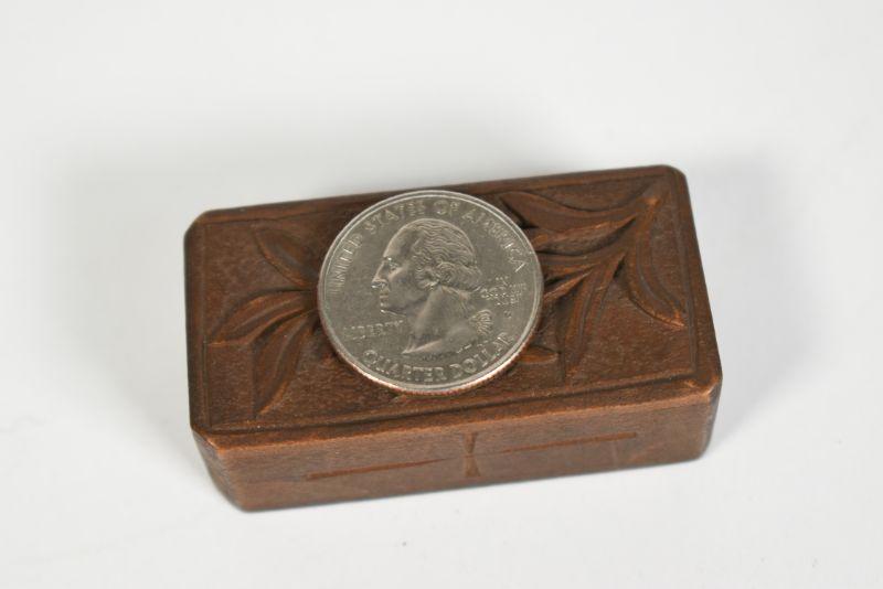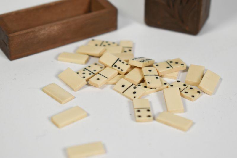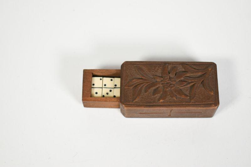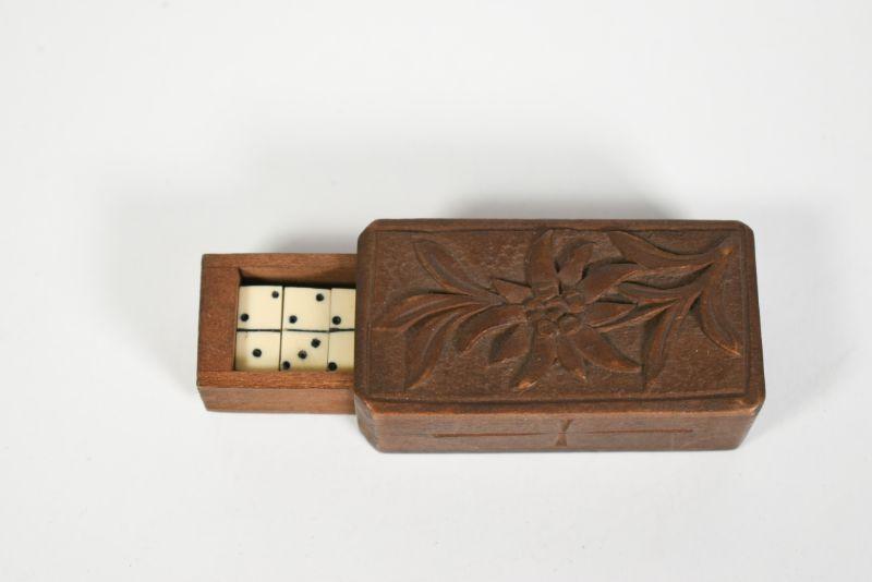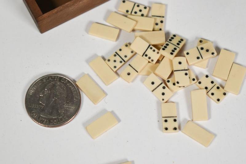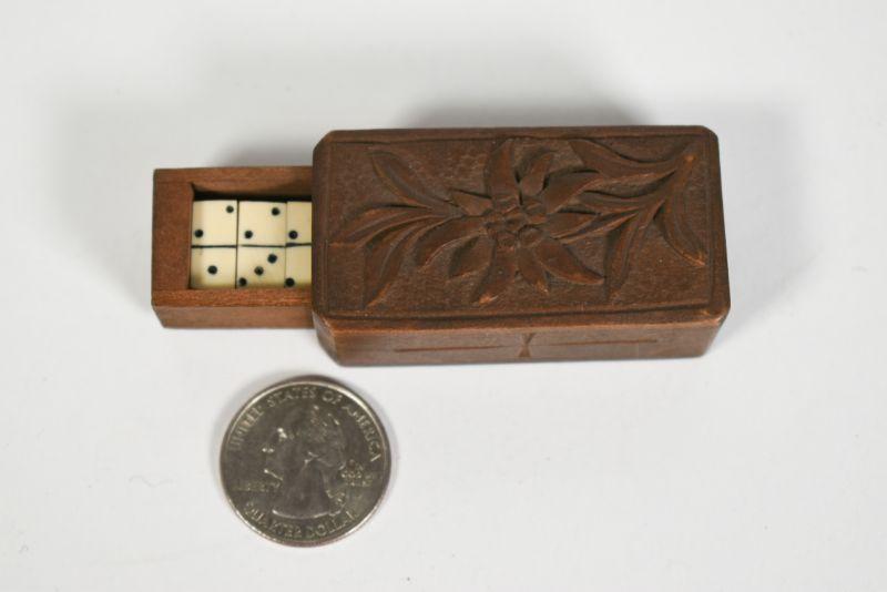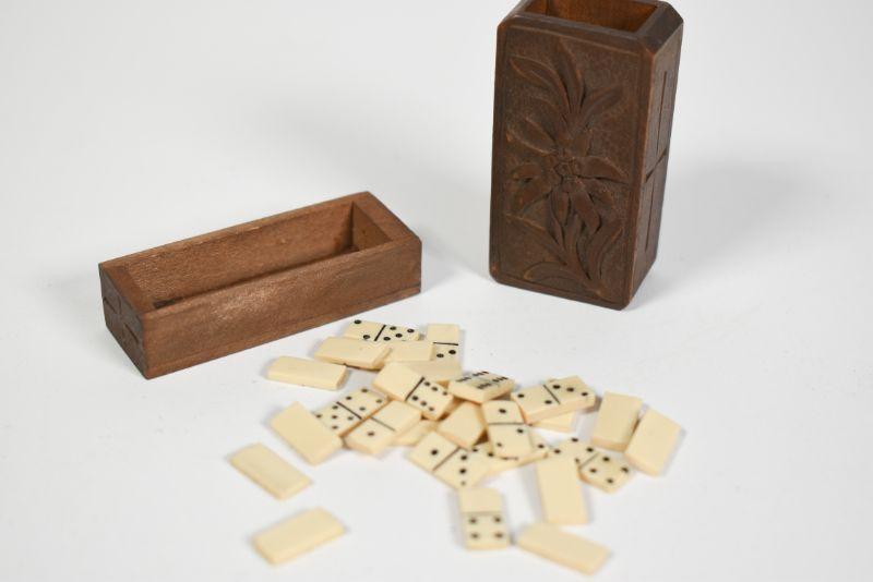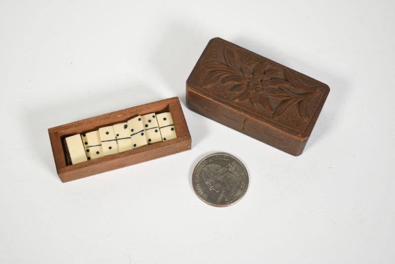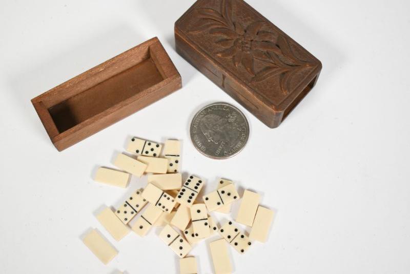 Antique dominoes with carved wooden box. The box is about 1" by 2". All pieces are there. **Please read Terms and Conditions before placing a bid. Pick up is Sunday, December 22 from 11am to 3pm or Monday, December 23 from 4pm-7pm in Mantua, NJ. All sales are final. All sales are as is, where is. Please review all photos. Props are not included. Measurements are approximate.