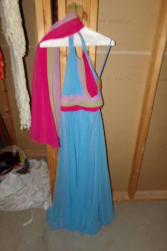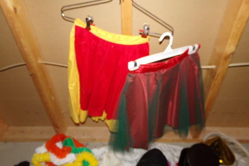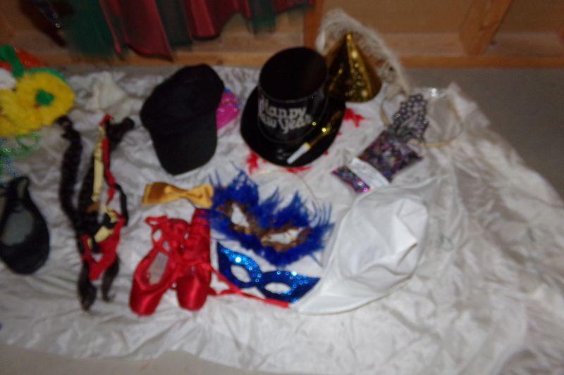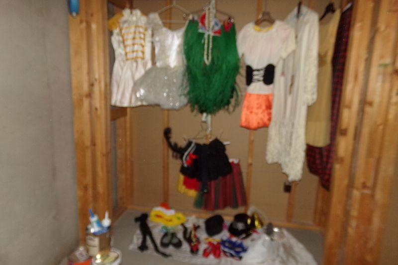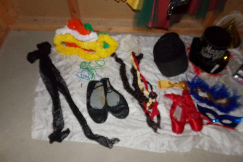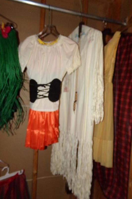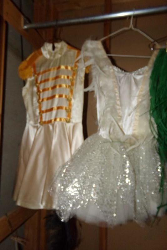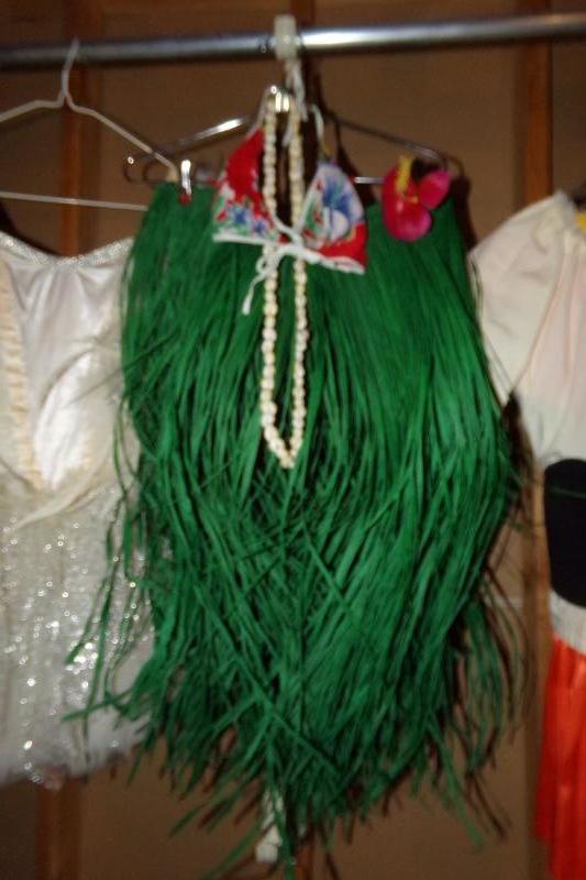 HAWAIIAN GRASS SKIRT W TOP, BALLERINA WITH 1 RED PAIR AND 1 BLACK PAIR OF BALLET SLIPPERS, COUPLE OF RETRO PROM DRESSES AND MUCH MORE