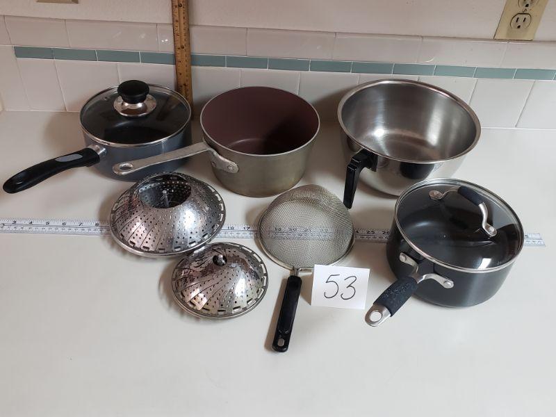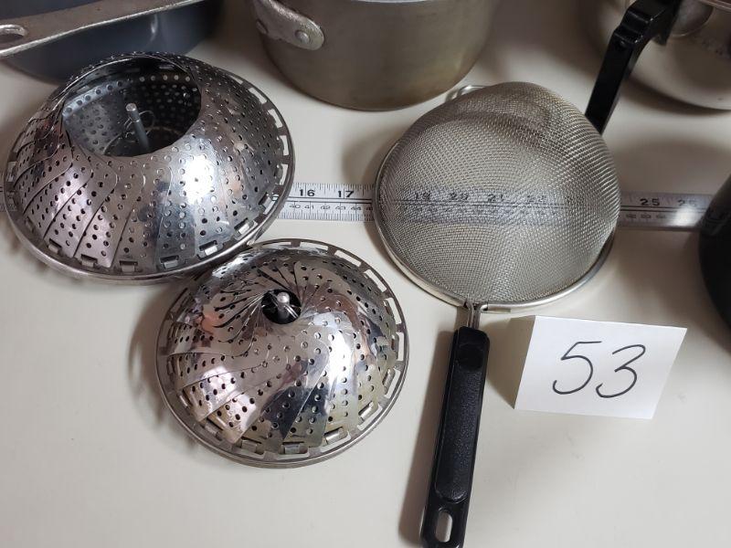 Lot 53: Mix of Pots, Steamer Baskets and a Strainer