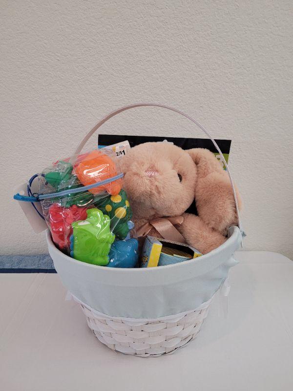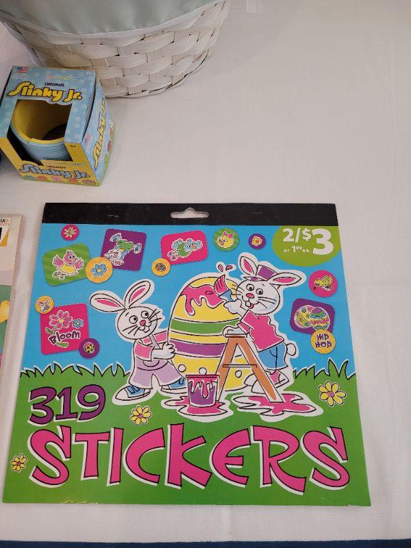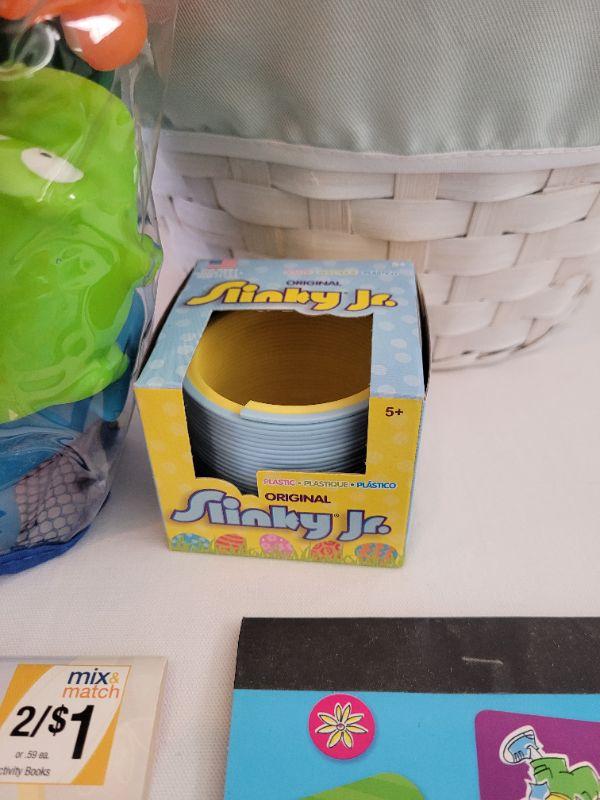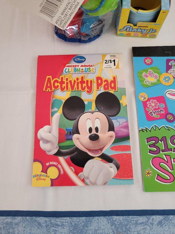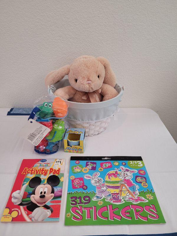 Lot 53: New Easter Basket with Plush Bunny, Mickey Activity Pad, Stickers, Slinky and Bath Toys