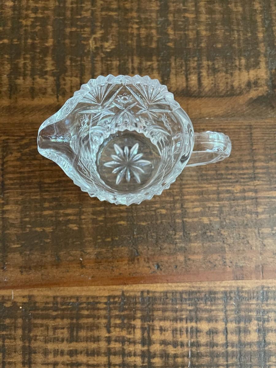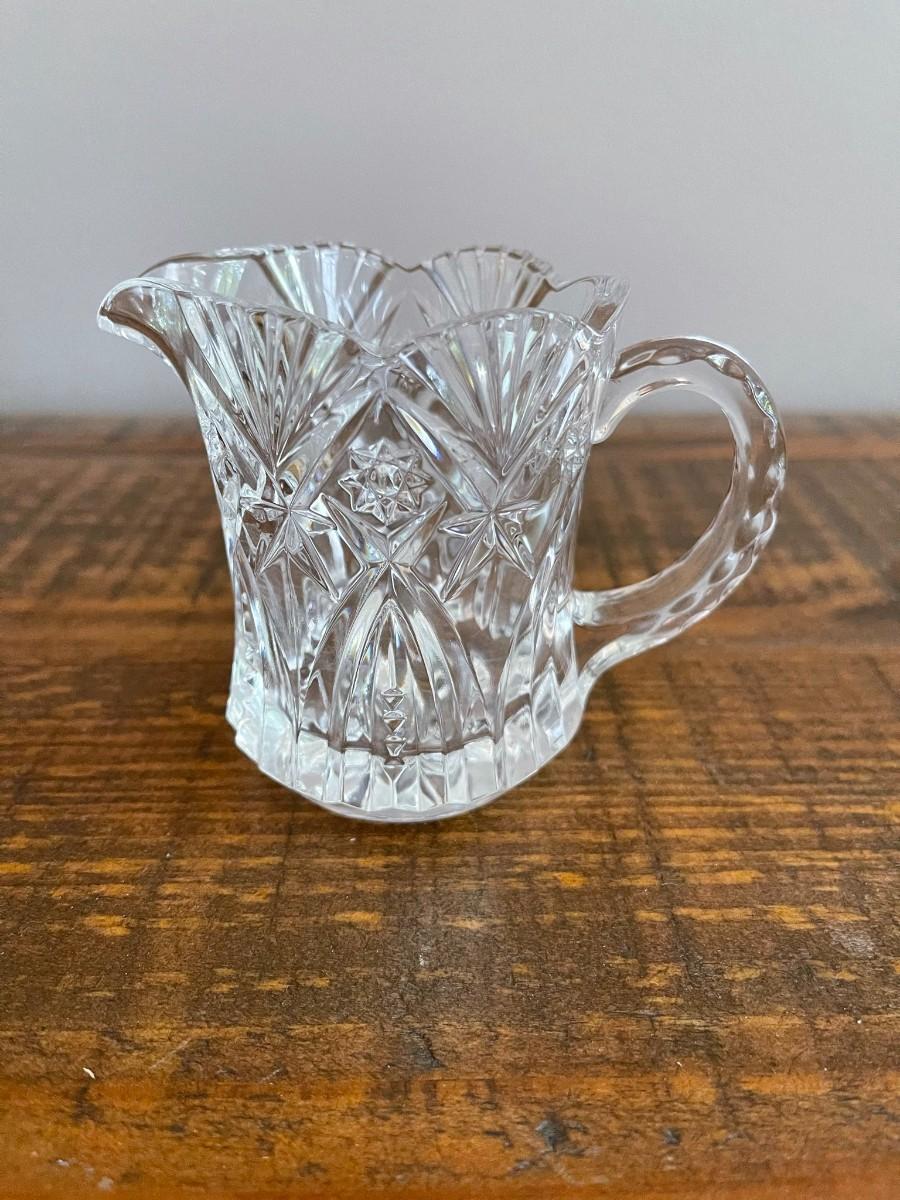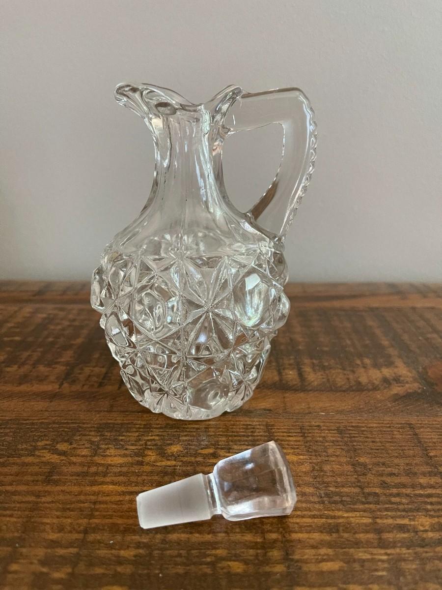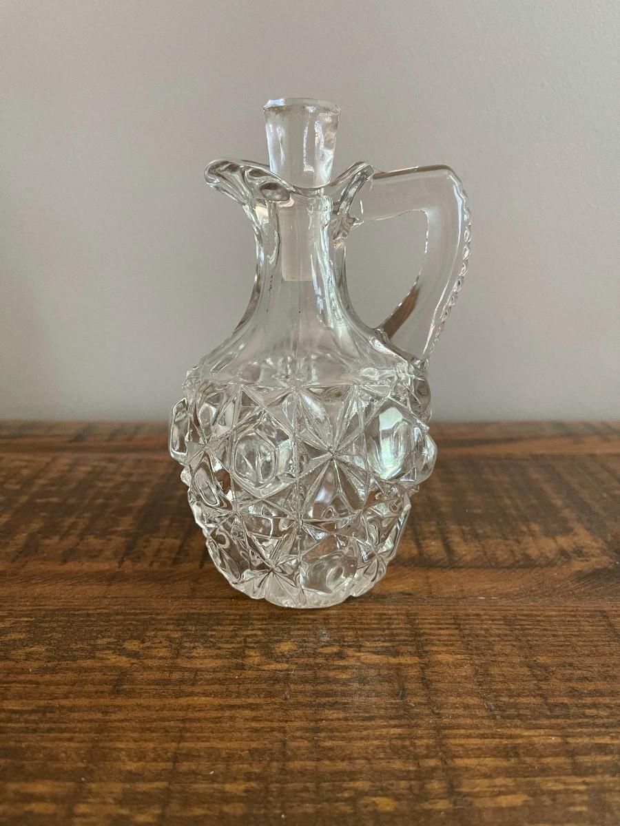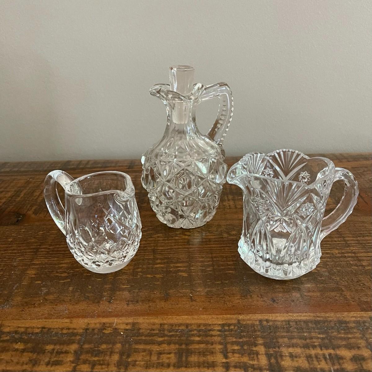 America Cut Glass Trio of Liquid Serving Vessels, Oil Cruet, Creamer and Small Pitcher. Cut with geometric patterns. Measure: Oil/Dressing Cruet, 6" H with top insert x 4" W x 3 1/4" D; Small Pitcher - 3 1/2" H x 4 1/4" W x 3" D; 3" H x 3 1/4" W x 2" D