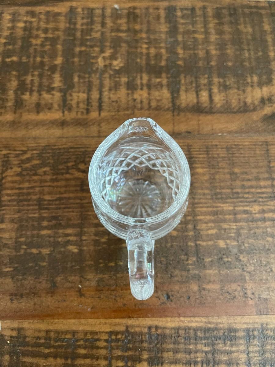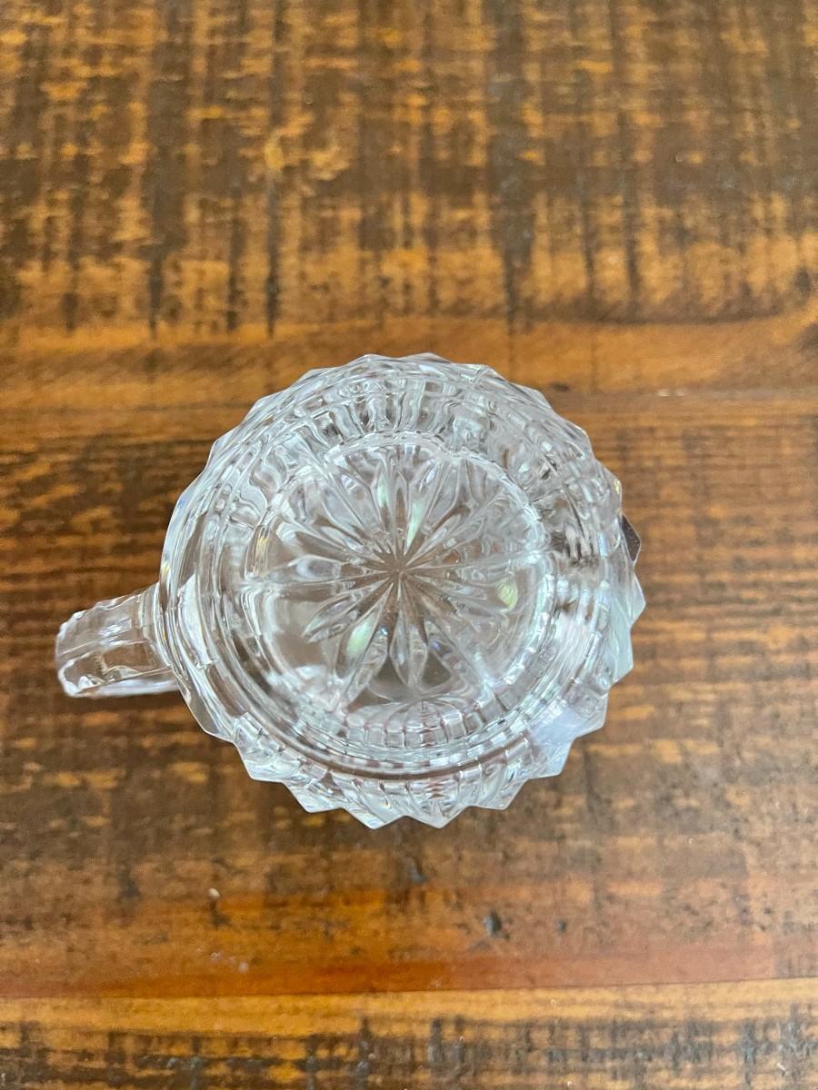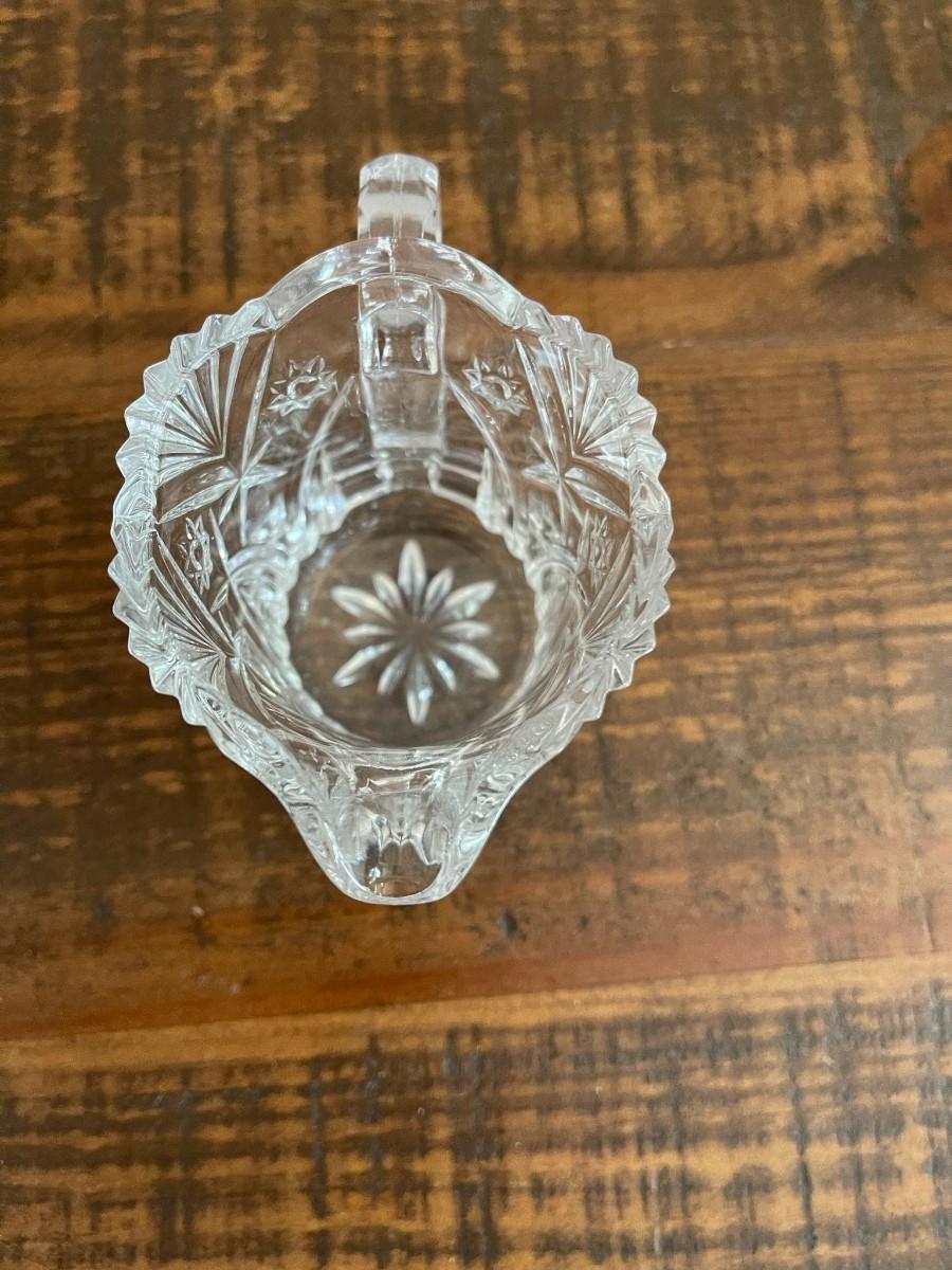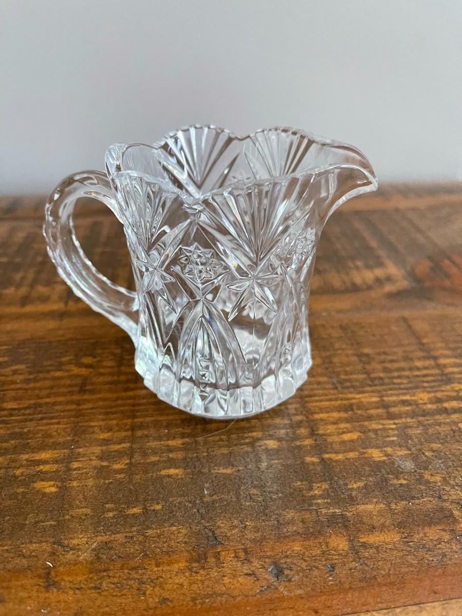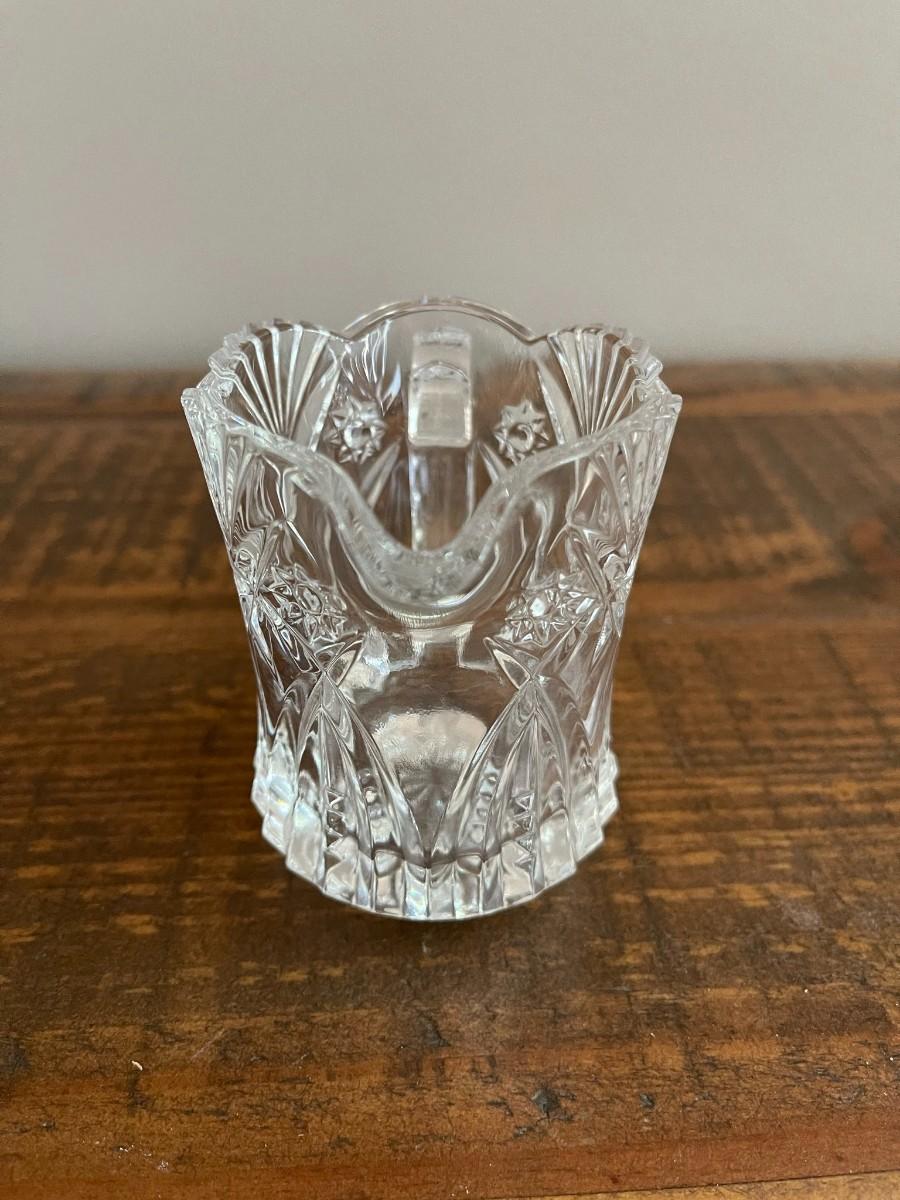 America Cut Glass Trio of Liquid Serving Vessels, Oil Cruet, Creamer and Small Pitcher. Cut with geometric patterns. Measure: Oil/Dressing Cruet, 6" H with top insert x 4" W x 3 1/4" D; Small Pitcher - 3 1/2" H x 4 1/4" W x 3" D; 3" H x 3 1/4" W x 2" D