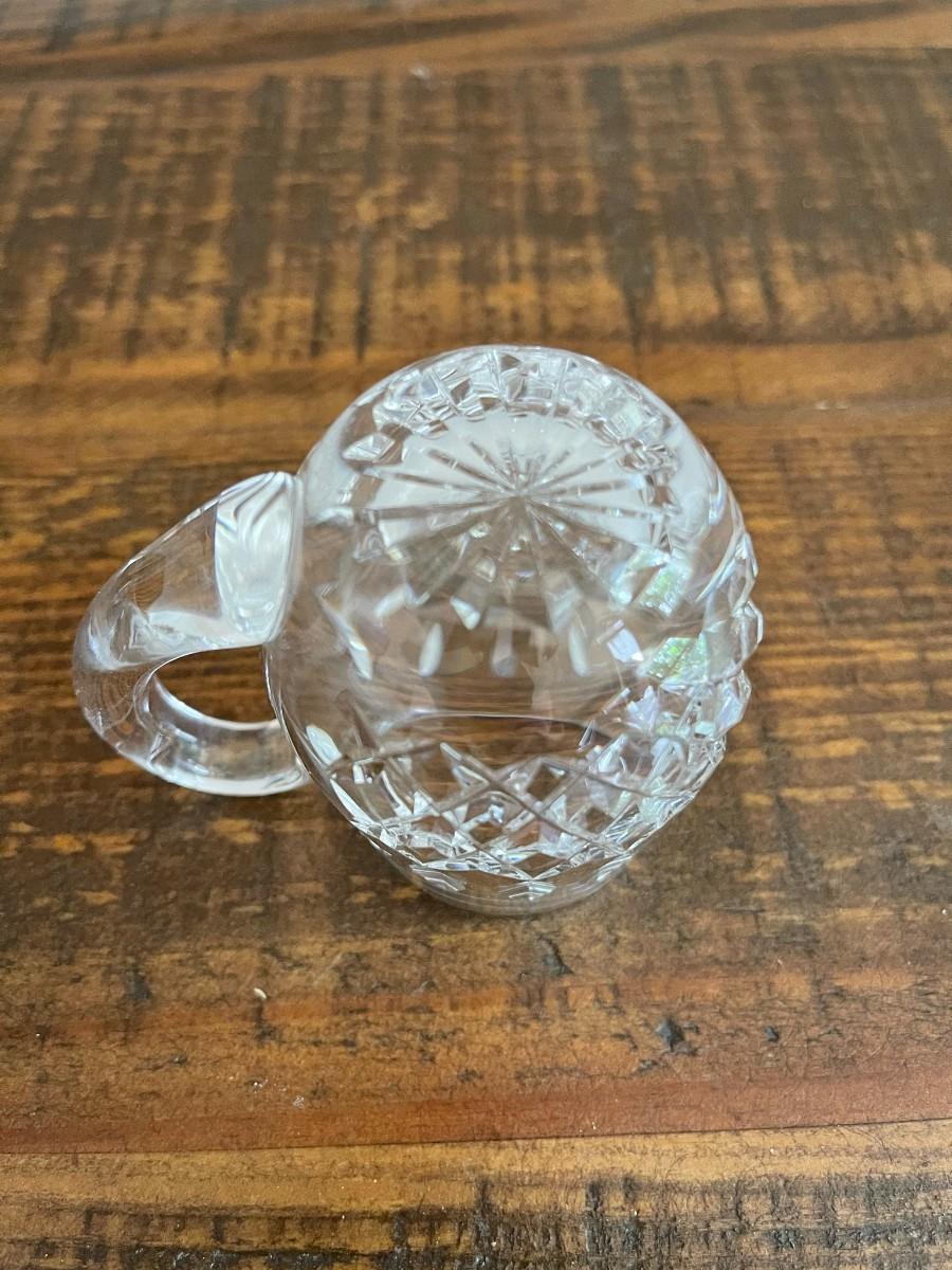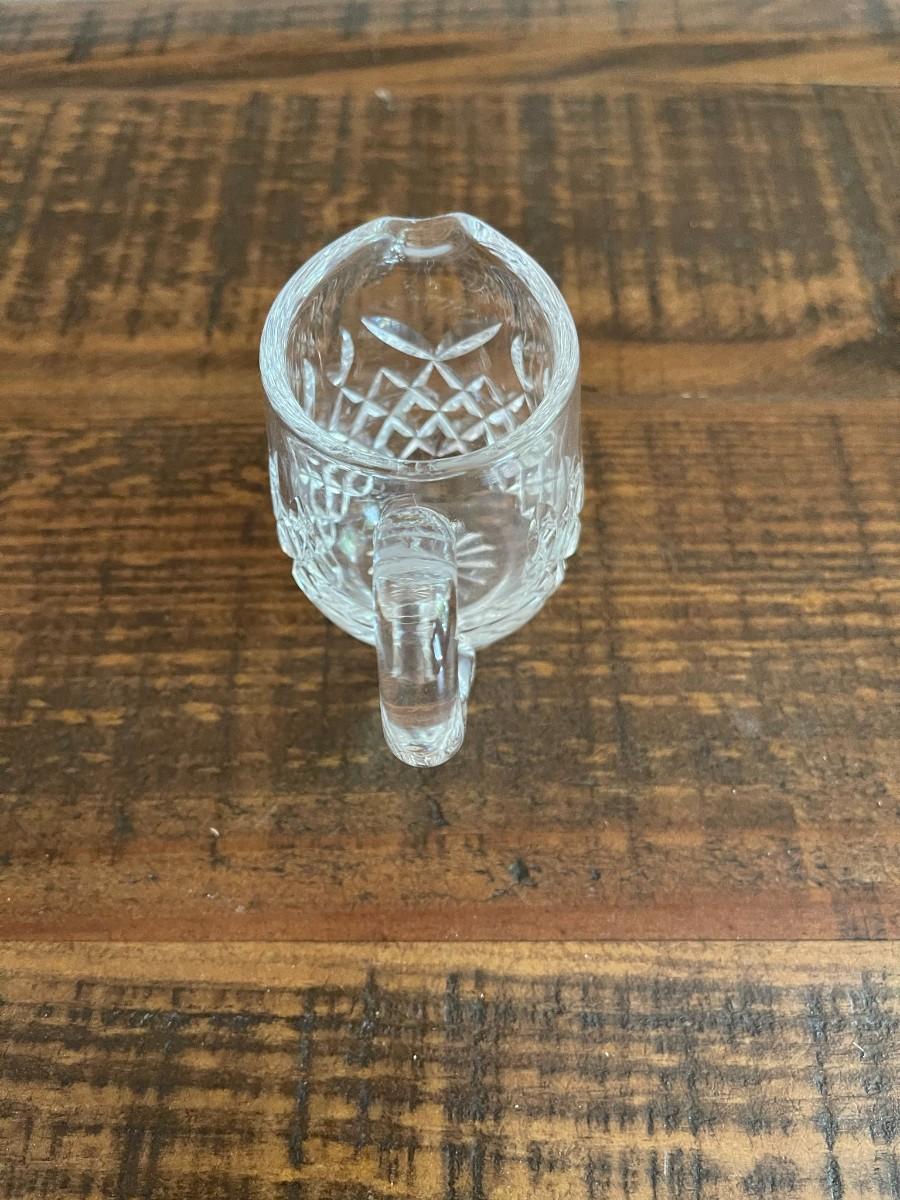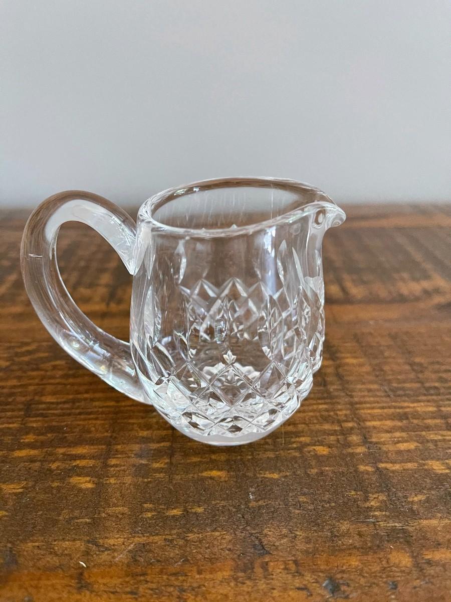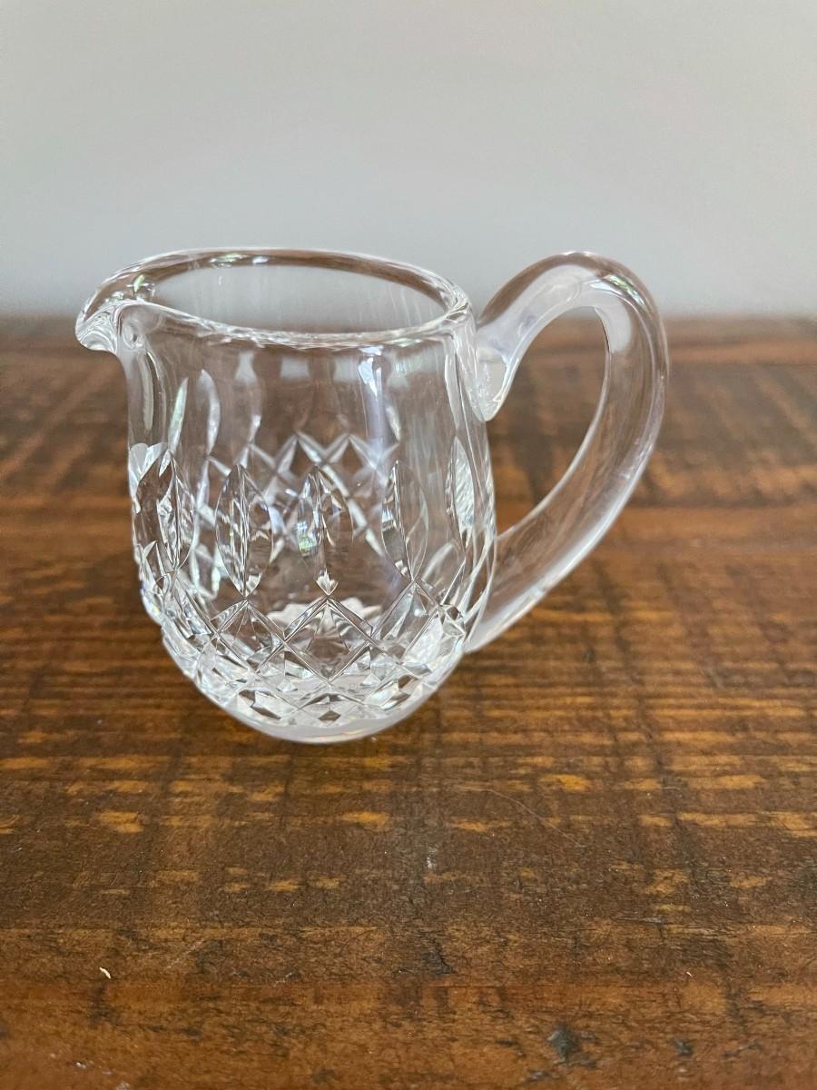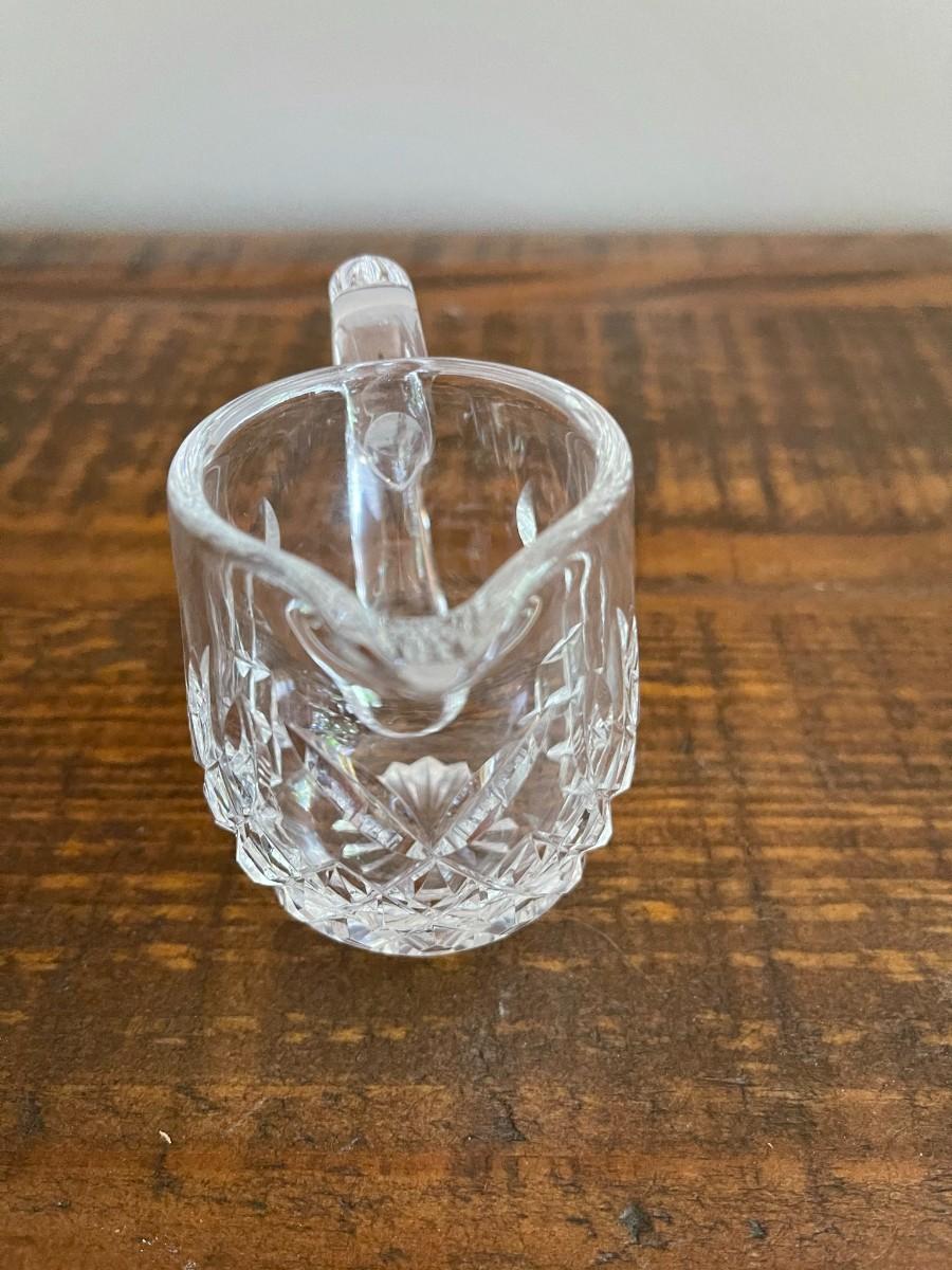 America Cut Glass Trio of Liquid Serving Vessels, Oil Cruet, Creamer and Small Pitcher. Cut with geometric patterns. Measure: Oil/Dressing Cruet, 6" H with top insert x 4" W x 3 1/4" D; Small Pitcher - 3 1/2" H x 4 1/4" W x 3" D; 3" H x 3 1/4" W x 2" D