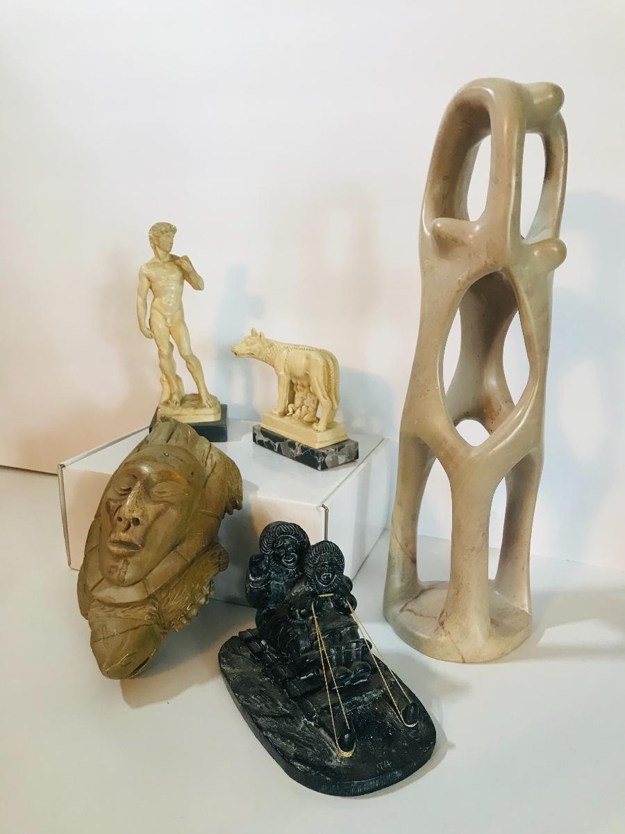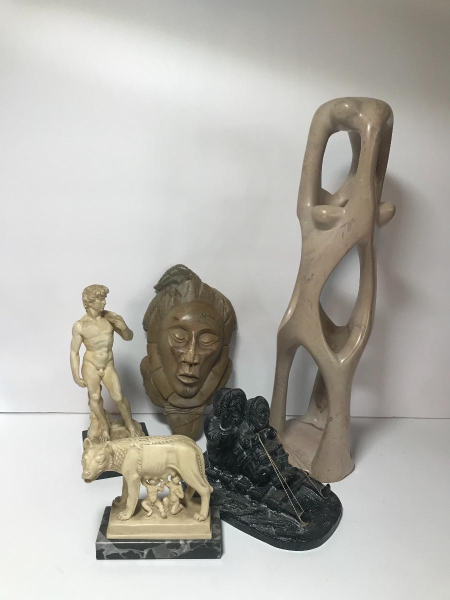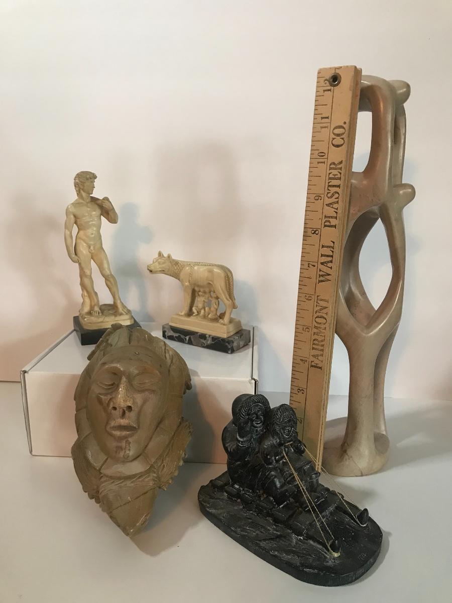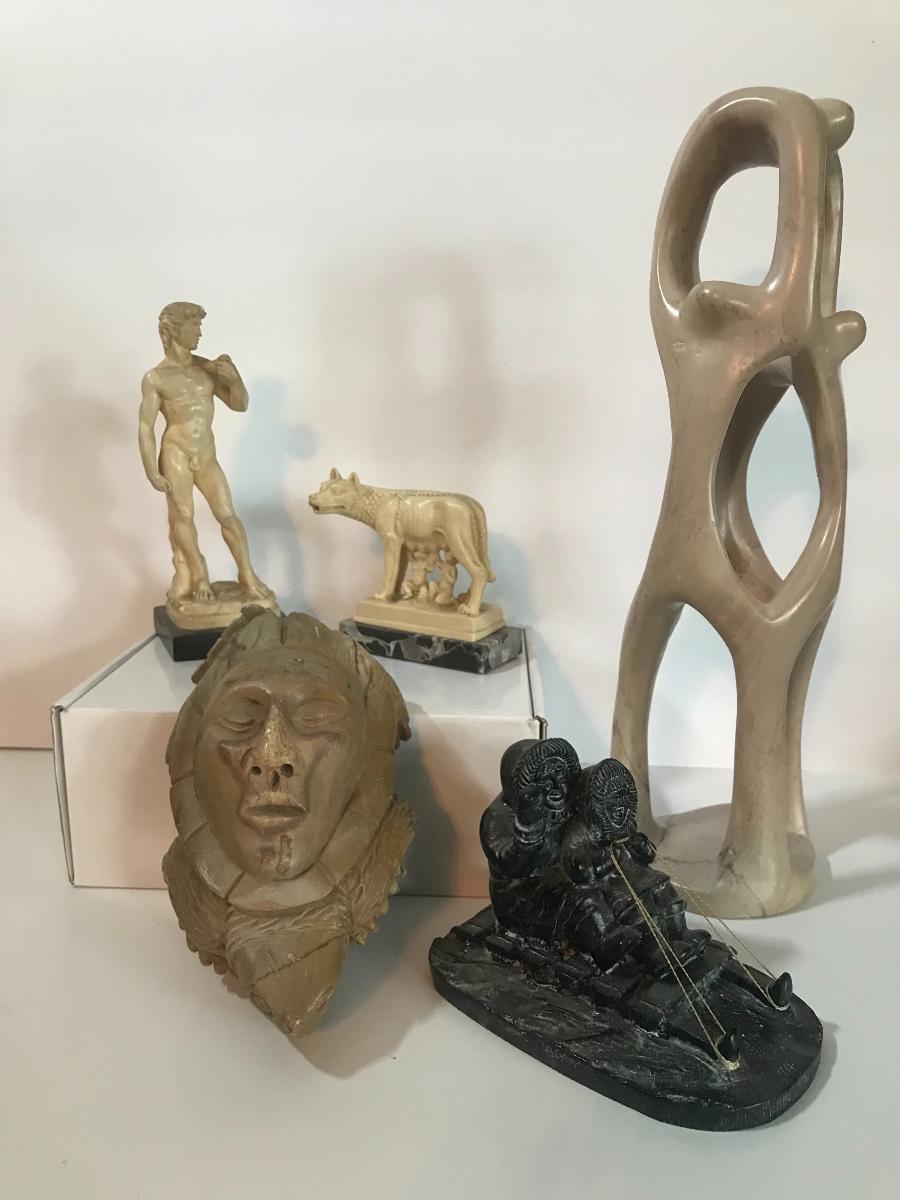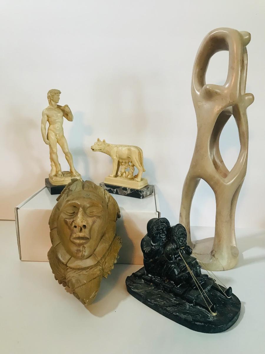 Inuit couple on sled, a wolf with human babies, statue of David, a face carving of Inuit man, and a graceful dancing trio. The pictures show condition, measurements if taken, and what is included in the lot. Due to the large amount that we photograph and the time frame, we are not always able to take measurements. All items unless noted, are pre-owned and have been used. If you purchased furniture, you must bring help. We do not allow one person to carry large furniture out on their own. Bring help, tools and a truck for the safety of our client’s homes, and your personal safety. Company policy. Thank you.