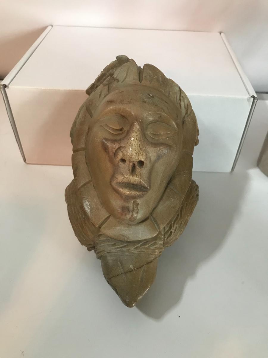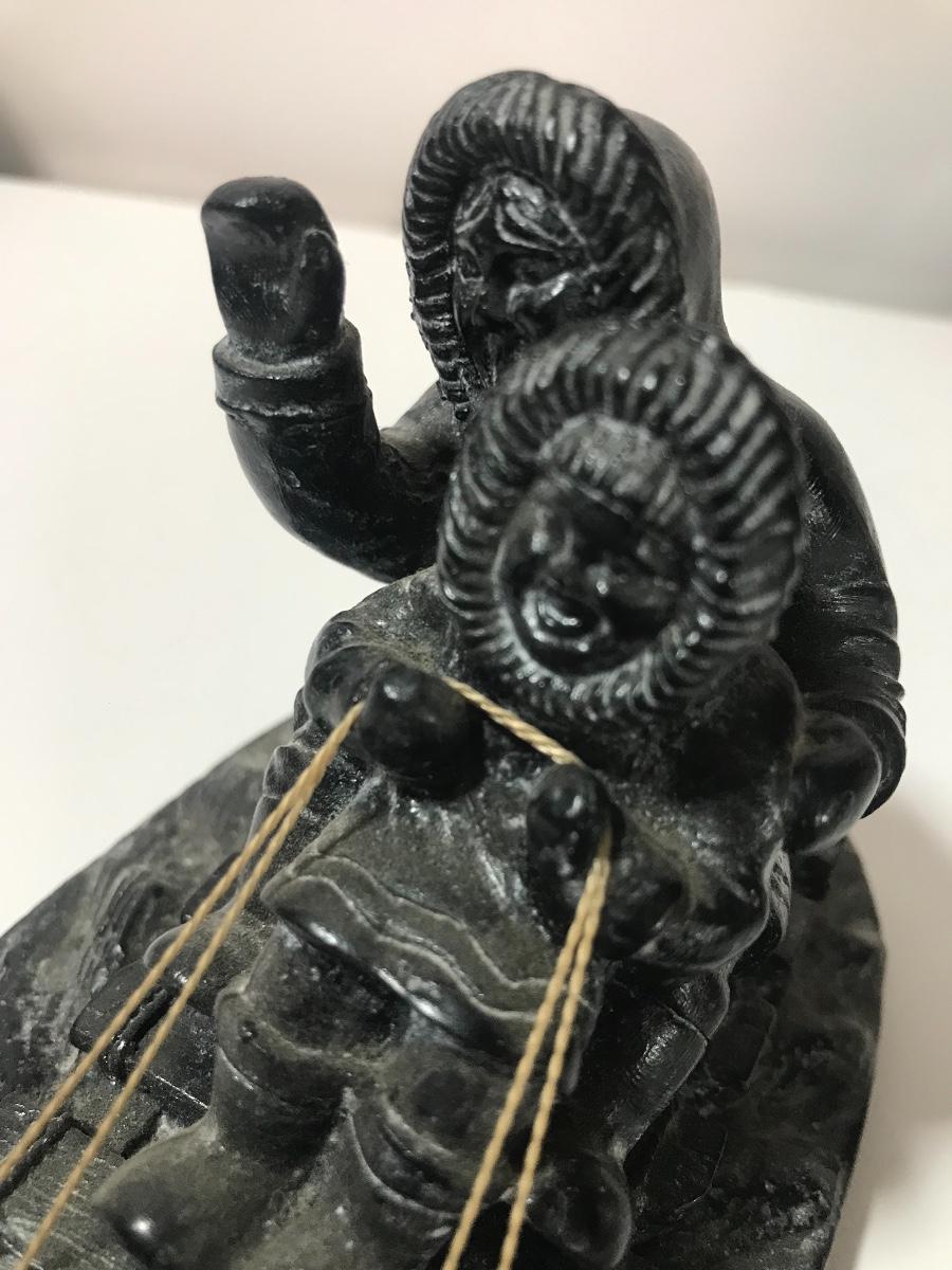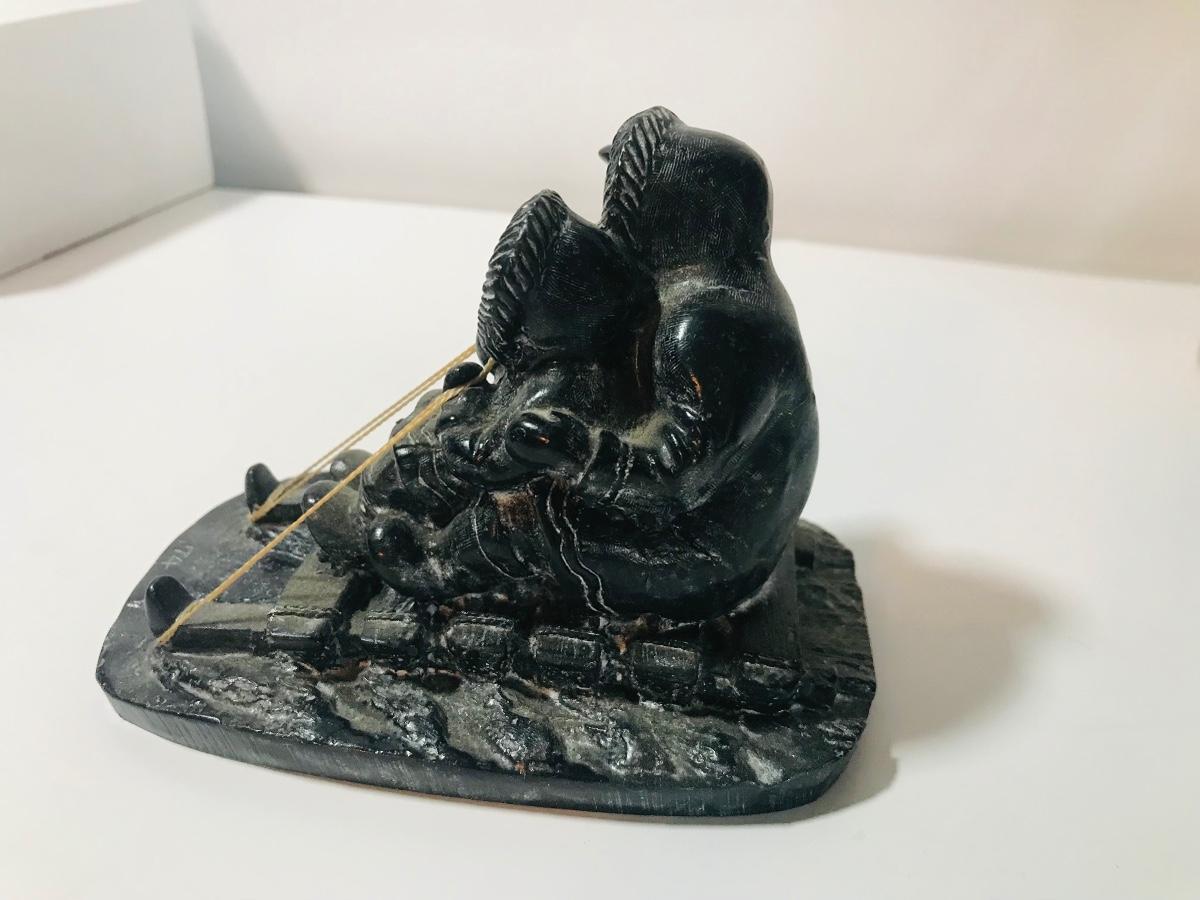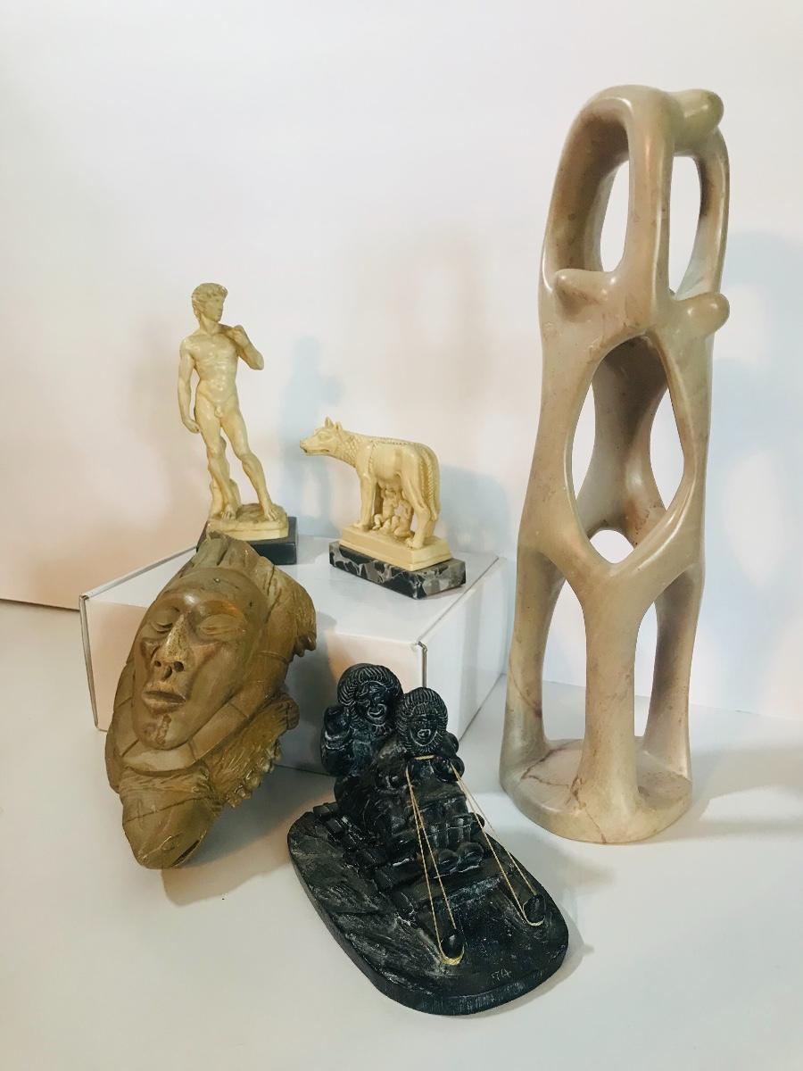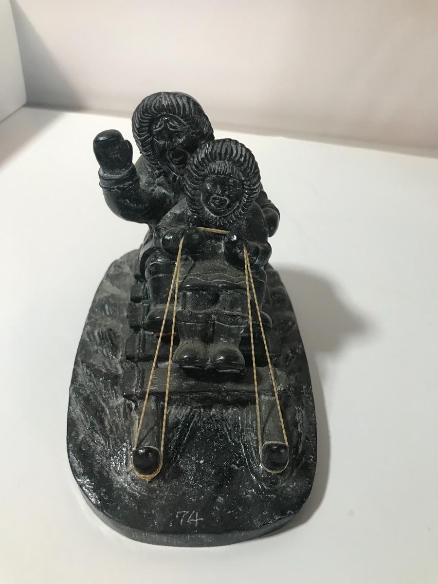 Inuit couple on sled, a wolf with human babies, statue of David, a face carving of Inuit man, and a graceful dancing trio. The pictures show condition, measurements if taken, and what is included in the lot. Due to the large amount that we photograph and the time frame, we are not always able to take measurements. All items unless noted, are pre-owned and have been used. If you purchased furniture, you must bring help. We do not allow one person to carry large furniture out on their own. Bring help, tools and a truck for the safety of our client’s homes, and your personal safety. Company policy. Thank you.