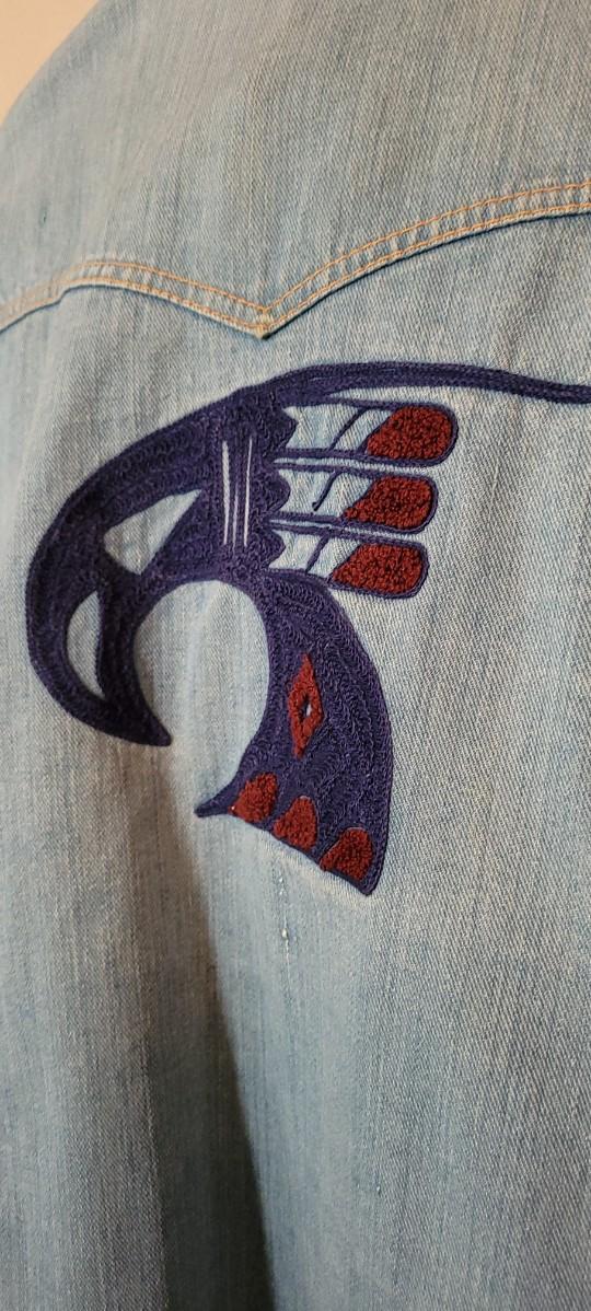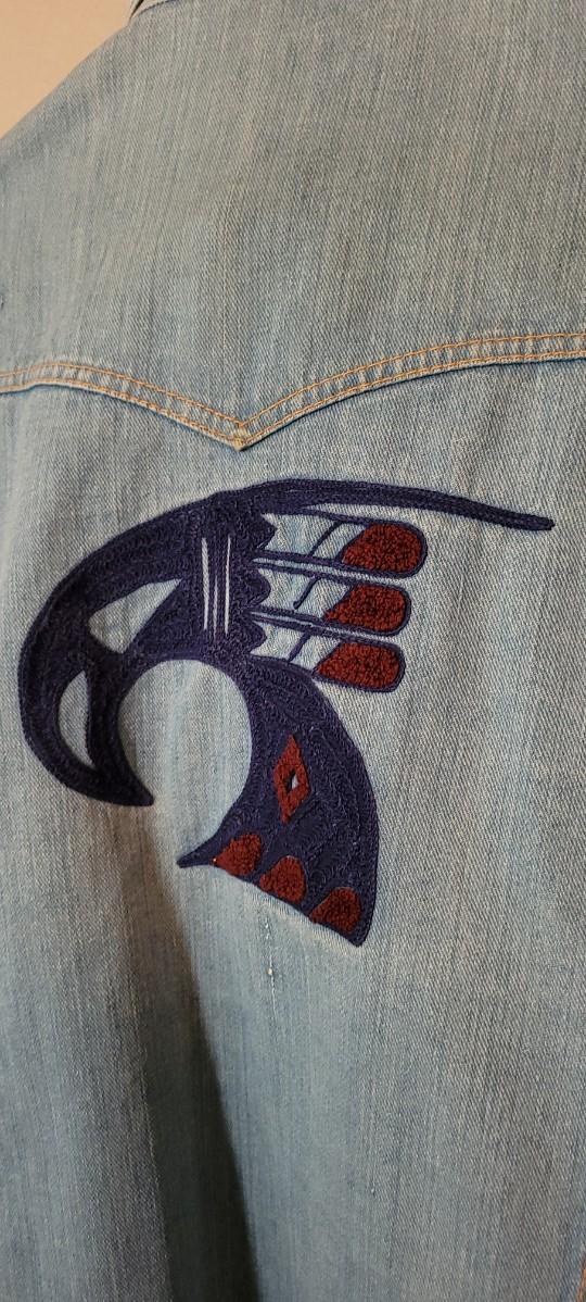 This Vintage Denim shirt fits like a Men's Size Medium (running a bit small) and features some brilliant custom embroidered Accents throughout.