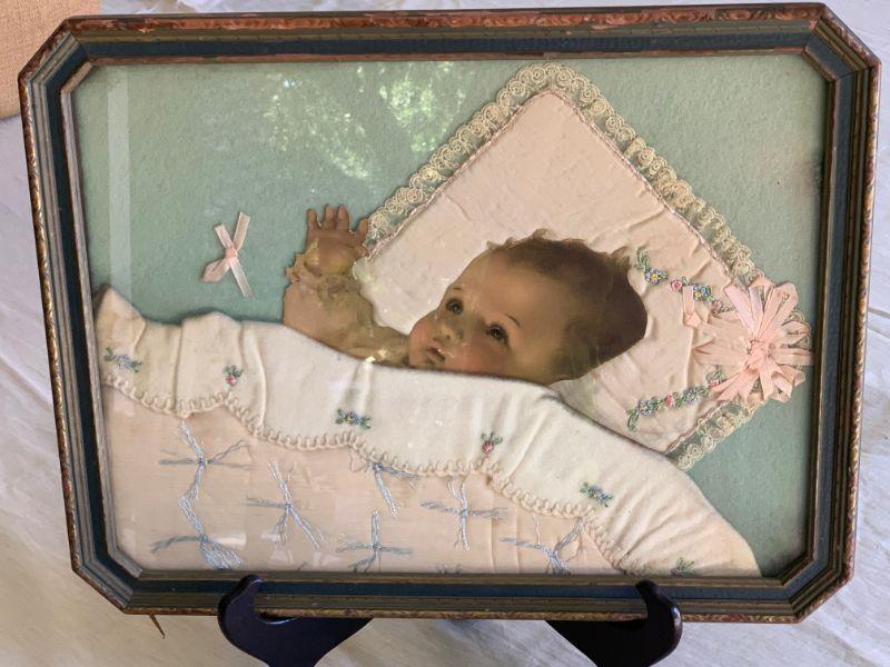 Popular craft of the 1920s & 30s. Lithograph baby picture embellished with real fabric ribbons and lace.