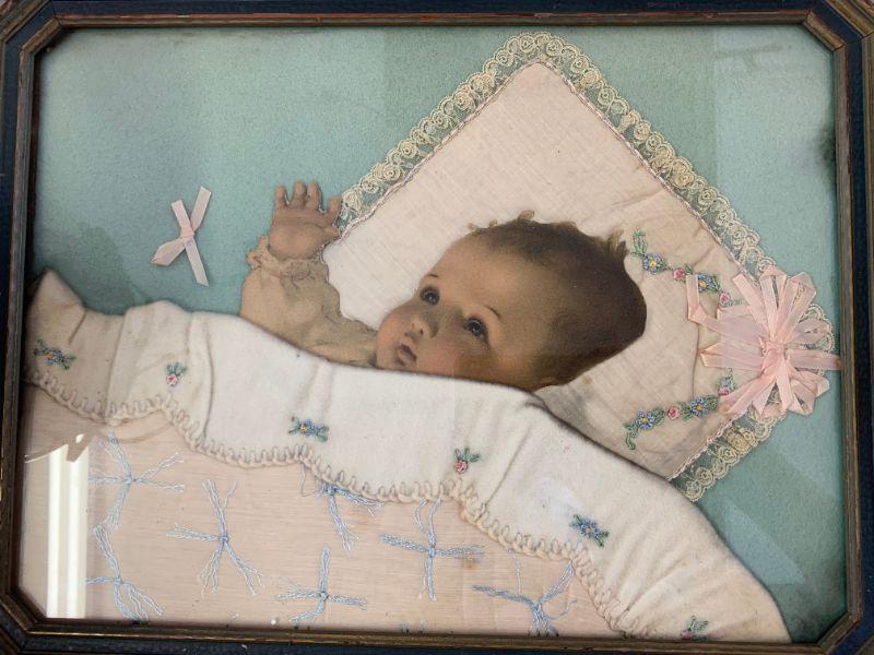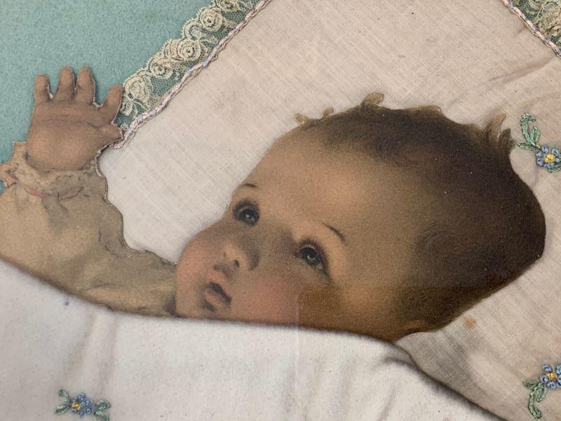 LOT 53  ANTIQUE BABY COLLAGE PICTURE TEXTILE RIBBON LACE LITHOGRAPH