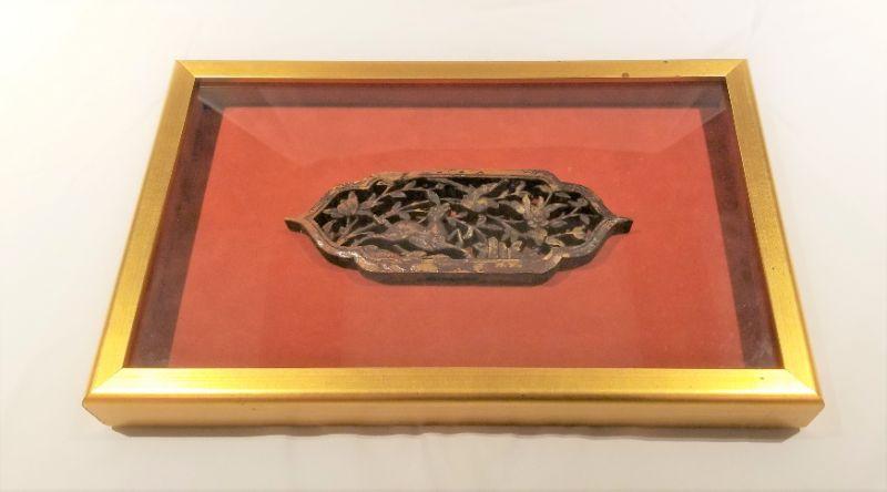 Lovely piece - antique Temple carving set in handsome shadowbox. 14 7/8" wide, 9 3/8" tall. Great condition.