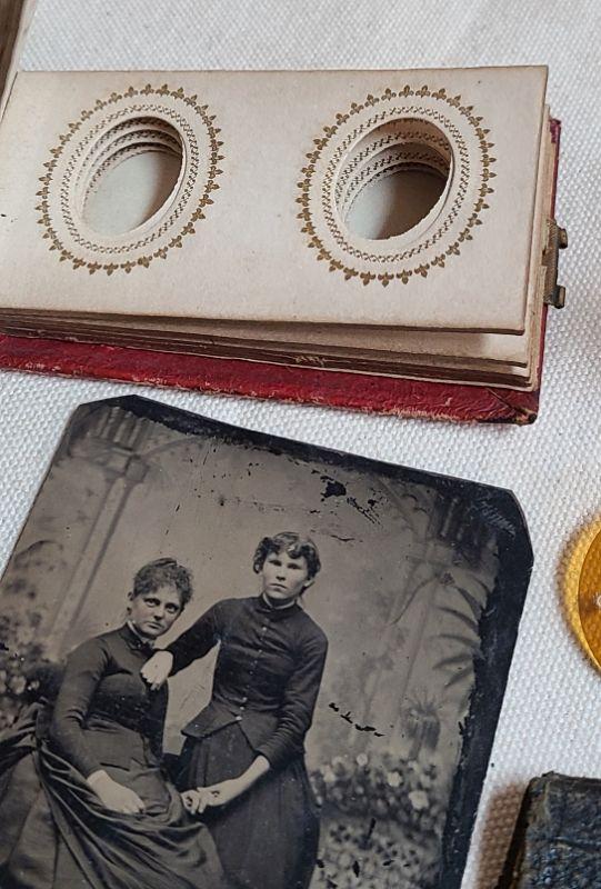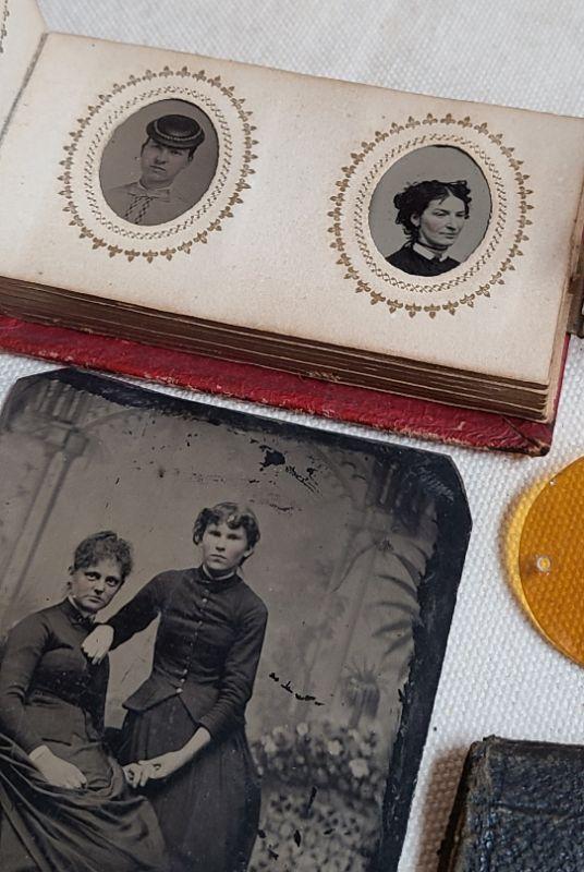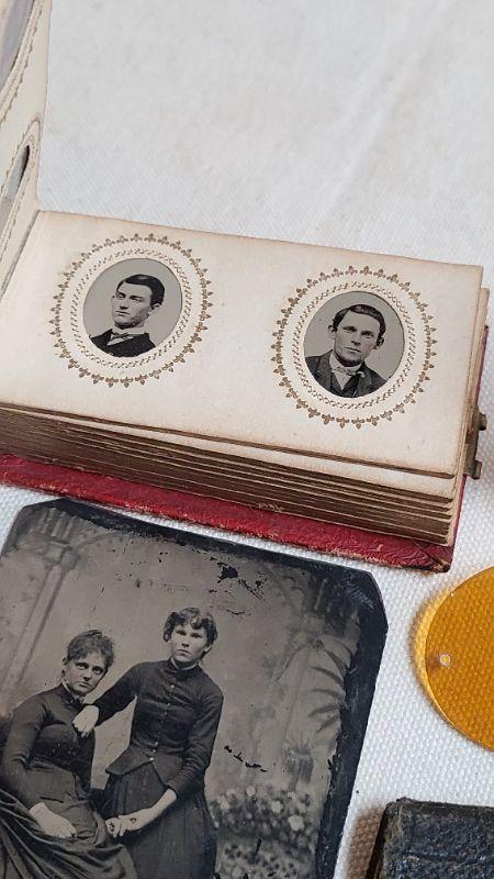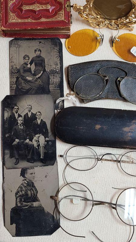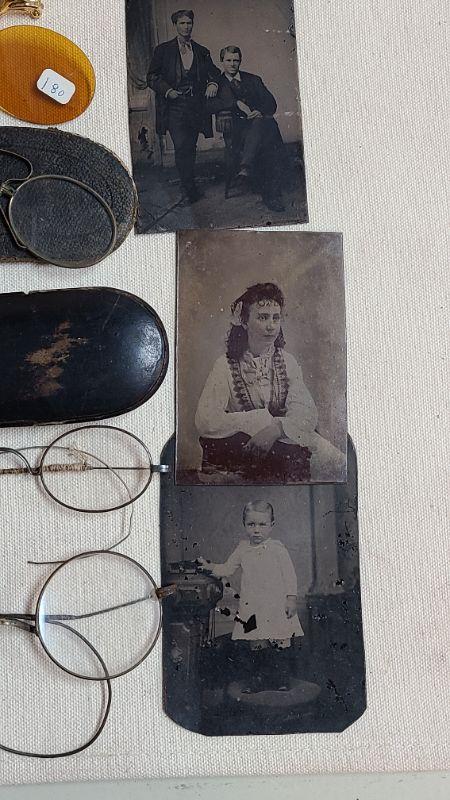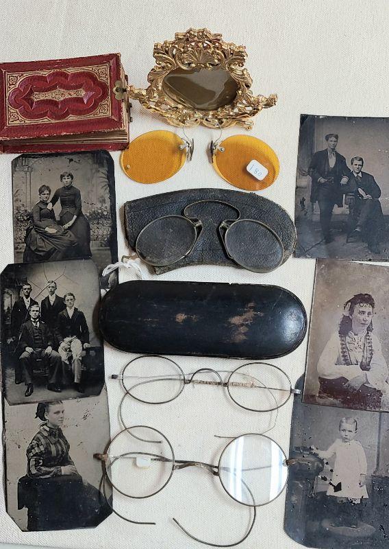 Unique lot of metal photos, antique eyeglasses and more. Please see all pictures for condition of the items listed and what is included in the lot. Pictures will also show any measurements if taken and is the best representation of the items. Thank you for looking and have fun bidding! We appreciate Treasure Hunters!