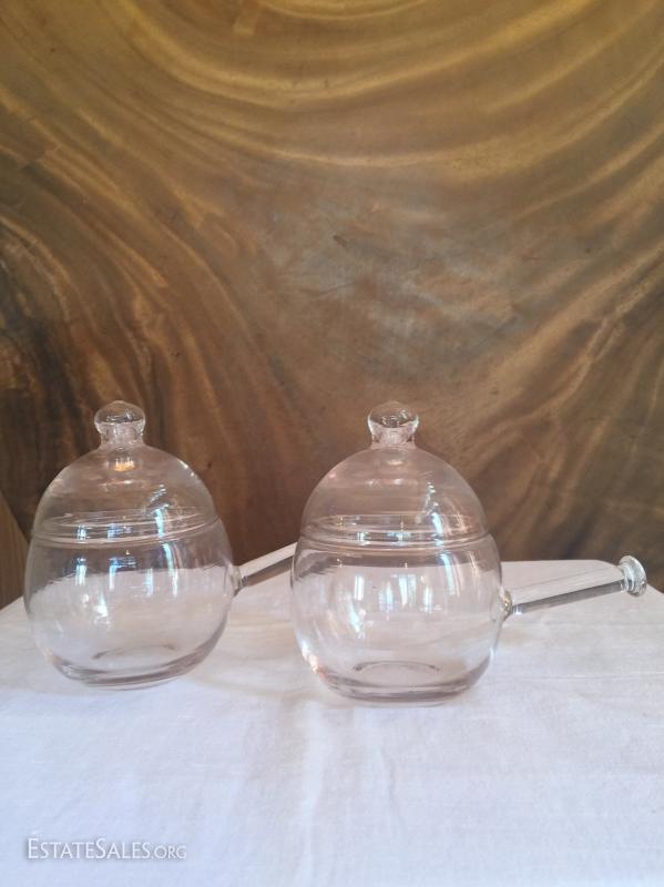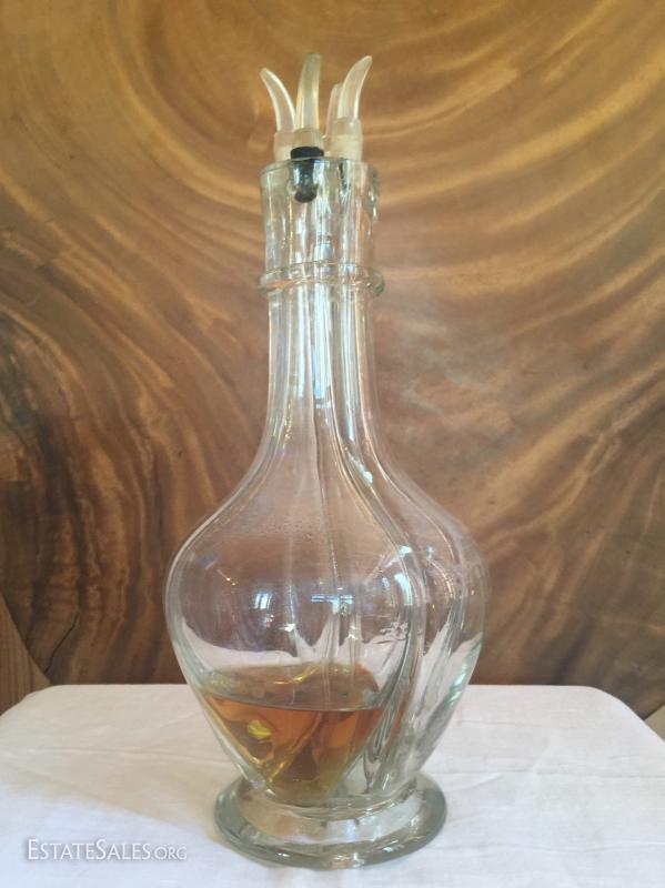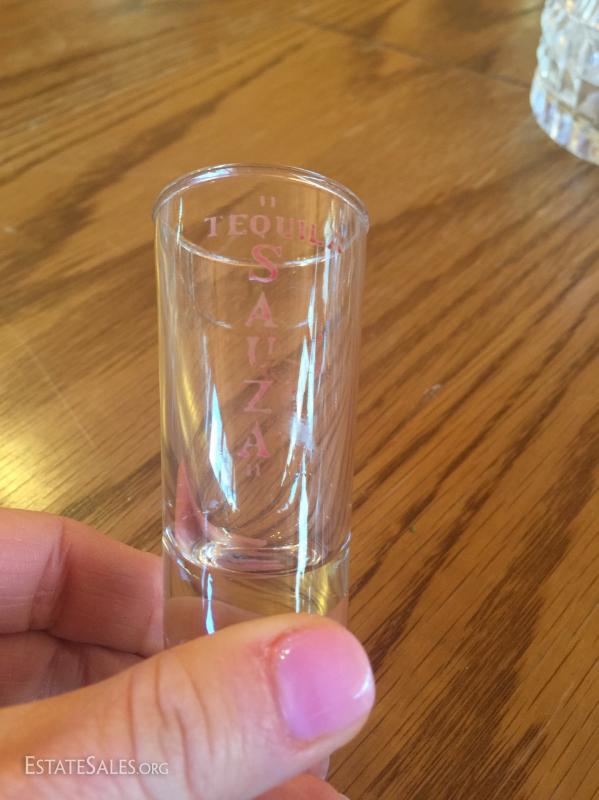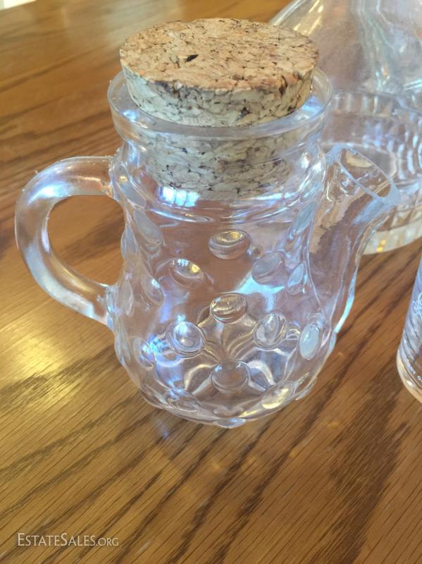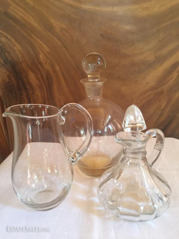 3 Bar glass decanters, 8 shot glasses,vases and small pitchers. See photos for details. Sold as is.
