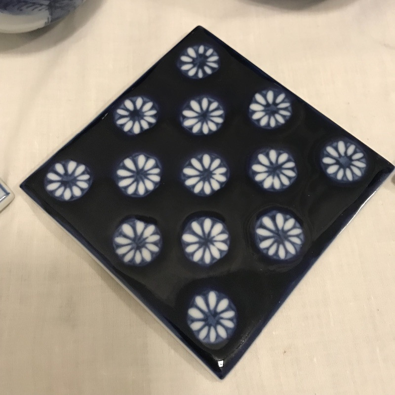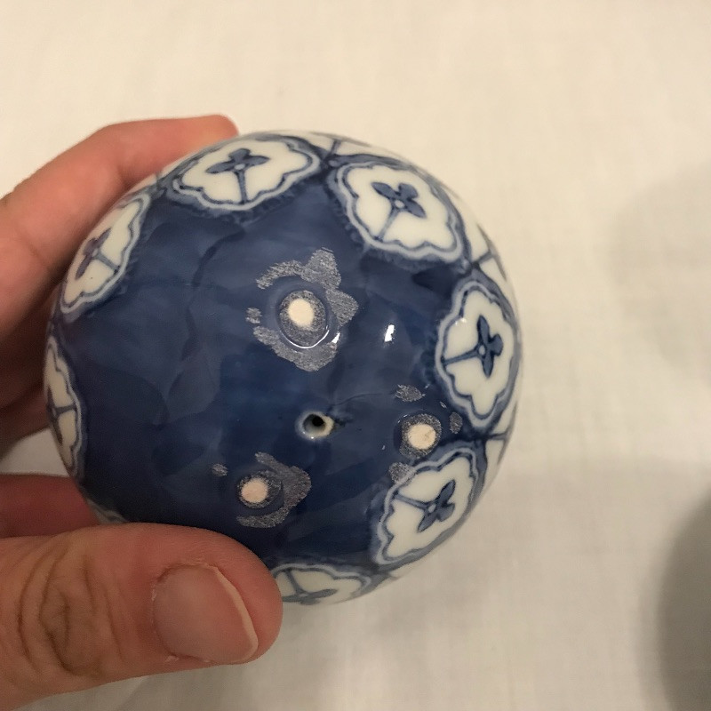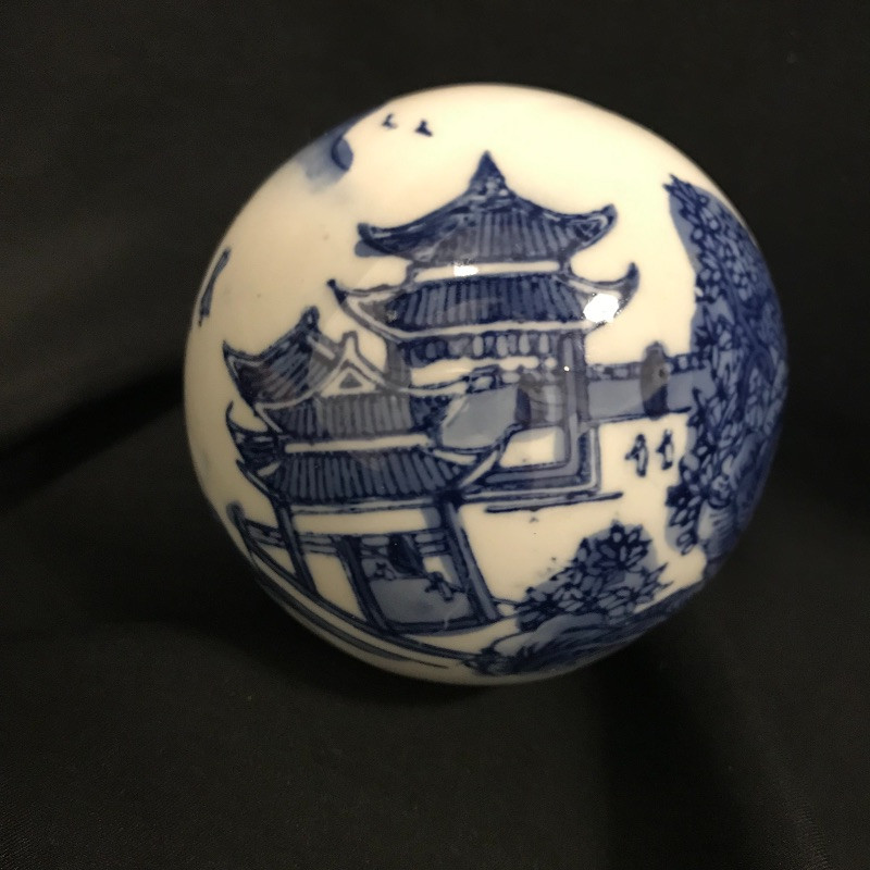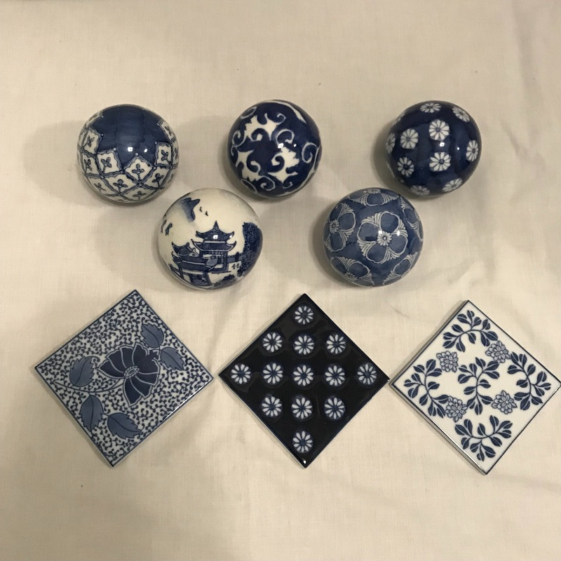 Quaint and adorable these three ceramic tiles and five balls all are shades in blue with an Asian feel. Some of the balls had three unfinished dots on the bottom, possibly as part of a display, see images. Local Pickup Only.
