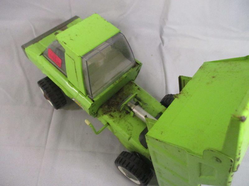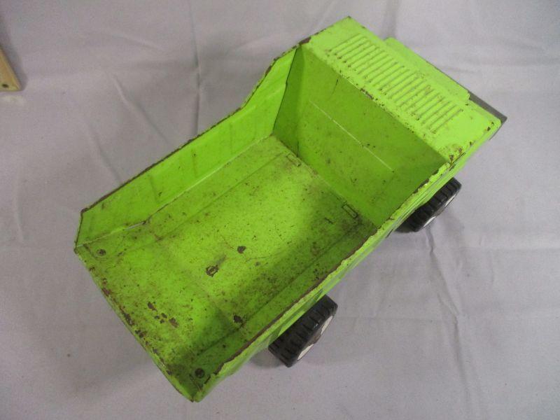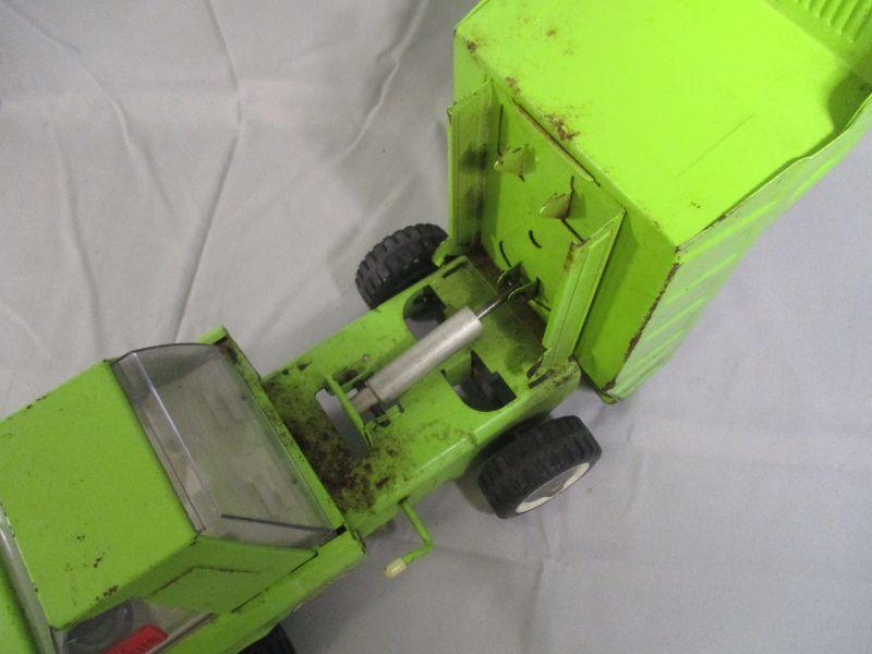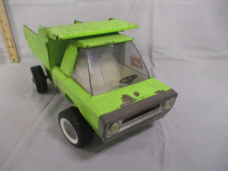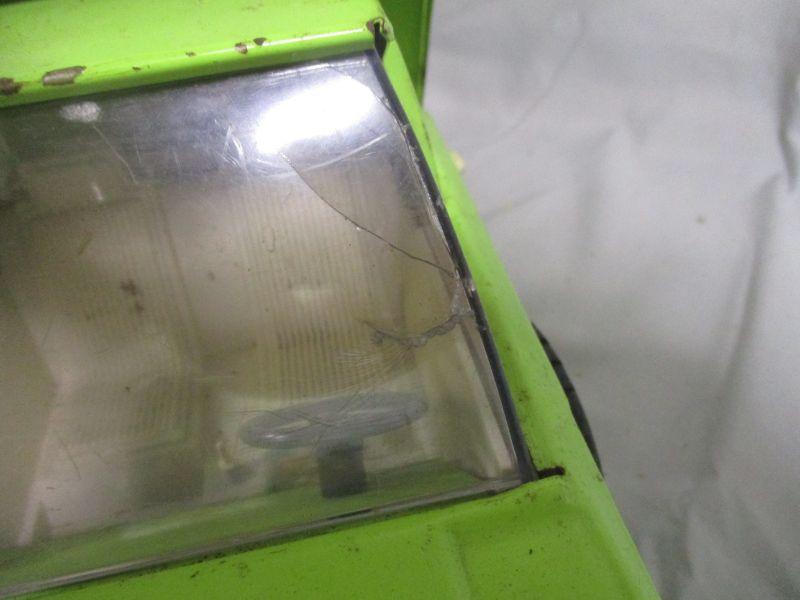 This truck has been well-loved, but still is in working condition and ready to entertain your kids/grandkids. It is 14.5" long and the only issue that I found other than cosmetic issues of rusting and paint loss is a crack in the windshield.