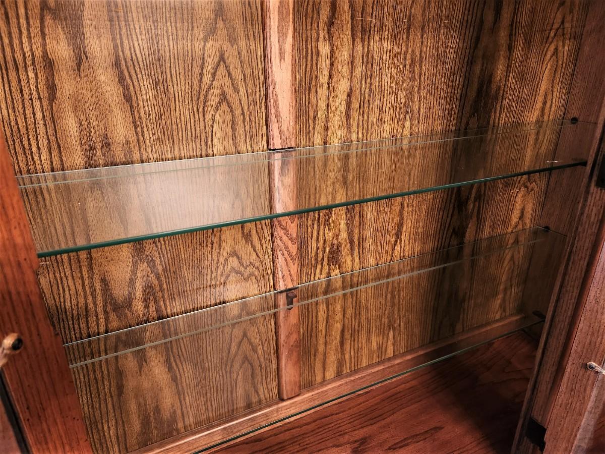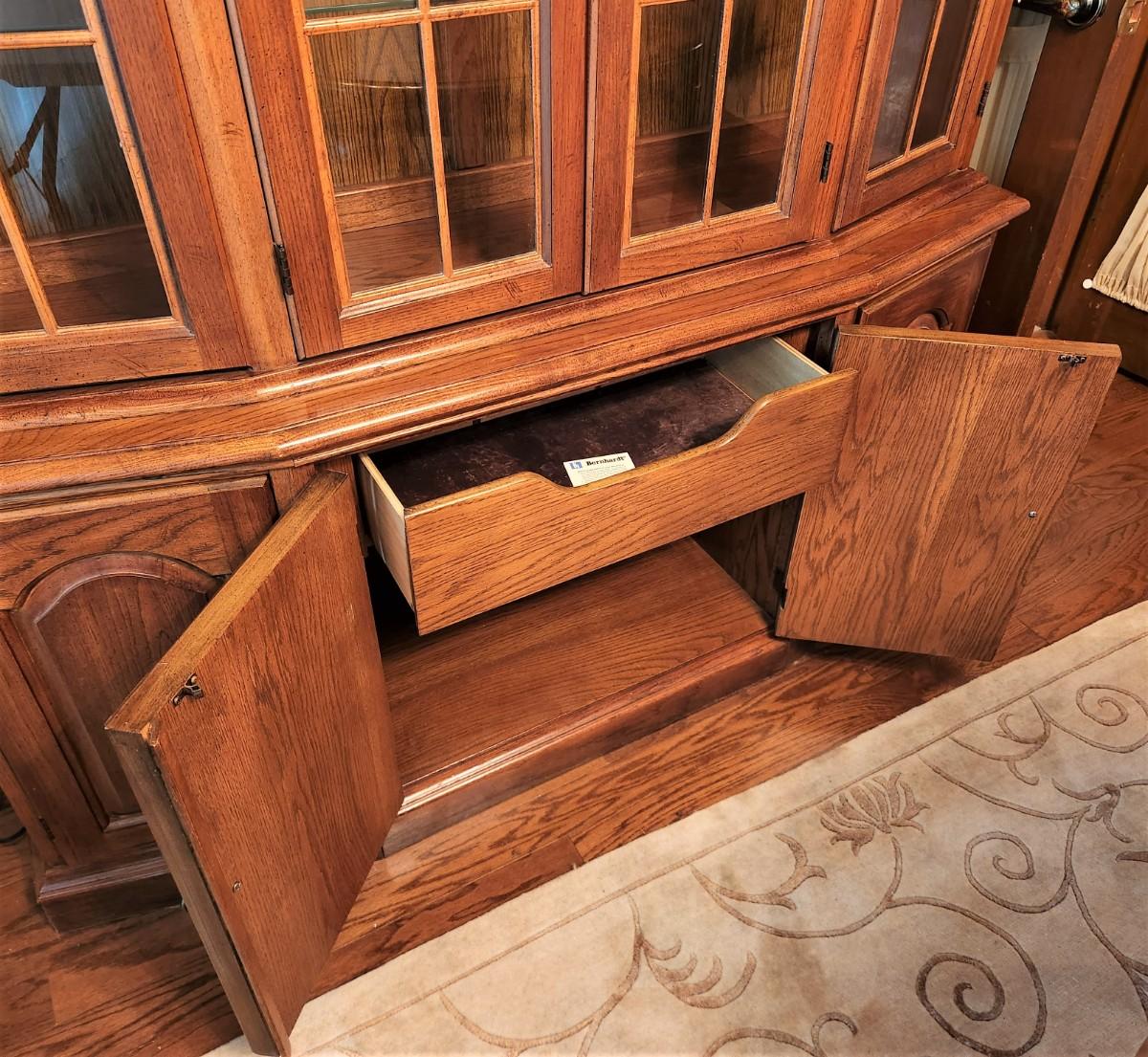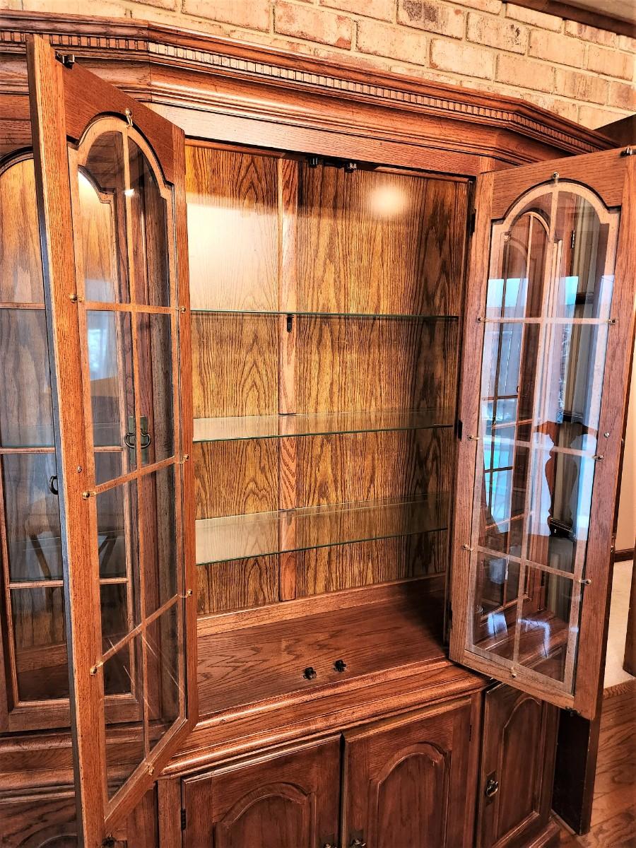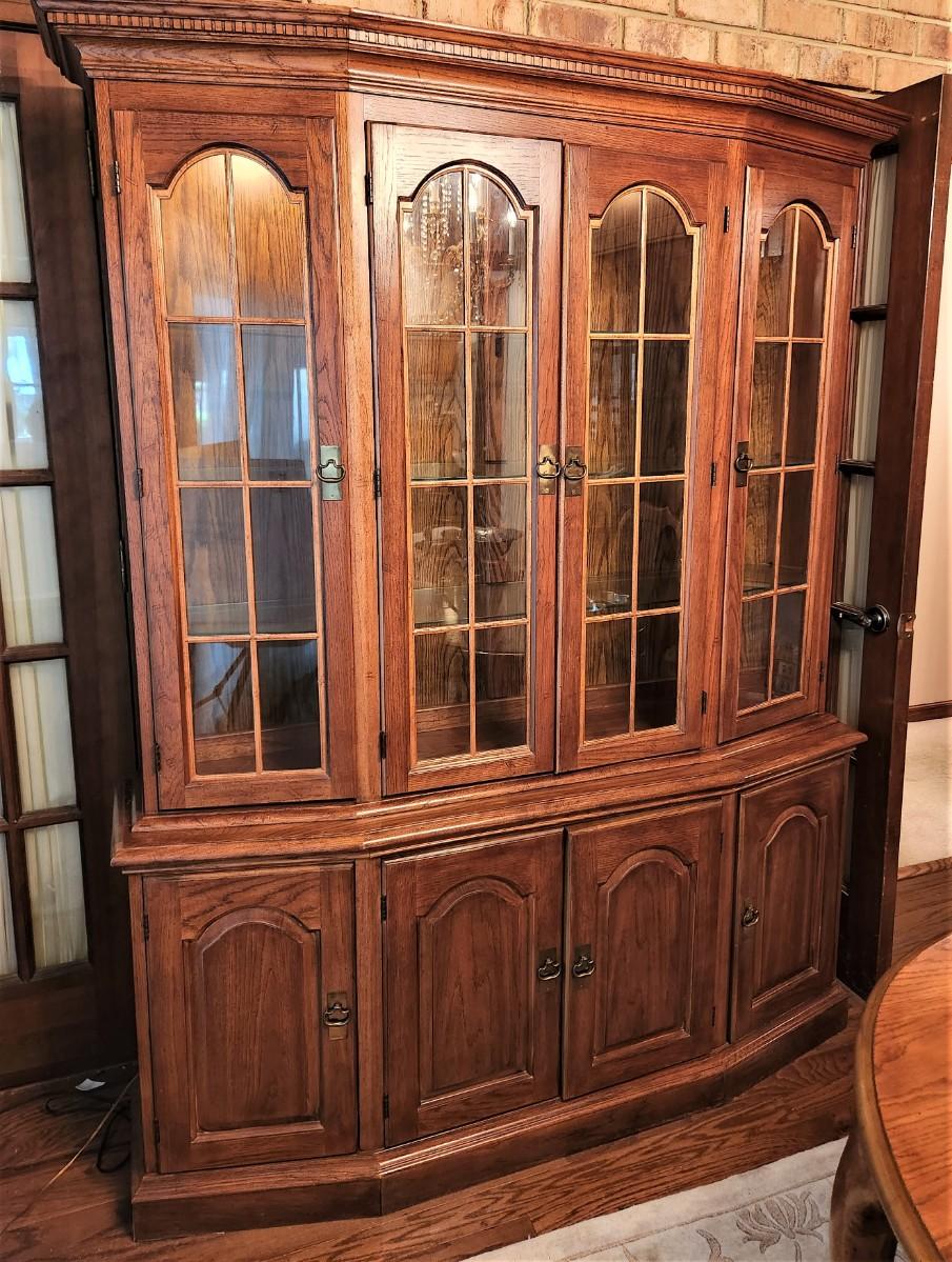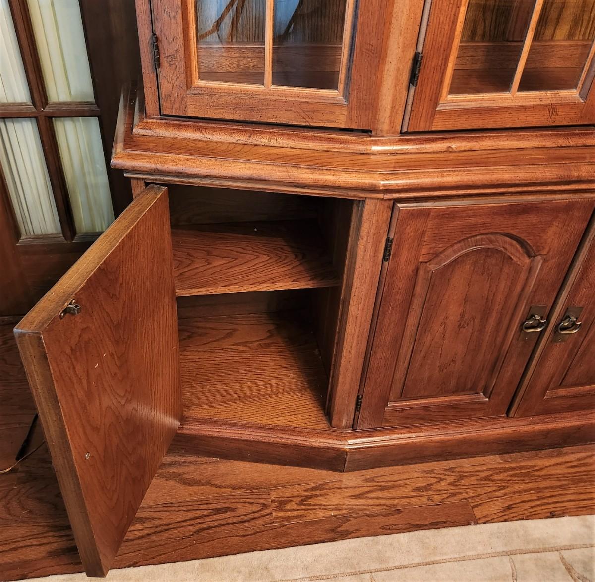 Traditional oak finish Burkhardt Furniture lighted china cabinet - 3 removeable glass shelves - comes in two pieces. 79" tall, about 14" deep, 5 feet across. Lots of storage in the bottom. Gently used condition. We have a table/chairs and server to match this piece - they will come up later in the sale.