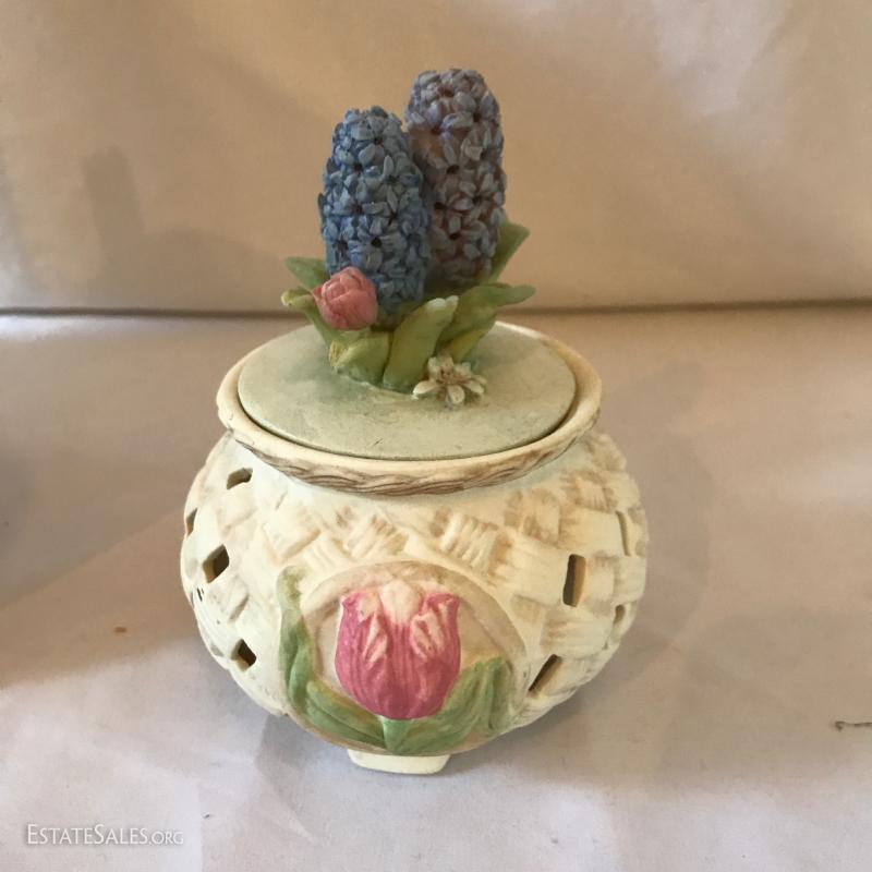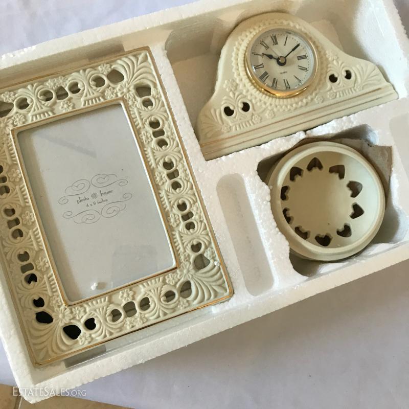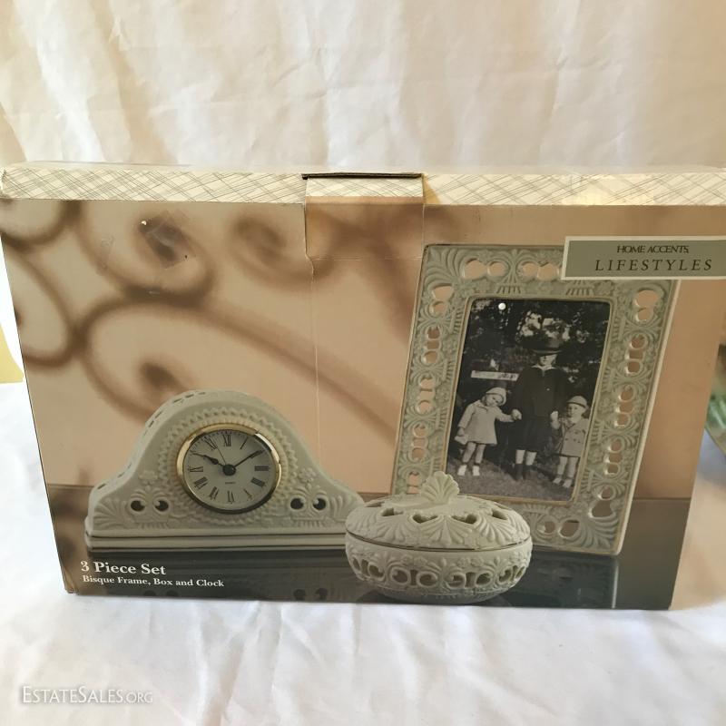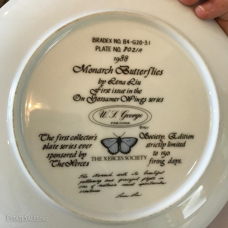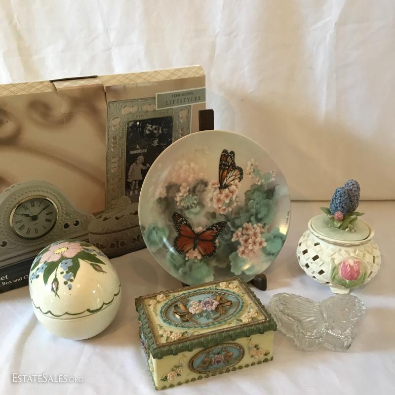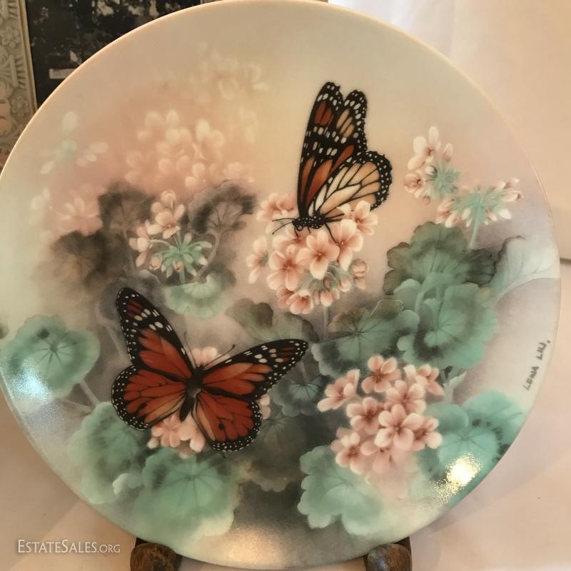 Butterfly collector's plate by Lena Liu. First Issue Monarch Butterflies. Four boxes with lids including a hand painted box with intricate detail. New 3-piece bisque set in box includes clock, frame and box. Comes in original box that is a bit dirty. Does not include plate stand. Shipping available or local pick up in Flat Rock, NC.