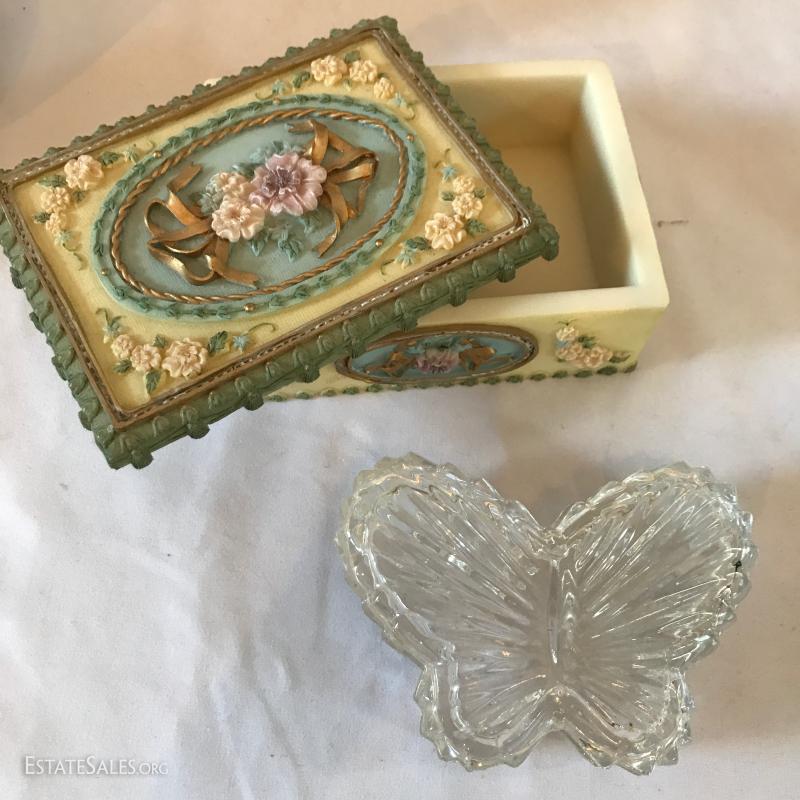 Lot 53 - Butterfly Plate, Flowered Boxes and Bisque Set