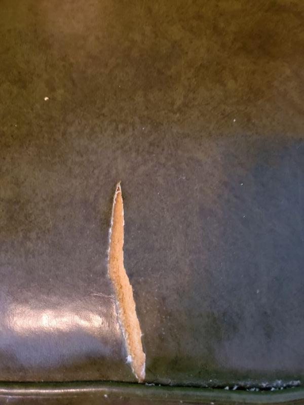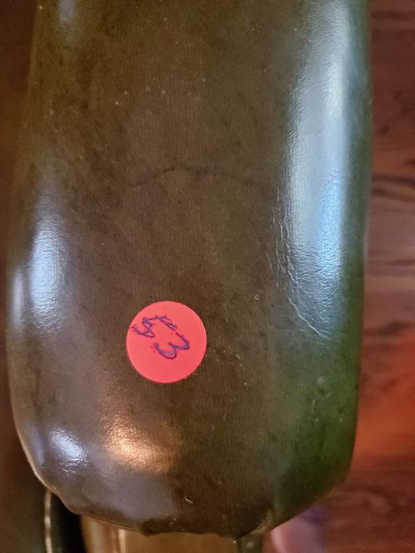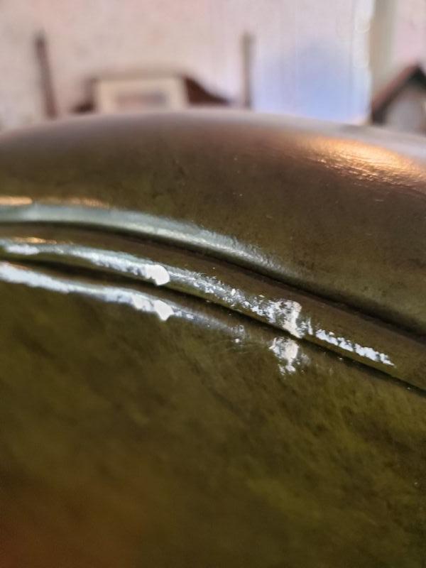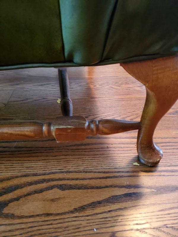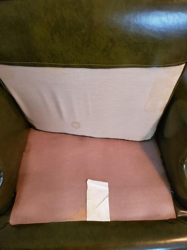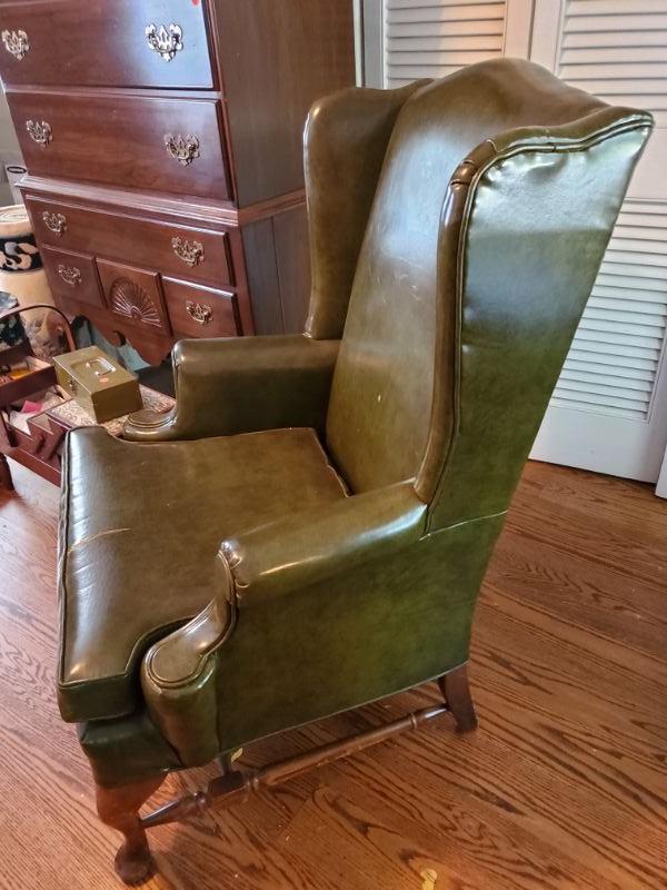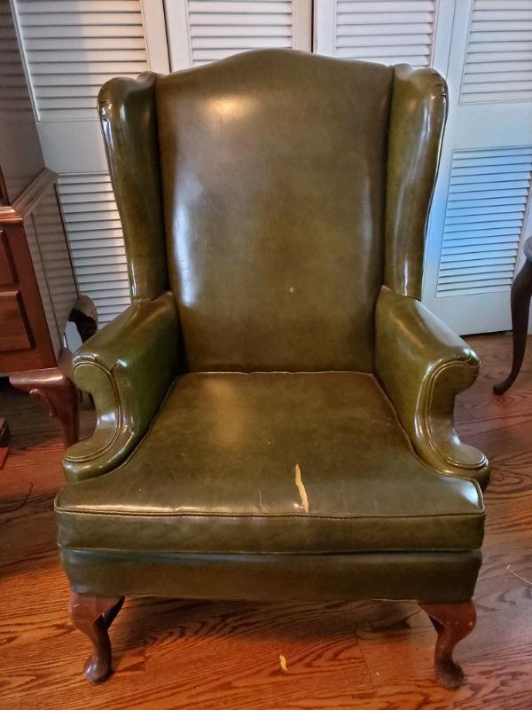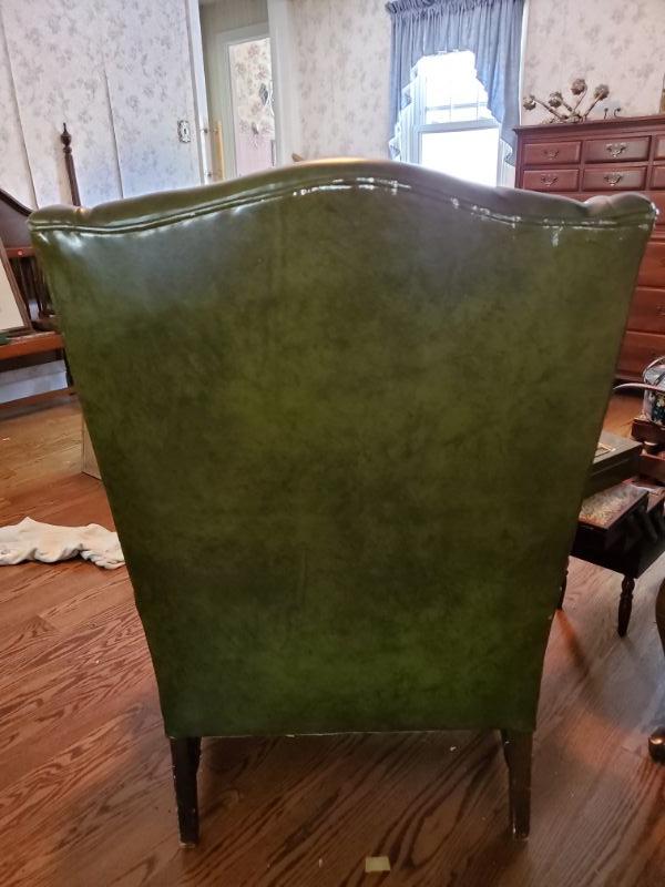 Vintage green vinyl chair. Has one rib on seat and paint residue on back. Bring help to move from second floor.