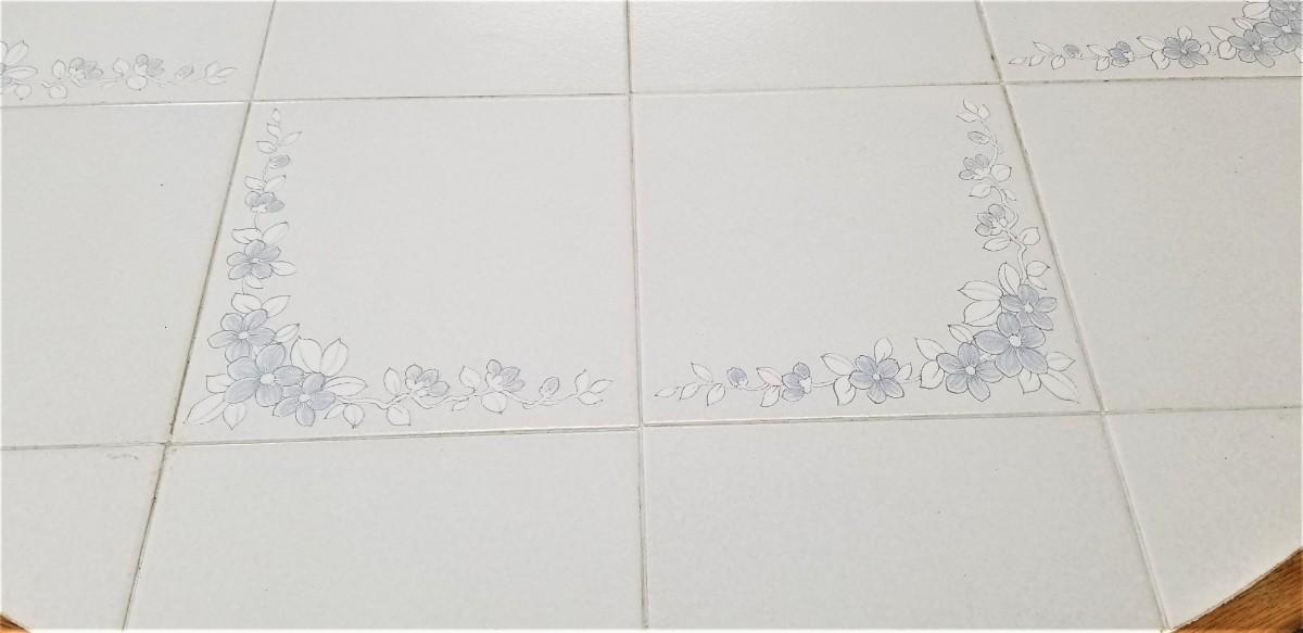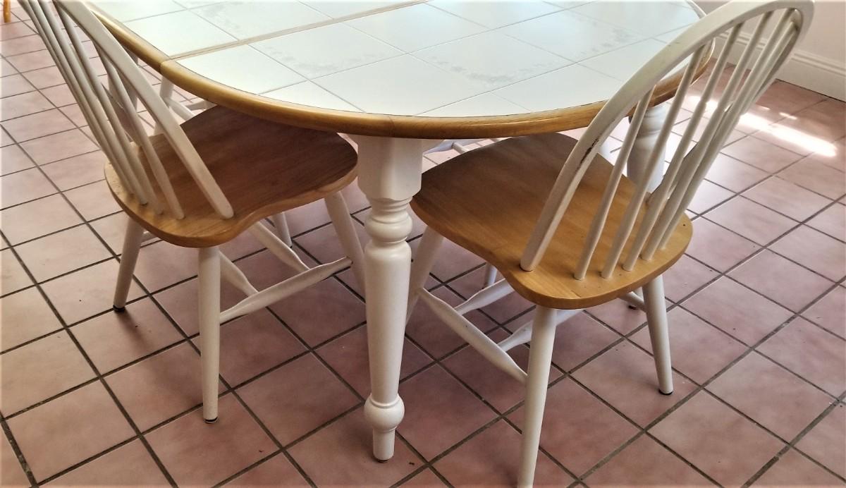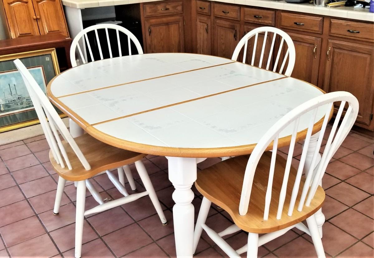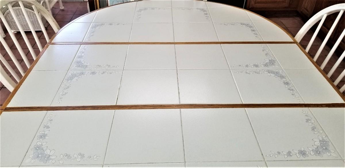 Ceramic tile-top table - delicate floral design. One leaf (16" wide). Then fully extended, table is 61" long, 44" across, 28" tall. Four matching chairs. No maker noted. Solid, sturdy, and in good condition.
