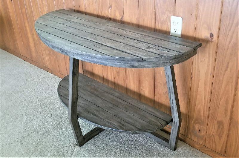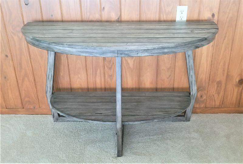 Good looking contemporary piece here, built to look like a primitive. 48" across, 40" tall. Lower Shelf. Blue/gray in color. Solid.