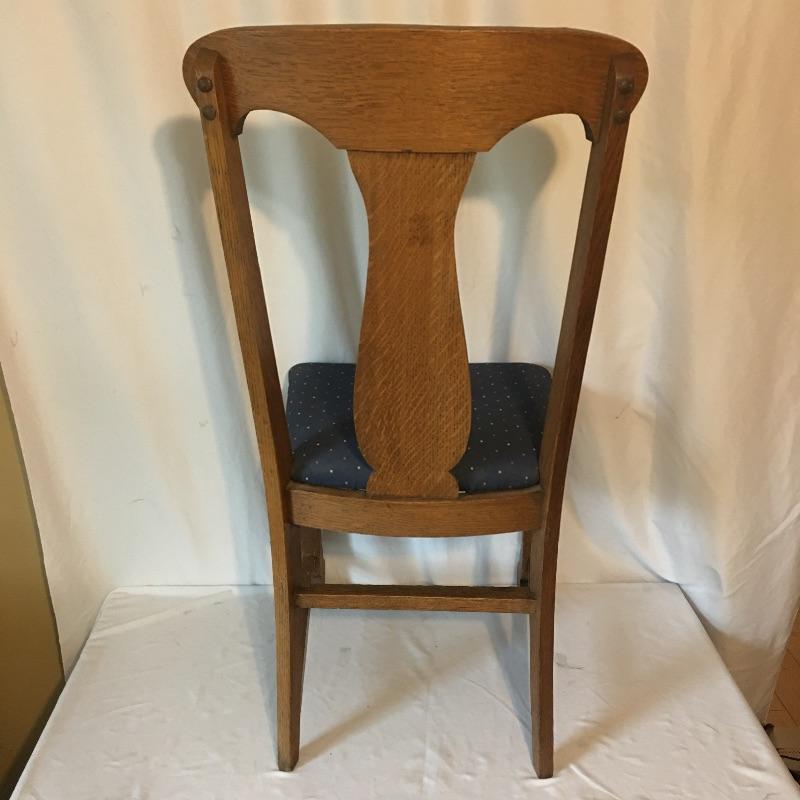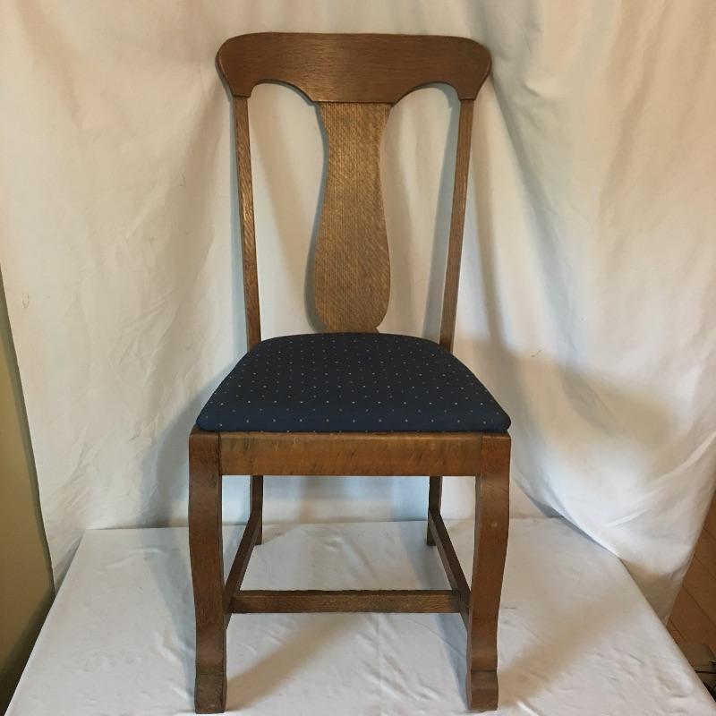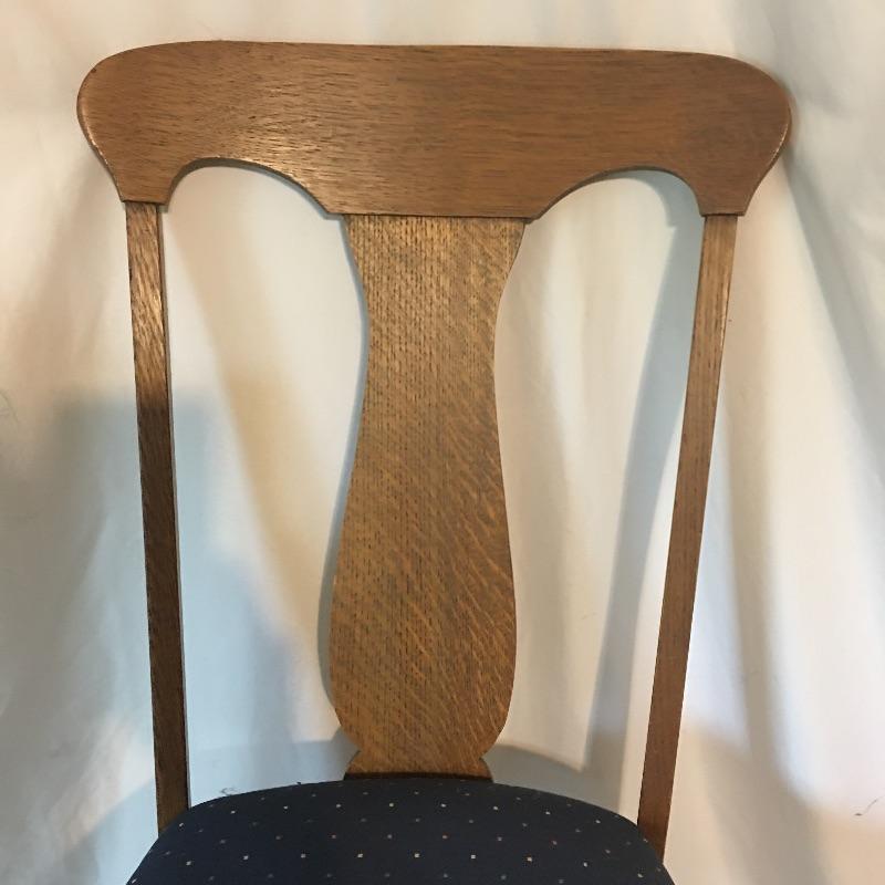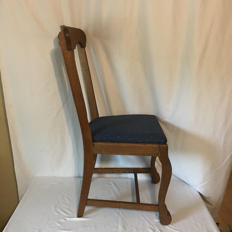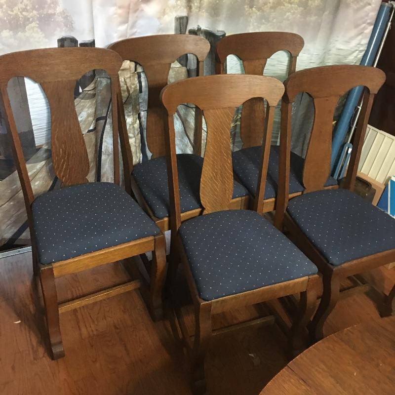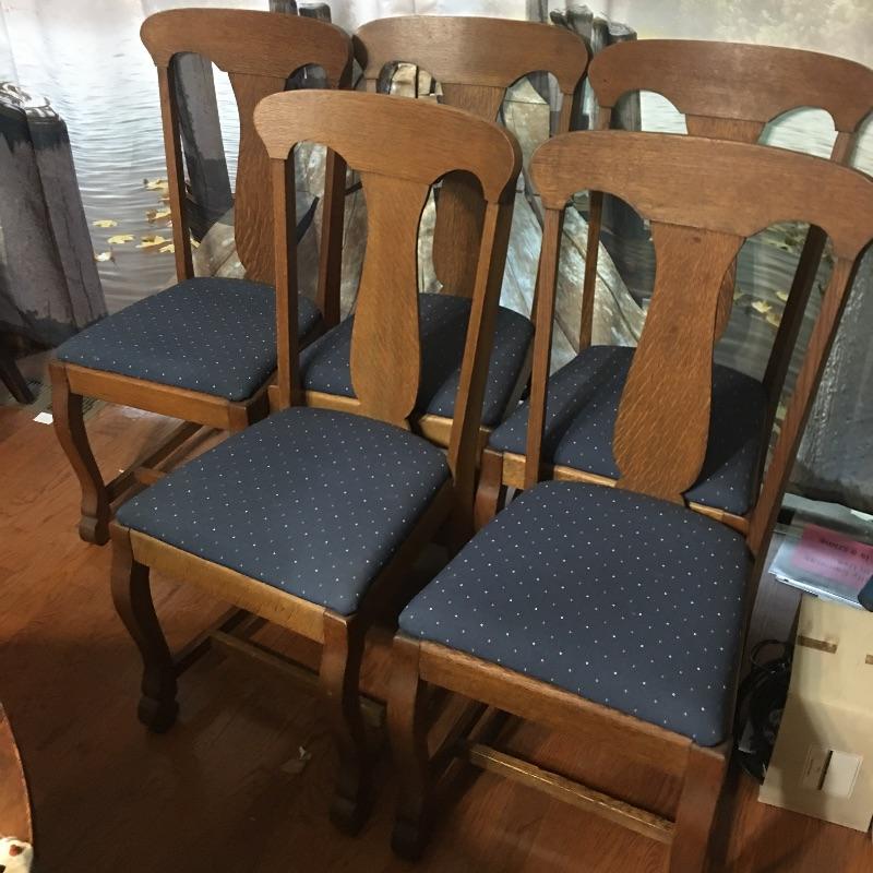 Five Antique oak dining chairs. Chairs appear solid but have been glued in places, see pictures. Nice set of chairs to add charm to your dining room. Chairs measure 17.5” x 19.25” x 38” with a 18.5” seat height. Chairs have pet hair on them.