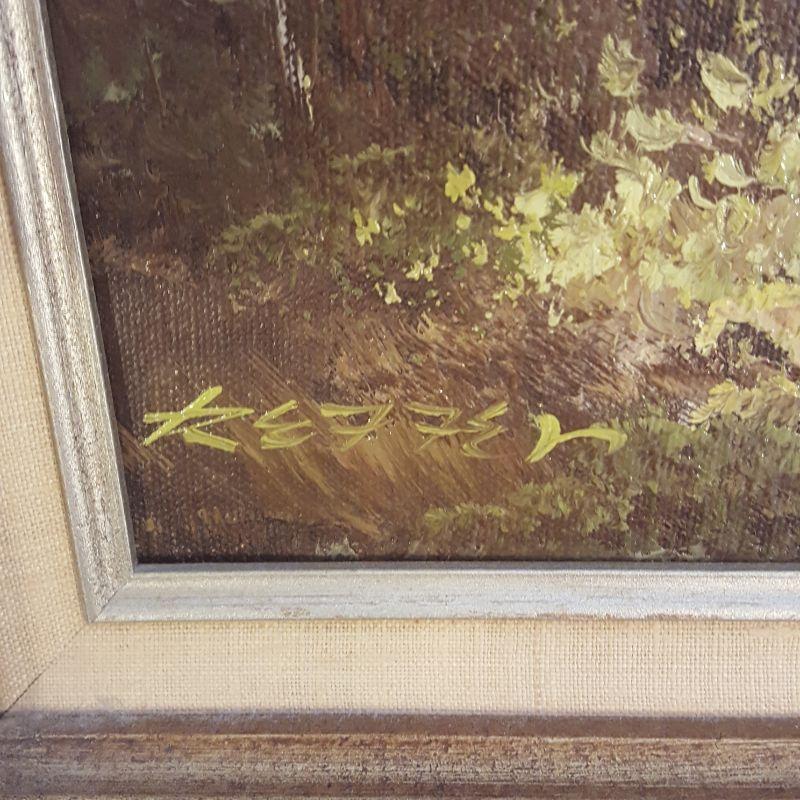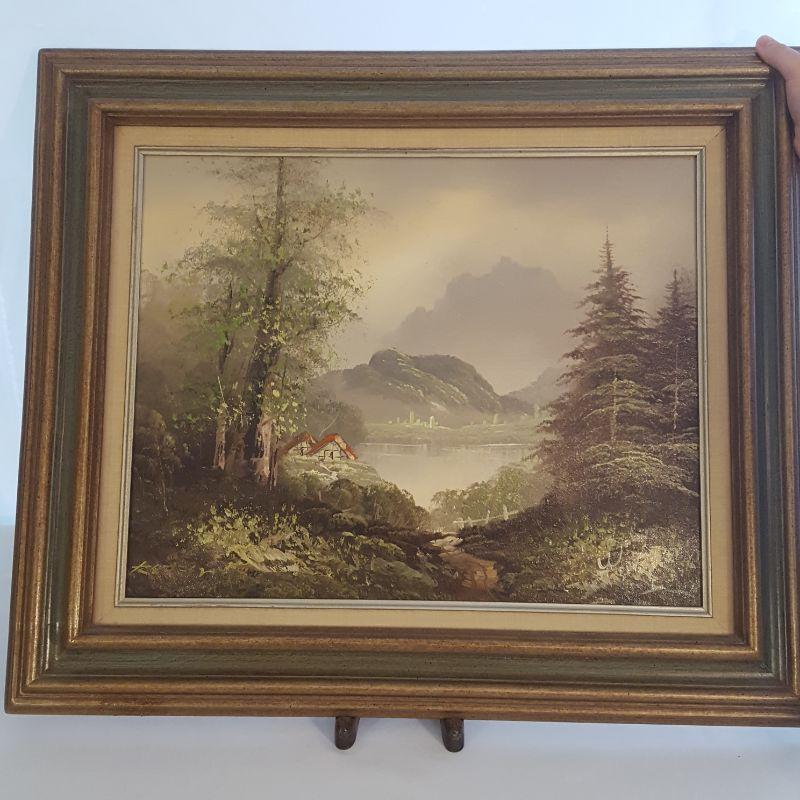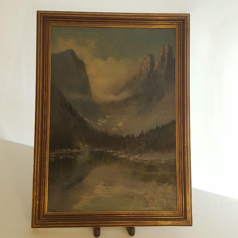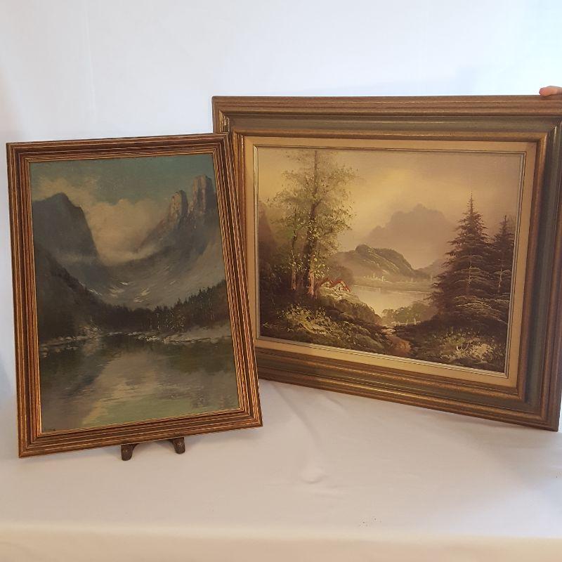 These two serene mountain scenes can only add to a beautiful decor. The larger frame measures approximately 27 x 24inches. Both pictures are signed by the artists, but are hard to decipher the names.