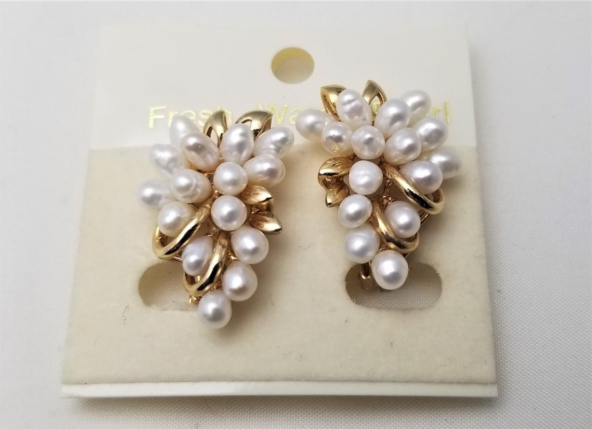 Two piece lot - 5-strand natural freshwater pearl necklace with 14kt (marked) gold clasp - 18" long. You also get a pair of very nice clip earrings- cascading fresh water pearls in a gold-tone setting - new on card. Earrings are 1 inch long.