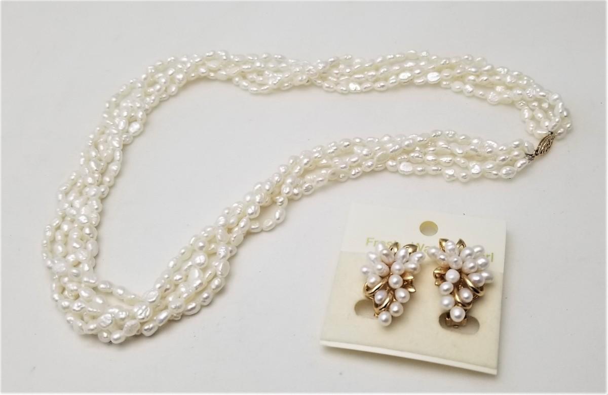 Lot #53  Fresh Water Pearl Necklace (14kt Gold Clasp) & Freshwater pearl earrings
