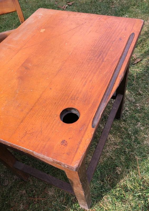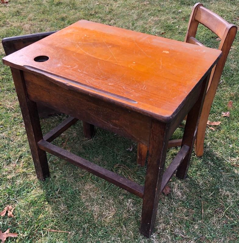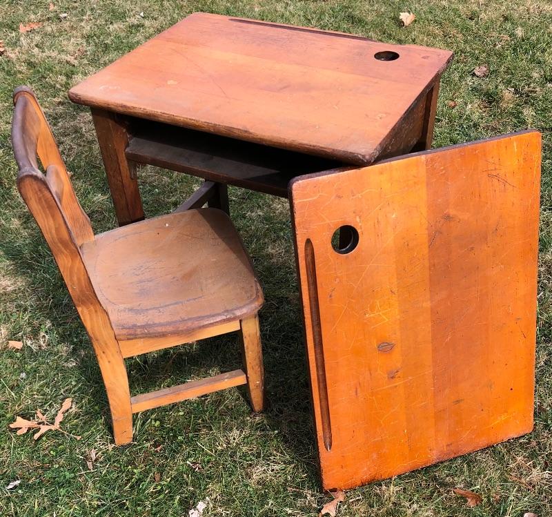 Antique Wooden School Desk, Chair & extra desktop. Desk 24” L x 18” W x 25” H. Chair 14-1/2” L x 13-1/2” W x 28” H. Please see all pictures for condition. Thank you for looking and have fun bidding