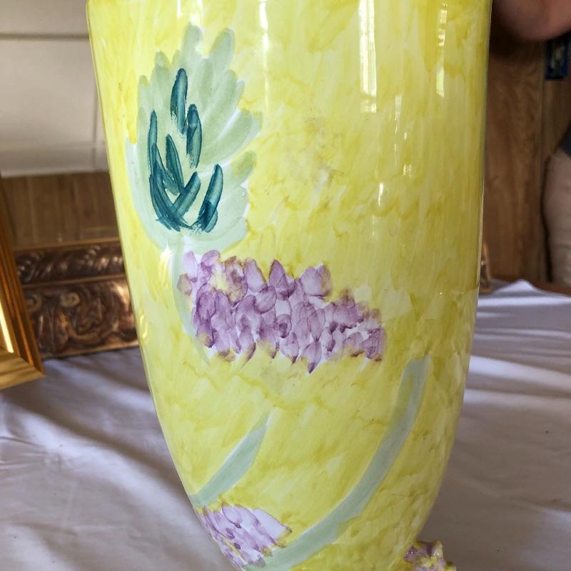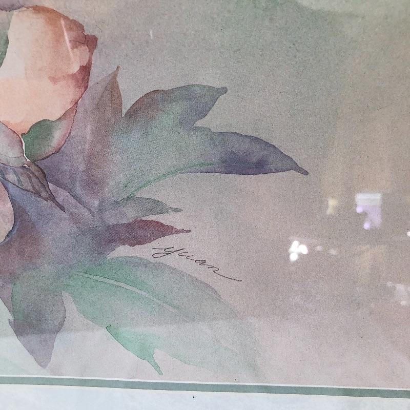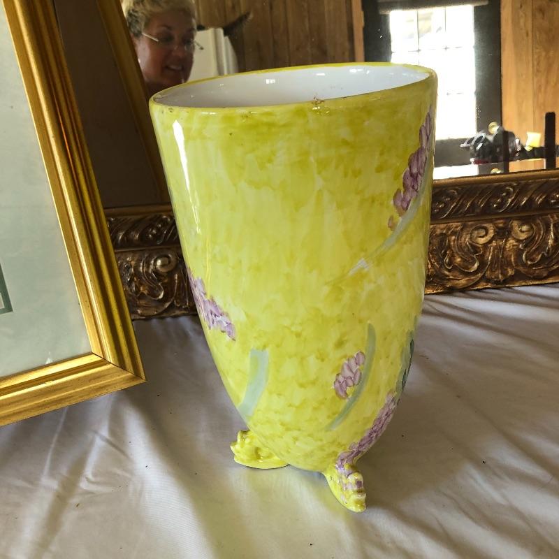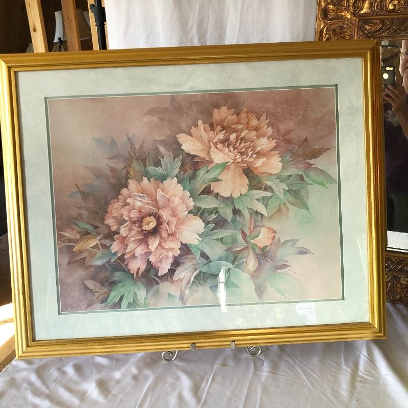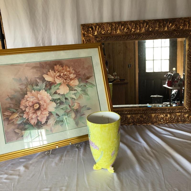 Brighten up your house with a mirror and some flowers! The gold framed beveled mirror can be hung horizontally or vertical (see pictures); dimensions 34”x 30”. Keep the beauty of spring inside your home with the floral print by Yaun and yellow floral vase with signature. Floral print measures 31”x 25” and vase measures 7” x 12”. Local pick up only.