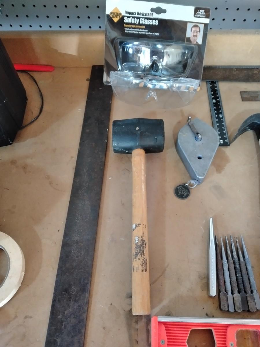 LEVEL, TIN SNIPS, STUD FINDER, RUBBER MALLET, CHALK STRING, SAFTY GLASSES, AND MORE.