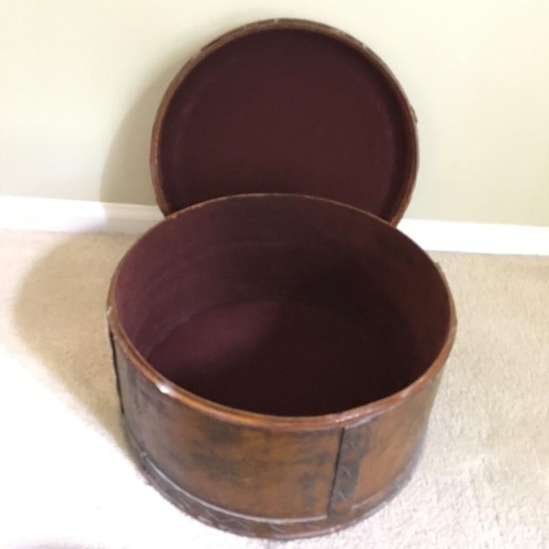 Pair of hat boxes with maroon lining. Boxes are newer made to look old and seem to be made of plastic.