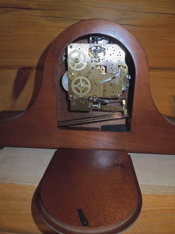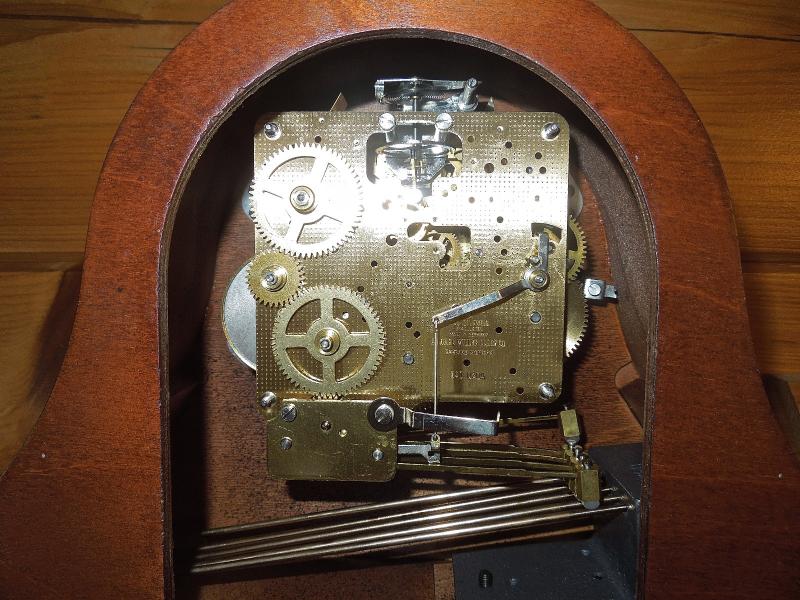 Wood case Model 612-439. Features Westminster 5-bar chime, on-the-hour strike and 16 chime, quarter-hour progressive 4-8-12 chime and 8-day wind. Face of clock is 5.25" in diameter with half-inch Arabic numerals housed behind a glass hinged door with brass outer ring. Original key included. Made in W. Germany. No scratches or damage.
