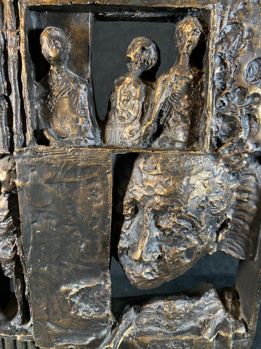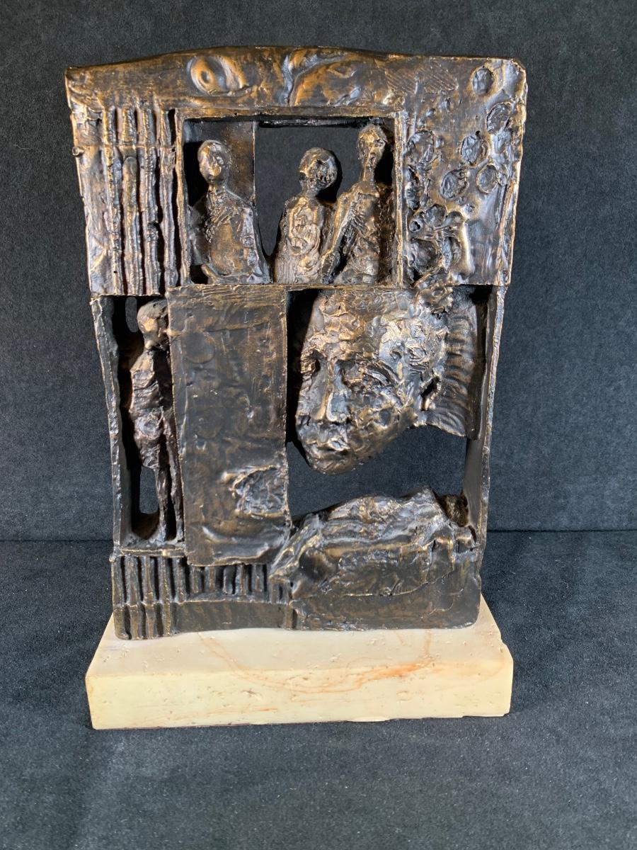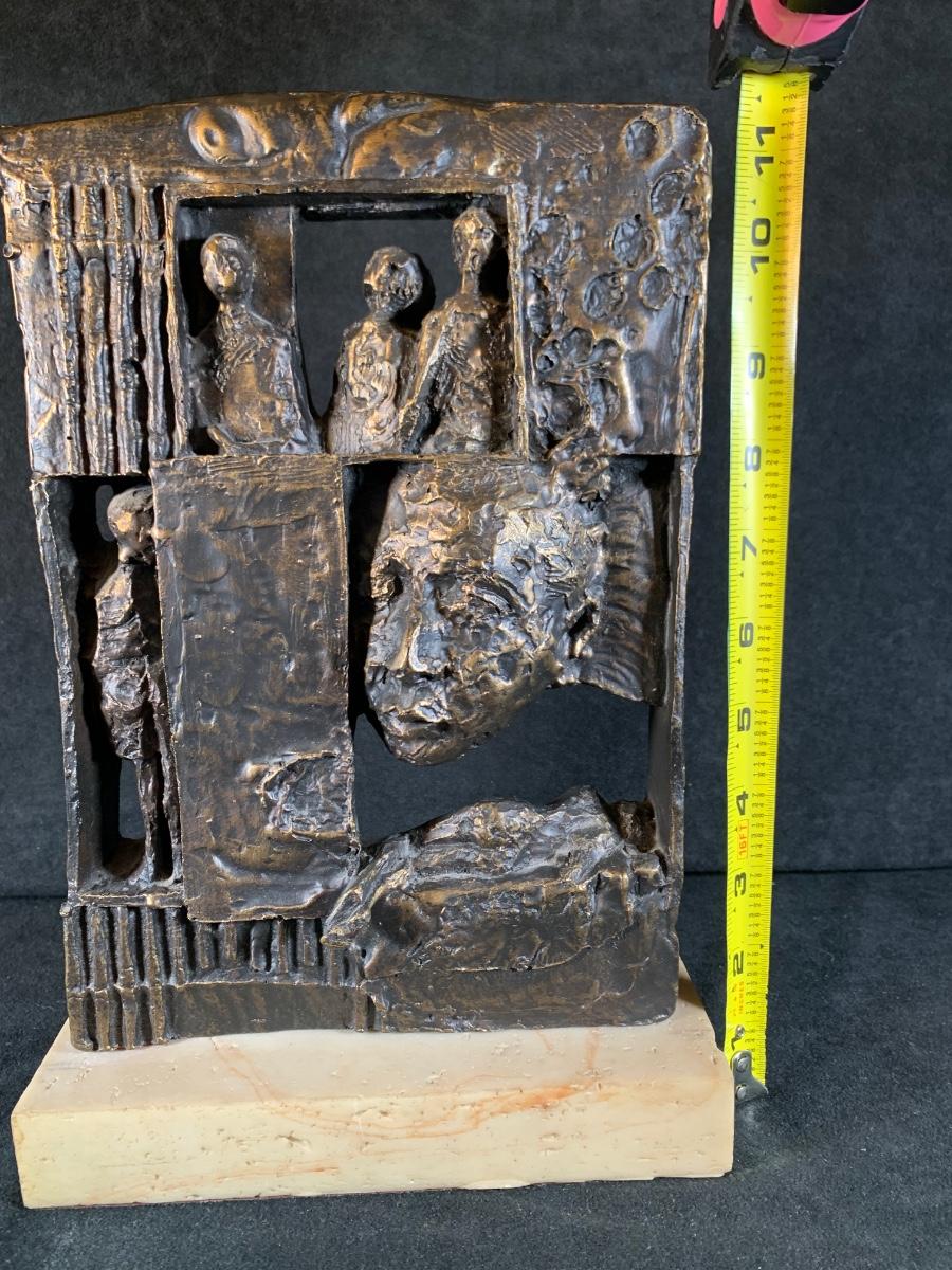 Sculpture features a face and bodies. Sculpture is 11 1/2" H
