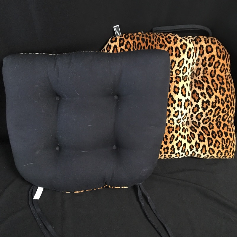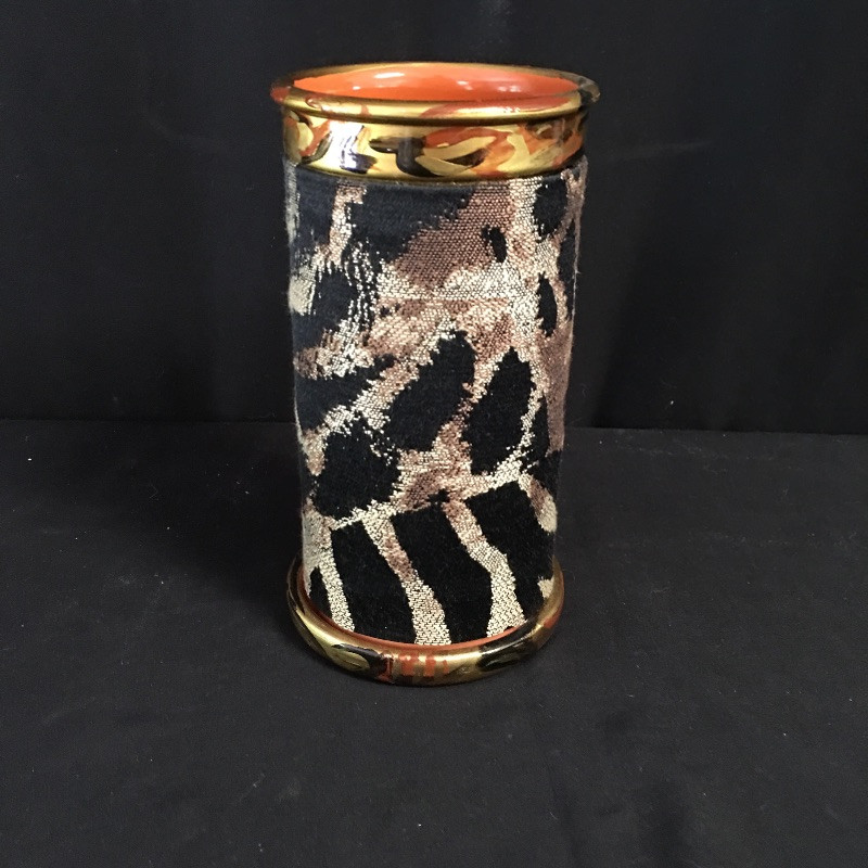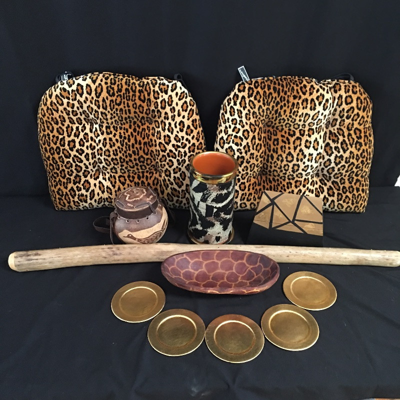 Be the king or the queen of the jungle with this eclectic collection. Lot includes a unique wooden bowl, a delightfully decorated gourd with strap, rain stick musical instrument, signed pottery wine chiller, pair of leopard look chair cushions and more. Rain stick measures 40” long. Shipping Available.