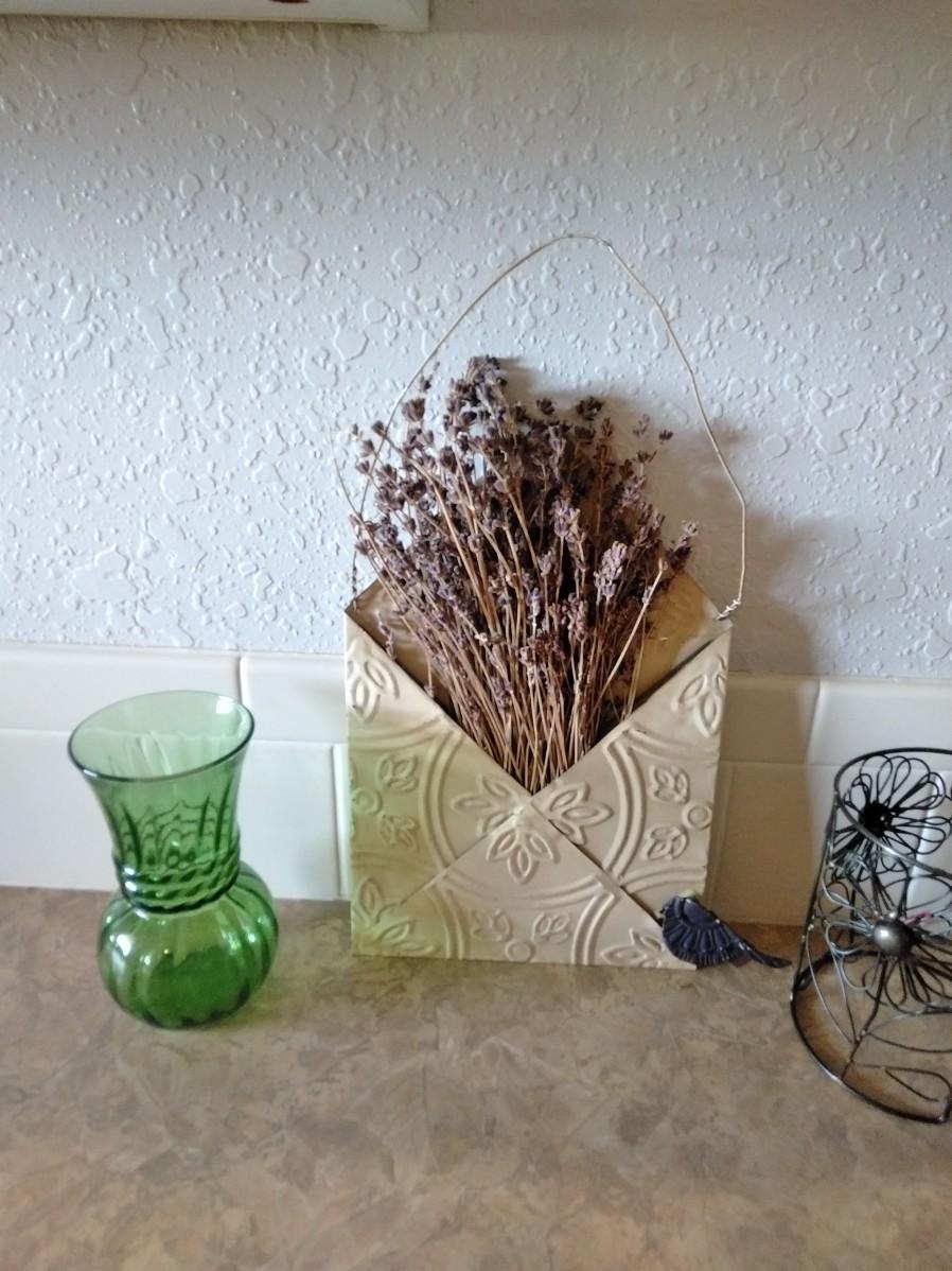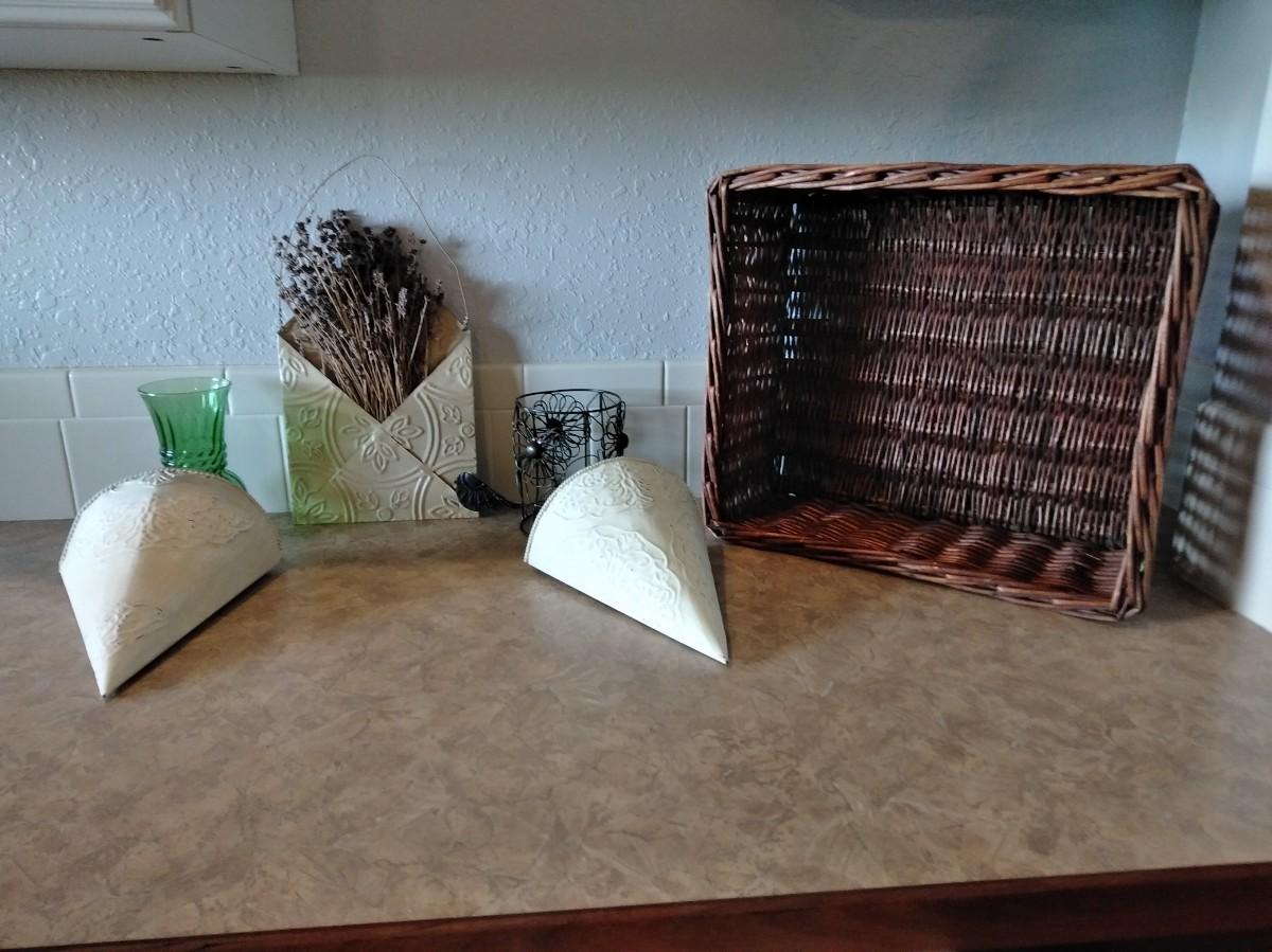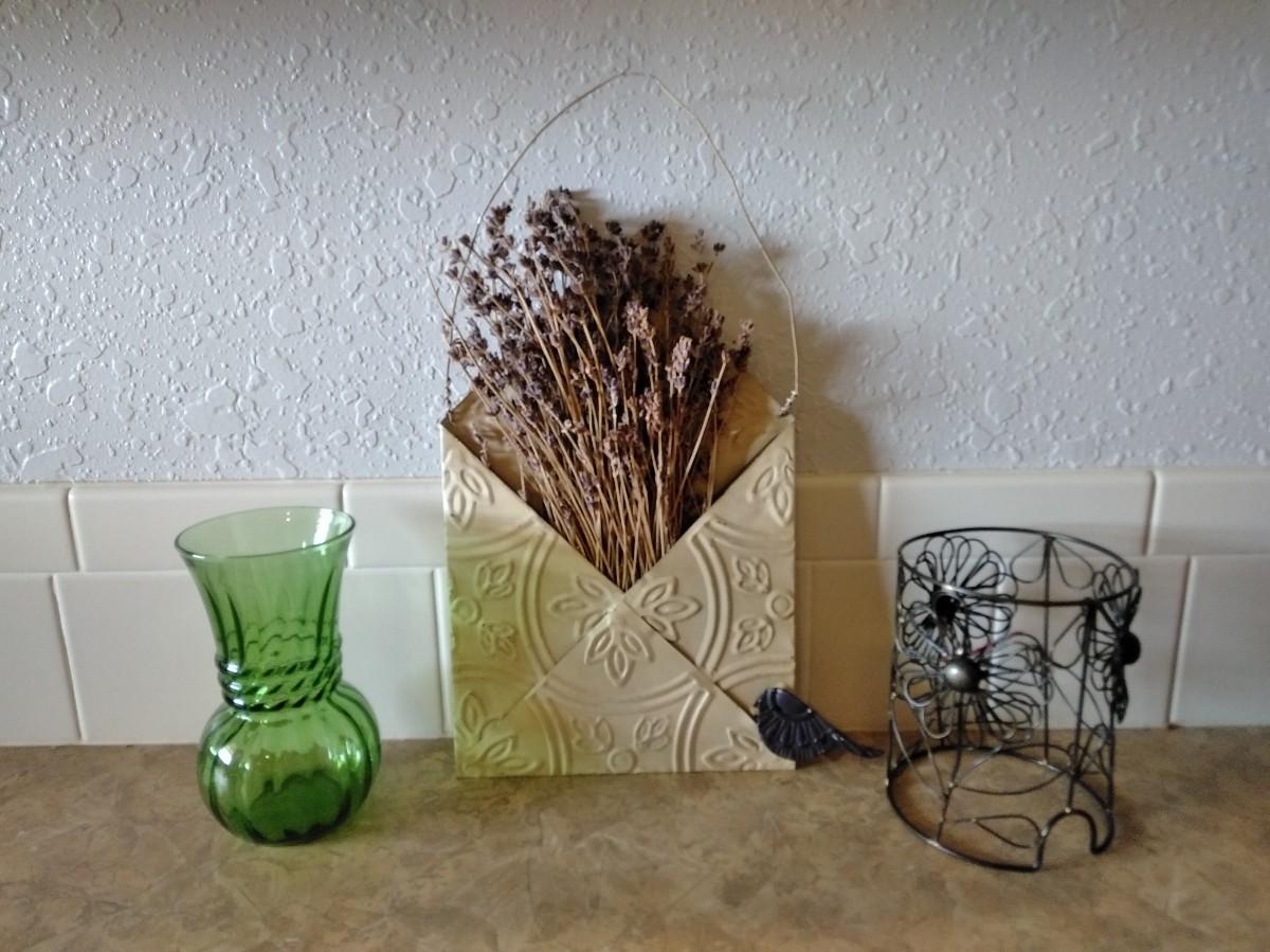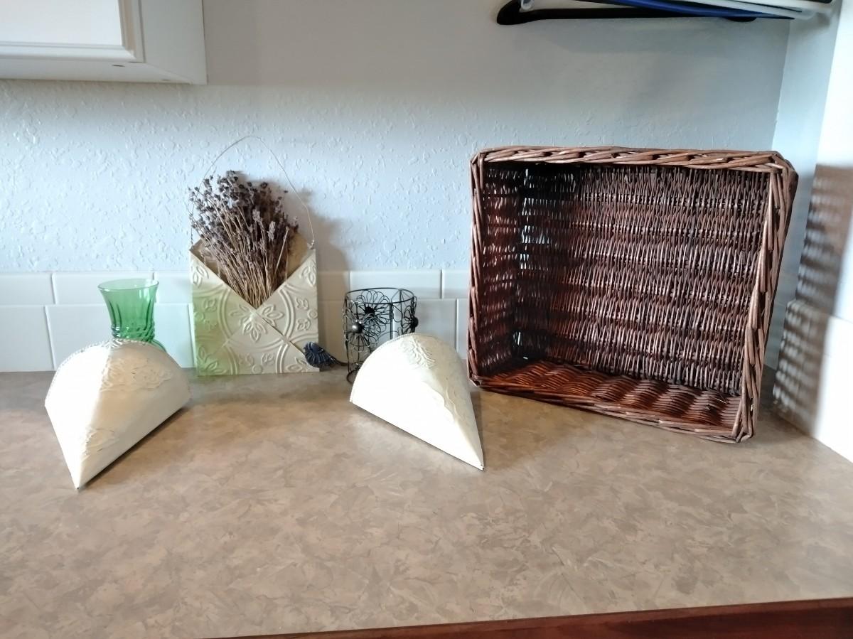 THREE HANGING METAL WALL POCKETS, GREEN GLASS VASE, LARGE BASKET, AND A CANDLE COVER
