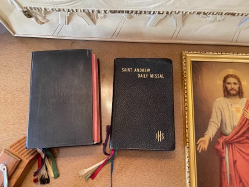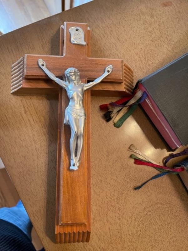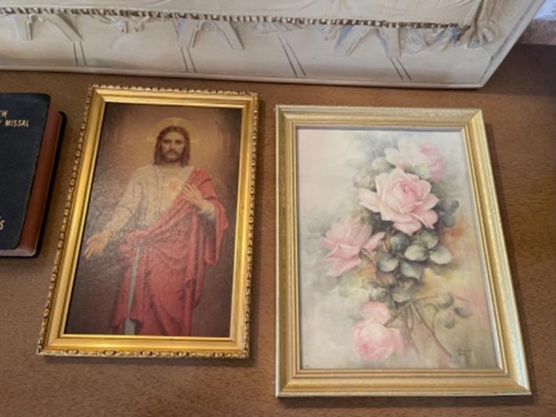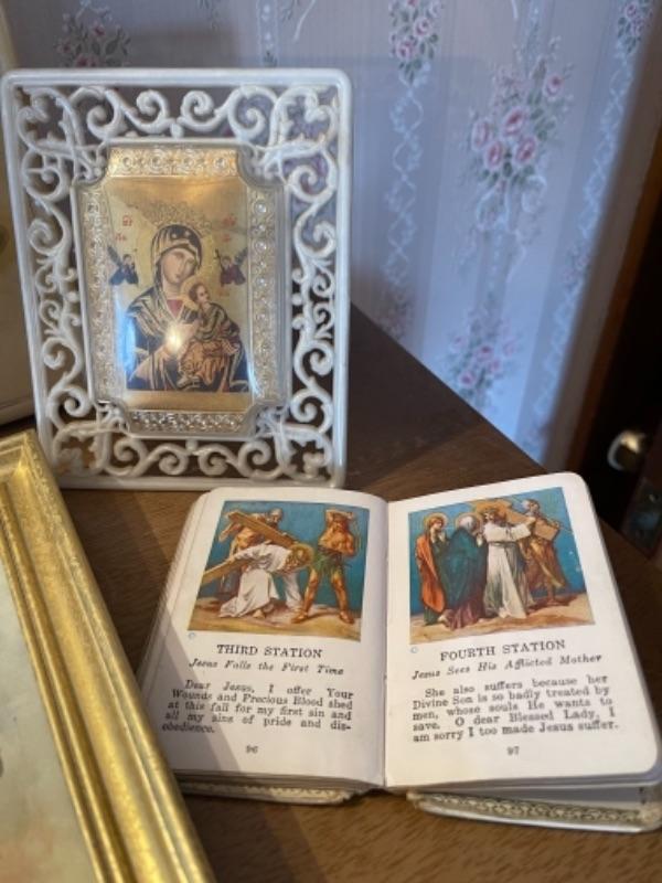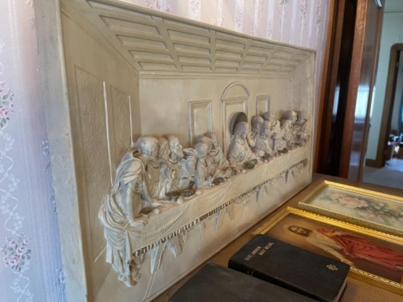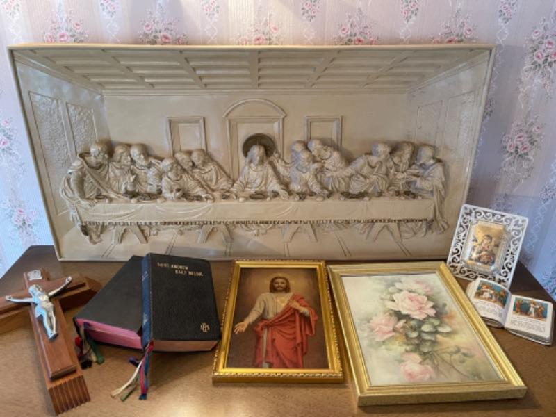 Lot 53. Lot of religious articles and plaster Last Supper wall hanging--$35