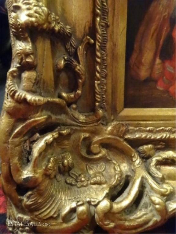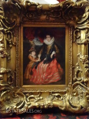 LOT 53: OIL ON BOARD PAINTING, ENGLISH NOBLE WOMAN AND CHILD, UNSIGNED, IN ORNATE HEAVY GILT WOOD FRAME, FRAMES SIZE 28.5"H X 23.5"W, SKU127.14