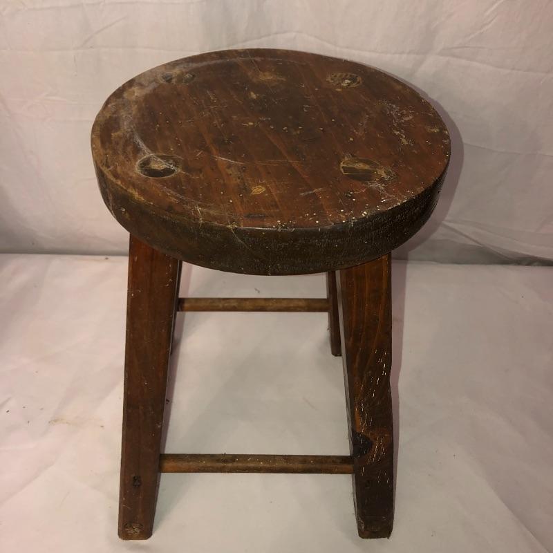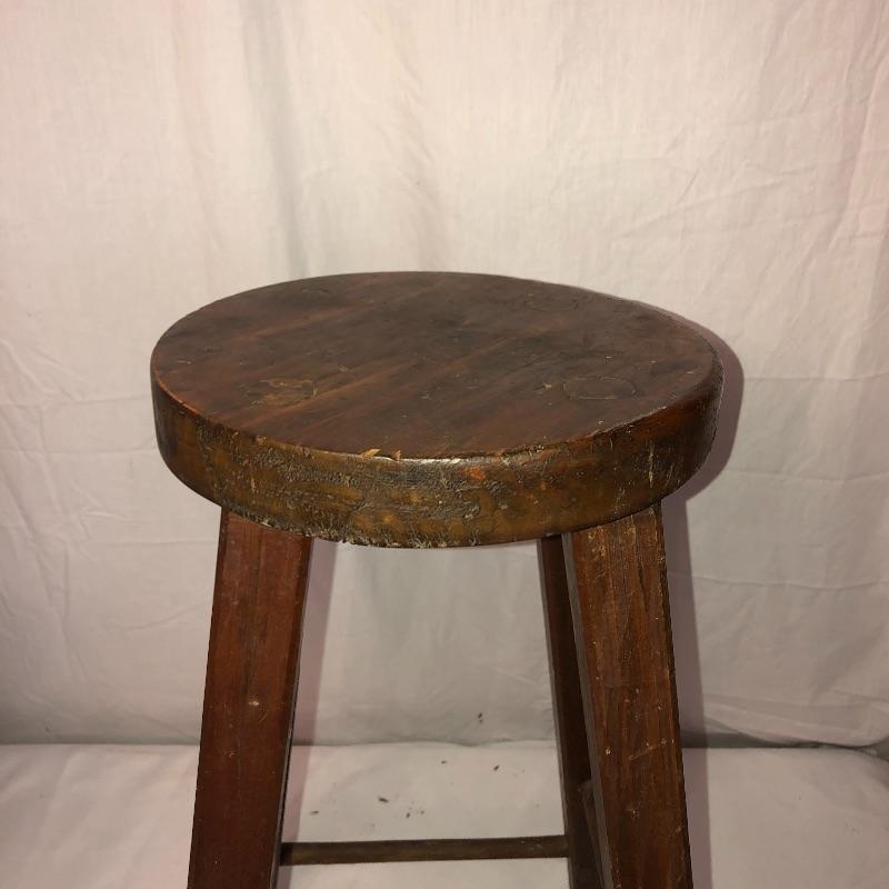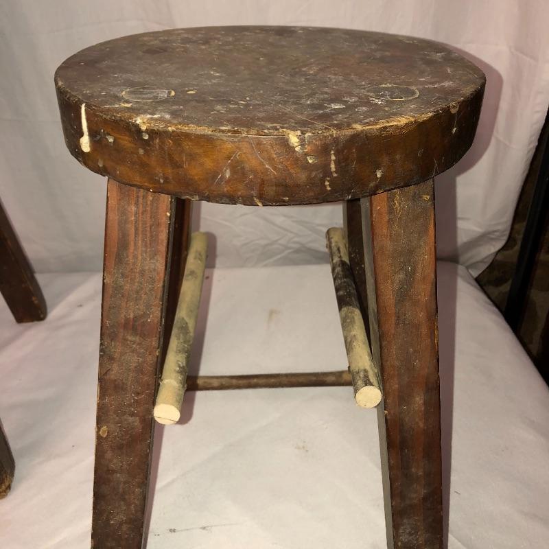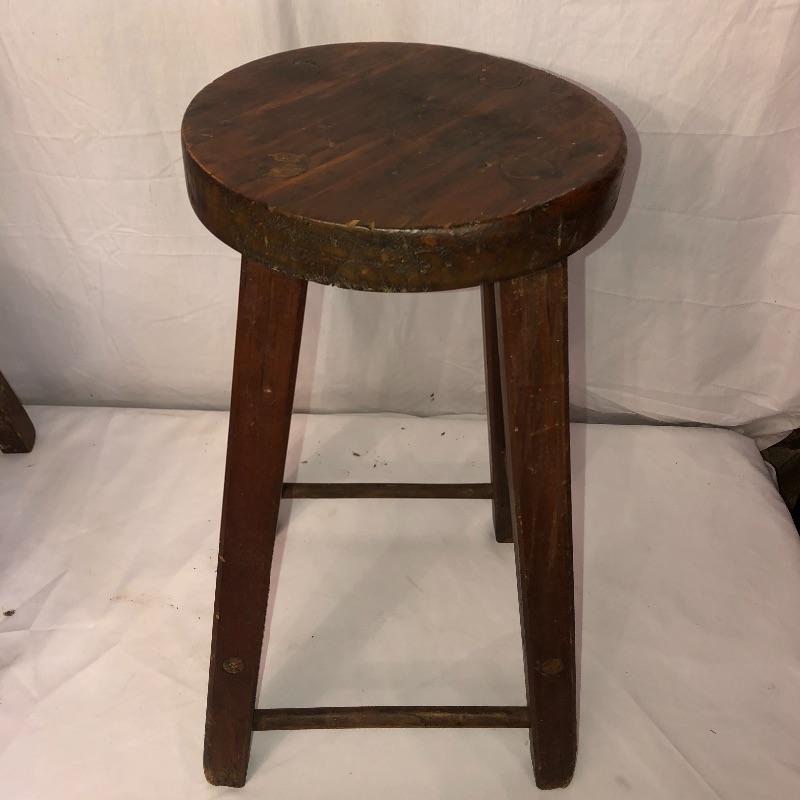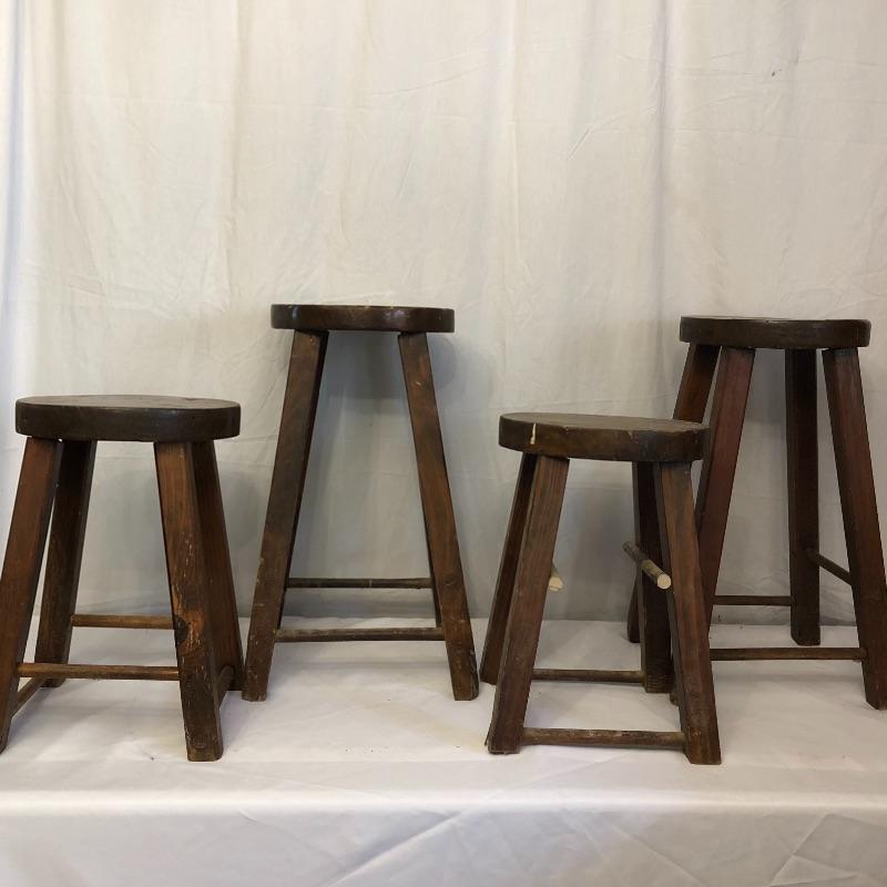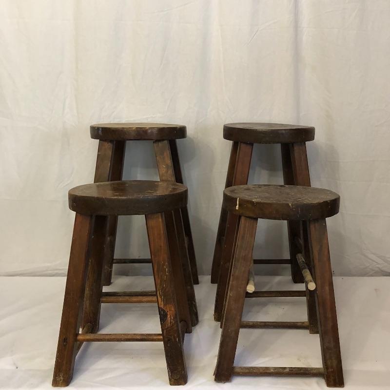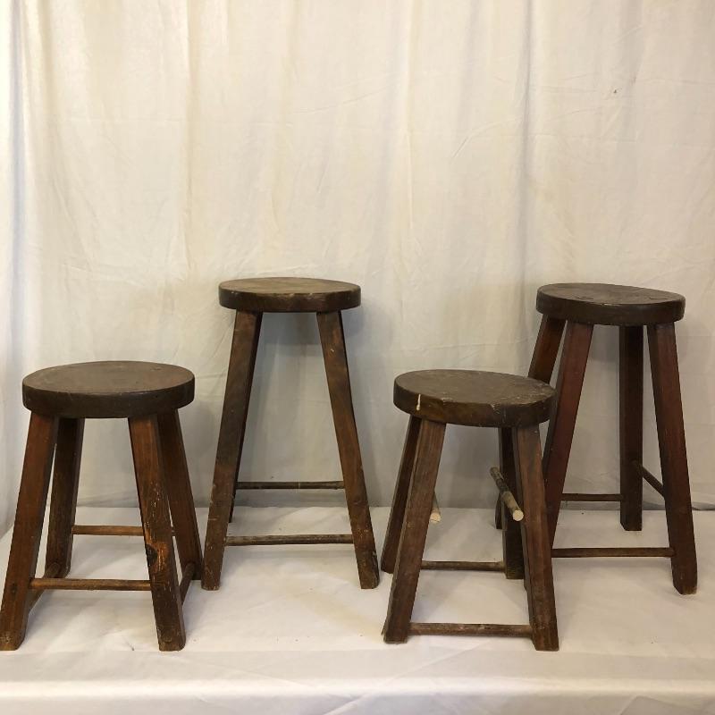 Four rustic stools in two different sizes, could use a wipe down and polish to bring the dark wood back to life. The two short stools are 18” tall and the two tall stools are 23.5” tall. The diameter of all four stool tops is approximately 11.5”.