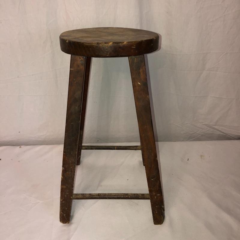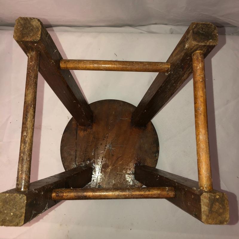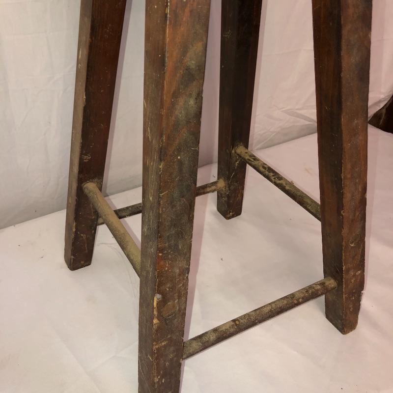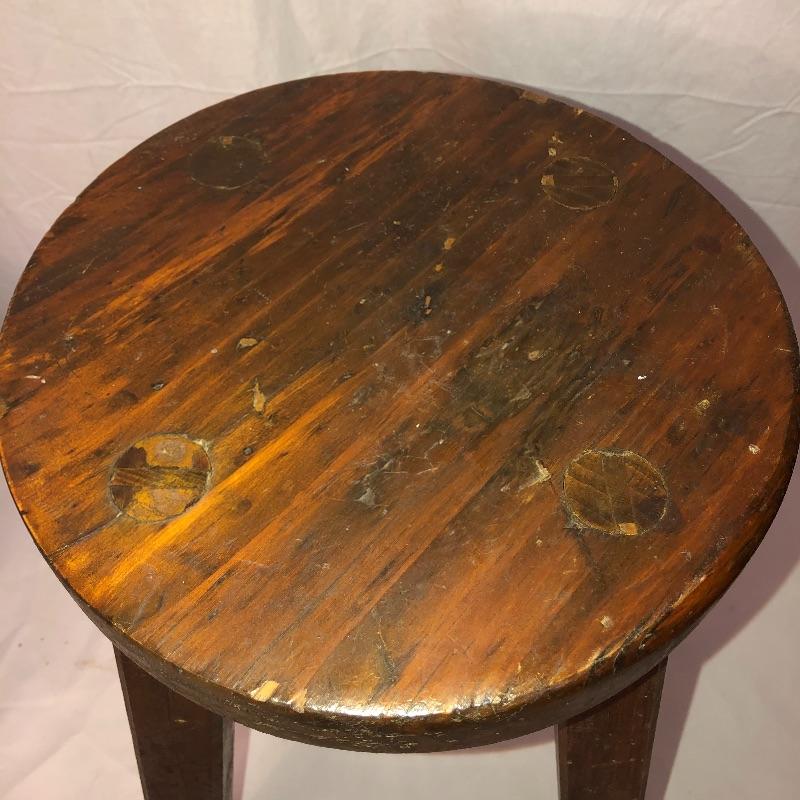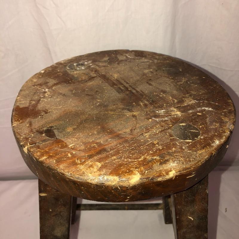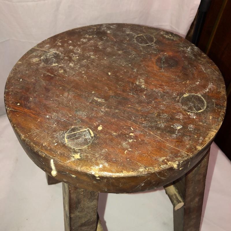 Four rustic stools in two different sizes, could use a wipe down and polish to bring the dark wood back to life. The two short stools are 18” tall and the two tall stools are 23.5” tall. The diameter of all four stool tops is approximately 11.5”.
