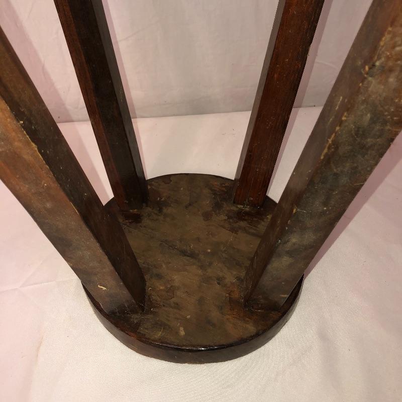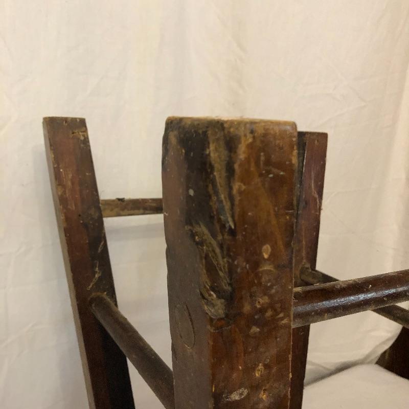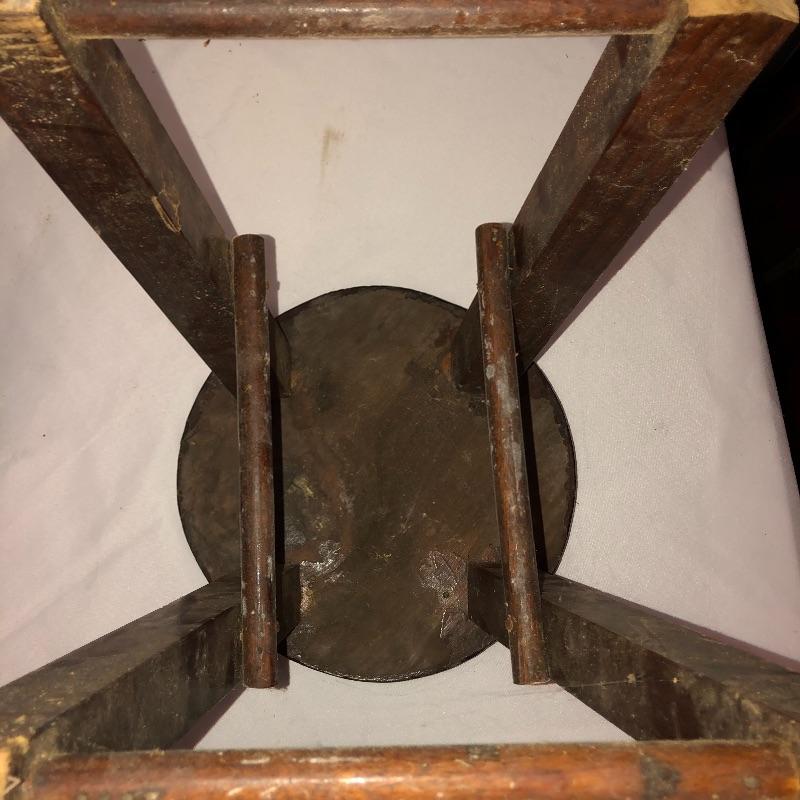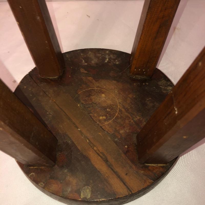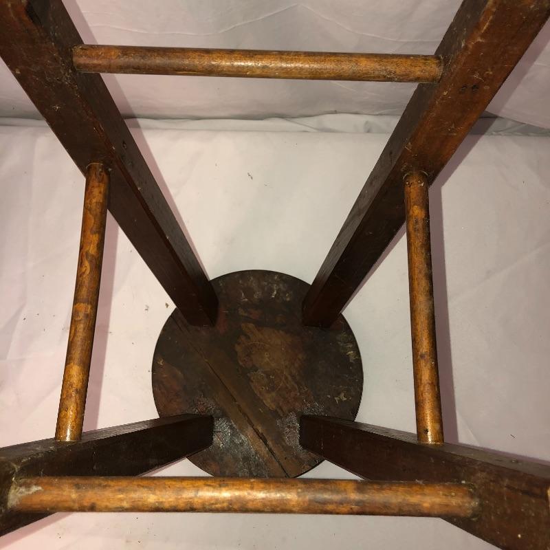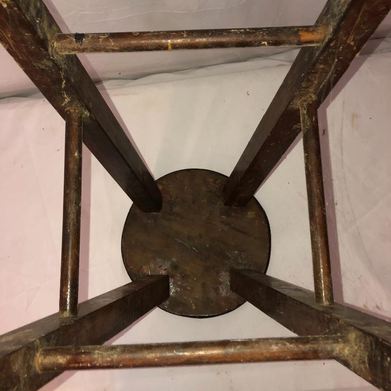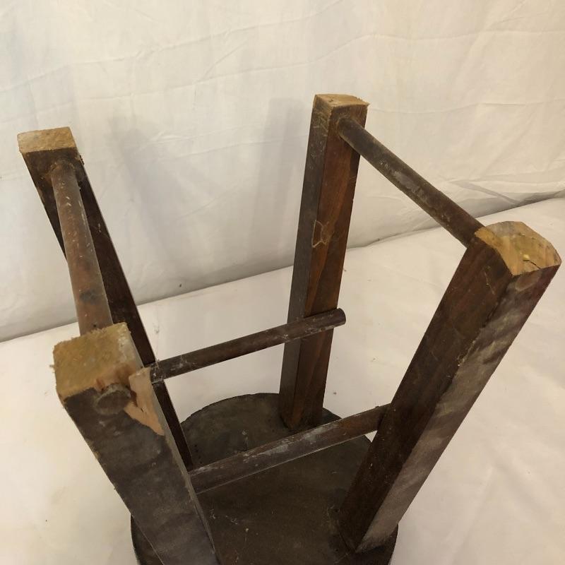 Four rustic stools in two different sizes, could use a wipe down and polish to bring the dark wood back to life. The two short stools are 18” tall and the two tall stools are 23.5” tall. The diameter of all four stool tops is approximately 11.5”.